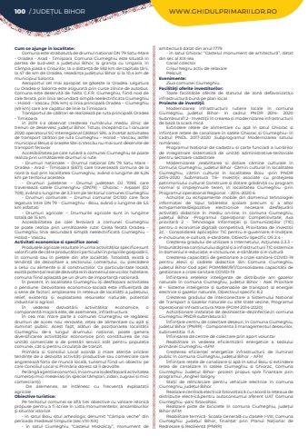 100 / JUDE%u021aUL BIHOR WWW.GHIDULPRIMARIILOR.ROCum se ajunge in localitate:Comuna este strabatut%u0103%u00a0de drumul na%u021bional DN 79 Satu-Mare - Oradea - Arad - Timi%u0219oara. Comuna Ciumeghiu este situat%u0103%u00a0%u00een partea de sud-vest a jude%u021bului Bihor, la grani%u021ba cu Ungaria, %u00een C%u00e2mpia joas%u0103%u00a0a Cri%u0219urilor, la o distan%u021b%u0103%u00a0de 592 km de capitala %u021b%u0103rii, la 47 de km de Oradea, re%u0219edin%u021ba jude%u021bului Bihor %u0219i la 10,4 km de municipiul Salonta.Aeroportul cel mai apropiat se g%u0103se%u0219te la Oradea. Legatura cu Oradea %u0219i Salonta este asigurat%u0103%u00a0prin curse zilnice de autobus. Comuna este deservit%u0103%u00a0de halta C.F.R. Ciumeghiu, fiind nod de cale ferat%u0103, prin linia secundar%u0103%u00a0simpl%u0103%u00a0neelectrificata Ciumeghiu %u2013 Holod %u2013 Vascau (106 km) %u0219i linia principal%u0103%u00a0Oradea %u2013 Ciumeghiu (49 km) care are cap%u0103tul de linie la Timi%u0219oara.Transportul de c%u0103l%u0103tori se realizeaz%u0103%u00a0pe ruta principal%u0103%u00a0Oradea - Timi%u0219oara.%u00een 2019 s-a observat cre%u0219terea num%u0103rului mediu zilnic de trenuri ce deservesc jude%u021bul Bihor. Totu%u0219i, %u00eencep%u00e2nd cu 1 ianuarie 2020 operatorul SC Interregional C%u0103l%u0103tori SRL a %u00eencetat activitatea de transport c%u0103l%u0103tori pe ruta Ciumeghiu %u2013 Holod %u2013 Vascau, astfel municipiul Beiu%u0219%u00a0%u0219i ora%u0219ele Stei %u0219i Vasc%u0103u nu mai sunt deservite de transport feroviarAccesibilitatea pe cale rutier%u0103%u00a0a comunei Ciumeghiu se poate realiza prin urm%u0103toarele drumuri %u0219i rute:- Drumuri na%u021bionale: %u2212 Drumul na%u021bional DN 79 Satu Mare - Oradea - Arad %u2013 Timi%u0219oara (E671) care traverseaz%u0103%u00a0comuna de la nord la sud prin localitatea Ciumeghiu, av%u00e2nd o lungime de 6,26 km pe teritoriul acesteia-%u00a0 Drumuri jude%u021bene: %u2212 Drumul jude%u021bean DJ 709E care traverseaz%u0103%u00a0 satele Ciumenghiu (DN79) - Ghiorac - Arpa%u0219el (DJ 709), av%u00e2nd o lungime de 3,3 km pe teritoriul comunei Ciumeghiu-%u00a0 Drumuri comunale: %u2212 Drumul comunal DC100 care face legatura %u00eentre DN 79 - Ciumeghiu - Boiu, av%u00e2nd o lungime de 5,5 km asfalta%u021bi-%u00a0 Drumuri agricole: %u2212 Drumurile agricole sunt %u00een lungime total%u0103%u00a0de 15 km.Accesibilitatea pe cale feroviar%u0103%u00a0 a comunei Ciumeghiu se poate realiza prin urm%u0103toarele rute: Calea ferat%u0103%u00a0 Oradea %u2013 Ciumeghiu linia secundar%u0103%u00a0 simpl%u0103%u00a0 neelectrificat%u0103%u00a0 Ciumeghiu %u2013 Holod %u2013 VascauActivitati economice si specifice zonei:Produsele agricole rezultate %u00een urma activit%u0103%u021bilor specifice sunt valorificate de c%u0103tre produc%u0103torii particulari %u00een propriile gospod%u0103rii, %u00een comun%u0103%u00a0 sau %u00een pie%u021bele din alte localit%u0103%u021bi. Totodat%u0103, exist%u0103 o tendin%u021b%u0103%u00a0 de dezvoltare a sectorului comer%u021bului, cu prec%u0103dere a celui cu alimente %u0219i al construc%u021biilor. Ca particularitate local%u0103, exist%u0103%u00a0poten%u021bial real de dezvoltare %u00een domeniul serviciilor hoteliere, comuna fiind aplasat%u0103%u00a0pe un drum de importan%u021b%u0103%u00a0na%u021bional%u0103.%u00cen prezent, %u00een localitatea Ciumeghiu %u00ee%u0219i desf%u0103%u0219oara activitatea o pensiune. Dezvoltarea economico-social%u0103%u00a0 este influen%u021bat%u0103%u00a0 de o serie de factori: amplasarea %u00een re%u021beaua de locali%u0103%u021bti a jude%u021bului, relief, existen%u021ba %u0219i exploatarea resurselor naturale, poten%u021bial industrial %u0219i agricol.%u00cen vederea dezvolt%u0103rii activit%u0103%u021bilor economice, o component%u0103%u00a0major%u0103%u00a0este, de asemenea, infrastructura.%u00cen cea mai mare parte a comunei Ciumeghiu se reg%u0103sesc drumuri de acces nou renovate, re%u021bea de alimentare cu ap%u0103%u00a0 %u0219i iluminat public. Acest fapt, al%u0103turi de pozi%u021bionarea localit%u0103%u021bii Ciumeghiu de-a lungul drumului na%u021bional, poate genera diversificarea activit%u0103%u021bilor economice prin constituirea de noi unit%u0103%u021bi comerciale %u0219i de prest%u0103ri servicii at%u00e2t pentru popula%u021bia comunei, c%u00e2t %u0219i pentru circula%u021bia de tranzit.Prim%u0103ria %u0219i Consiliul Local acord%u0103%u00a0 o mare aten%u021bie oric%u0103rei tendin%u021be de a dezvolta activit%u0103%u021bi productive sau comerciale care angreneaz%u0103%u00a0for%u021ba de munc%u0103%u00a0local%u0103, turismul fiind un obiectiv pe care Consiliul Local %u0219i Prim%u0103ria doresc s%u0103%u00a0%u00eel dezvolte.Pe l%u00e2ng%u0103%u00a0agen%u021bii economici, %u00een comuna %u00ee%u0219i desf%u0103%u0219oar%u0103%u00a0activitatea numero%u0219i mici meseria%u0219i (%u00een special t%u00e2mplari, zidari, zugravi %u0219i mici comercian%u021bi)De asemenea, se %u00eent%u00e2lnesc cu frecven%u021b%u0103%u00a0 exploata%u021bii agricoleObiective turistice:Pe teritoriul comunei se afl%u0103 trei obiective cu valoare istoric%u0103 propuse pentru a fi scrise %u00een Lista monumentelor, ansamblurilor %u015fi siturilor istorice-%u00a0%u00een satul Boiu situl arheologic denumit %u201cC%u00e2mpia veche%u201d din perioada medieval timpurie (sec.VIII-XIX)-%u00a0 %u00een satul Ciumeghiu %u201cCastelul Miskolczy%u201d, monument de arhitectur%u0103 datat din anul 1779-%u00a0%u00een satul Ghiorac %u201cCastelul monument de arhitectur%u0103%u201d, datat din sec al XIX-leaCanal colectorCri%u0219ul Negru activ de relaxarePescuitEvenimente:Ziua comunei CiumeghiuFacilit%u00e3%u0163i oferite investitorilor:Toate facilit%u0103%u021bile oferite de statutul de zon%u0103%u00a0 defavorizat%u0103,o infrastructur%u0103%u00a0bun%u0103%u00a0pe plan local.Proiecte de investi%u0163ii:Modernizarea infrastructurii rutiere locale %u00een comuna Ciumeghiu, jude%u021bul Bihor- %u00een cadrul PNDR 2014- 2