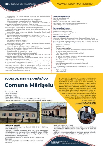 128 / JUDE%u021aUL BISTRI%u021aA-N%u0102S%u0102UD WWW.GHIDULPRIMARIILOR.ROReabilitarea %u0219i modernizarea centrului de perfec%u021bionare silvic%u0103%u00a0SilhoasaCertificarea p%u0103durilor proprietate UAT Lunca IlveiModernizarea %u0219i dotarea Pepinierei silvice SilhoasaAchizi%u021bionarea unui teren %u00een zona central%u0103%u00a0 a localit%u0103%u021bii %u0219i amenajarea unui parc de recreere %u0219i agreementModernizarea tuturor %u0219an%u021burilor , rigolelor %u0219i pode%u021belor aferente at%u00e2t drumurilor comunale c%u00e2t %u0219i str%u0103zilor de interes localAmenajarea %u0219i pietruirea tuturor drumurilor agricole de pe raza UAT Lunca ILveiAmenajrea unui centru de b%u0103tr%u00e2ni, %u00een spa%u021biul fostei %u0219coli generale nr. 3 UrsoaiaFinalizarea moderniz%u0103rii sistemului de iluminat publicModernizarea podurilor de pe cursul R%u00e2ului Ilva, din zona str. Liliacului %u0219i str. FlorilorConstruirea casei de c%u0103s%u0103toriiConstruirea muzeului satuluiExtinerea re%u021belei de ap%u0103%u00a0 %u2013 canal , pe zona str%u0103zilor r%u0103mase f%u0103r%u0103%u00a0instala%u021bii de acest genAmenajare curs ap%u0103%u00a0Valea Calului %u0219i BolovanulPietruire %u0219i reprofilare drumuri agricole: Dl. Sasului, Poiana lui Cozonac, Obcina, Dl. Frau, Dl. PrajReabilitare DC 44 Lunca Ilvei %u2013 %u0218an%u021bModernizare str%u0103zi %u00een localitatea Lunca IlveiSta%u021bii de re%u00eenc%u0103rcare pentru vehicule electrice %u00een comuna Lunca Ilvei, jude%u021bul Bistri%u021ba %u2013 N%u0103s%u0103udReabilitare, modernizare %u0219i dotare Dispensar Uman, comuna Lunca Ilvei, jude%u021bul Bistri%u021ba %u2013N%u0103s%u0103udReabilitarea, modernizarea, extinderea %u0219i dotarea Gr%u0103dini%u021bei nr. 1 Lunca Ilvei, jude%u021bul Bistri%u021ba %u2013 N%u0103s%u0103udModernizarea unit%u0103%u021bii de producere a energiei termice din biomas%u0103%u00a0%u0219i realizarea re%u021belei de distribu%u021bie a energiei termice din comuna Lunca Ilvei , jude%u021bul Bistri%u021ba %u2013 N%u0103s%u0103udAmenajarea ap%u0103r%u0103rii de maluri pe Valea Ursoaia comuna Lunca Ilvei, jude%u021bul Bistri%u021ba %u2013 N%u0103s%u0103udCOMUNA M%u0102RI%u015eELUAdres%u0103: Ioan Cotoc nr.1Cod po%u0219tal: 427150Telefon: 0263-272710; Fax: 0263-272585; Adresa de e-mail: primaria.mariselu@gmail.comURL: http://www.comunamariselu.roPersoane din primarie:Primar: Horea-C%u0103lin%u00a0Petru%u0163%u00a0Viceprimar: Alexandru PopSecretar General: Domni%u0163a%u00a0Z%u0103voianContabil: Alina Elena CiraSate %u00een administra%u021bie:M%u0103ri%u0219elu, M%u0103gurele, S%u00e2ntioana, B%u00e2rla, Domne%u015fti, Jeica, Ne%u0163eniSuprafa%u021ba:%u00a0 7754 ha; Intravilan:%u00a0 433,40 ha; Extravilan:%u00a0 7320 ha; Popula%u021bia:%u00a02329; Gospod%u0103rii:%u00a0947; Locuin%u021be:%u00a0872; Gr%u0103dini%u021be:%u00a03; %u0218coli:%u00a03; Activitati economice si specifice zonei:Cre%u0219terea animalelorAgriculturaFirme reprezentative:SC Petru%u021b Microferma Zootehnic%u0103 (cre%u0219terea animalelor)SC Agrostar SRL (cultur%u0103 mare)PFA Flore Aurelian (cre%u0219terea animalelor)Produc%u0103tori locali:SC Petru%u021b Microferma Zootehnic%u0103 (cre%u0219terea animalelor)SC Agrostar SRL (cultur%u0103 mare)PFA Flore Aurelian (cre%u0219terea animalelor)Me%u0219te%u0219uguri:Activit%u0103%u021bi de sculptur%u0103 %u00een lemn, piatr%u0103 %u0219i pictur%u0103Produse locale:Lapte pentru procesare, cereale, miei pentru sacrificat%u00a0Obiective turistice:R%u00e2pa cu p%u0103pu%u015fiMasivul cu sare