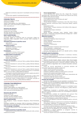 WWW.GHIDULPRIMARIILOR.RO JUDE%u021aUL BISTRI%u021aA-N%u0102S%u0102UD / 137Re%u0163ea de canalizare %u0219i epurare %u00een localita%u0163ile Archiud, Ocni%u0163a %u0219i PinticuConstruc%u0163ie capel%u0103 %u00een localitatea Budurleni COMUNA TELCIUAdres%u0103: Principal%u0103, nr. 744 BCod po%u0219tal: 427355Telefon: 0263-369004; Fax: 0263-369004; Adresa de e-mail: primariatelciu_bn@yahoo.comURL: www.telciu.roPersoane din primarie:Primar: Sever Mure%u015fanViceprimar: Ioan Cordo%u0219Secretar General:%u00a0Ana Maria Cordo%u015fContabil: Marius Iulian DanciuSate %u00een administra%u021bie:Telciu, Telci%u015for, Fiad, BichigiuSuprafa%u021ba:%u00a0 28530 ha; Intravilan:%u00a0 870 ha; Extravilan:%u00a0 27660 ha; Popula%u021bia:%u00a0 5798; Gospod%u0103rii:%u00a0 2073; Locuin%u021be:%u00a0 1807; Gr%u0103dini%u021be:%u00a0 7; %u0218coli:%u00a04; Licee:%u00a01; Activitati economice si specifice zonei:Agricultur%u0103Cre%u015fterea animalelorObiective turistice:M%u00e2n%u0103stirea %u201cBuscatu-Telci%u015for%u201dM%u00e2n%u0103stirea %u201cBichigiu%u201dPe%u015ftera %u201cZalion-T%u0103u%u015foare%u201dEvenimente:%u00cent%u00e2lnirea Fiii Satului, 23-24 augustFestivalul-concurs Ion Sabad%u00e2%u015fFacilit%u00e3%u0163i oferite investitorilor:Pensiuni agro-turisticeFabrici de cheresteaFabrici prelucrare lapteProiecte de investi%u0163ii:Drumuri forestiere %u00een comuna Telciu, jude%u021bul Bistri%u021ba N%u0103s%u0103ud, etapa a II-aDrumuri forestiere %u00een%u00a0comuna Telciu, jude%u021bul Bistri%u021ba N%u0103s%u0103ud, etapa a III-aDrumuri forestiere %u00een comuna Telciu, jude%u021bul Bistri%u021ba N%u0103s%u0103ud, etapa a IV-aDrumuri forestiere %u00een comuna Telciu, judetul Bistrita Nasaud, etapa a V-a - Constructie pentru ceremonii funerare, in localitatea Telciu, comuna Telciu, jude%u021bul Bistri%u021ba-N%u0103s%u0103udAmenajare trotuare %u0219i sisteme de colectare a apelor pluviale %u00een comuna Telciu, jude%u021bul Bistri%u021ba-N%u0103s%u0103udConstruire central%u0103 de cogenerare, pe biomas%u0103, cu ORC, re%u021bea de termoficare %u0219i conexiune la re%u021beaua electric%u0103 de MT, Telciu Construire centru multifunc%u021bional cu activit%u0103%u021bi culturale %u00een Comuna Telciu, sat Telciu, jude%u021bul Bistri%u021ba N%u0103s%u0103udCOMUNA TIHA B%u00c2RG%u0102ULUIAdres%u0103: Principal%u0103, nr. 452Cod po%u0219tal: 427360Telefon: 0263-265654; Fax: 0263-265037; Adresa de e-mail: primaria_tiha@yahoo.comURL: www.primariatihabargaului.roPersoane din primarie:Primar: Vasile %u0218utViceprimar: Vasile TodoranSecretar General: Miadela CureanContabil: Maria Paraschiva L%u0103z%u0103ru%u021bSate %u00een administra%u021bie:Tiha B%u00e2rg%u0103ului, Tureac, Mure%u015fenii B%u00e2rg%u0103ului, Piatra-F%u00e2nt%u00e2nele, CiosaSuprafa%u021ba:%u00a024233,84 ha; Intravilan:%u00a02530 ha; Extravilan:%u00a021703,84 ha; Popula%u021bia:%u00a06443; Gospod%u0103rii:%u00a03175; Locuin%u021be:%u00a02959; Gr%u0103dini%u021be:%u00a03; %u0218coli:%u00a05; Cum se ajunge in localitate:Drumul na%u021bional DN 17 care face leg%u0103tura %u00eentre Transilvania %u0219i BucovinaActivitati economice si specifice zonei:Exploatarea %u0219i prelucrarea lemnului, construc%u021bii civile, comer%u021b, cre%u0219terea animalelorFirme reprezentative:Amicii Building SRL, Delice Pan SRL, Adigal SRL, Forgavpi Company SRL, Comtrans SRL, PFA R%u00eenzis Ioan (bovine de carne), IF Galben Adina (bovine Angus)Puncte gastronomice localePunct gastronomic local %u201dLa Elena din deal%u201dRestaurante %u0219i pensiuniTihu%u021ba Retreat, Popasul Transilvania, Cota 1201, Pasul Tihu%u021ba, Popasul Boierilor, Pensiunea Miu%u021ba, Pensiunea G%u0103bi%u021ba, Cabana BraduluiProduc%u0103tori locali:R%u00eenzi%u0219 Grigore %u2013 siropuri, dulceturi, IDVI Vefarm SRL (c%u0103psuni)Produse locale:Br%u00e2nz%u0103, %u021buic%u0103, siropuri, dulce%u021buriMe%u0219te%u0219ugari:Bacea Nicolae, Burbulea Leon, Seretan Vasile, Cobu%u021b Gheorghe - mestesuguri populare %u021b%u0103r%u0103ne%u0219ti, Dologa Ioan %u2013 atelier de prelucrare a lemnuluiObiective turistice:Drumul RomanilorM%u0103n%u0103stirea %u201dNa%u0219terea Maicii Domnului%u201dPiatra F%u00e2nt%u00e2neleMuzeu %u021b%u0103r%u0103nesc %u2013Bacea NicolaeMuntele C%u0103saru Traseul Via TransilvanicaEvenimente:Hramul m%u0103n%u0103stirii %u201dNa%u0219terea Maicii Domnului%u201dPiatra F%u00e2nt%u00e2nele %u2013 8 septembrieManifest%u0103ri folclorice cu specific localConcurs interna%u021bional de sprint pe z%u0103pad%u0103%u00a0 pentru atelaje canine pe %u201dDrumul Romanilor%u201dFacilit%u00e3%u0163i oferite investitorilor:Poten%u0163ial considerabil de dezvoltare a turismului montan, poten%u021bial peisagistic deosebitCrearea, %u00eembun%u0103t%u0103%u021birea %u0219i diversificarea facilit%u0103%u021bilor %u0219i atrac%u021biilor turisticeResurse naturale bogate: p%u0103dure, p%u0103%u0219une, flor%u0103, faun%u0103 bogate, fructe de p%u0103dure (zmeura, mure, afine), ciuperci (g%u0103lbiori, ghebe, hribi)Zon%u0103 favorabil%u0103 at%u00e2t pentru cultivarea cerealelor, plantelor de nutre%u021b, cartofilor %u0219i legumelor c%u00e2t %u0219i cre%u0219terii bovinelor, ovinelor, porcinelorFor%u021b%u0103 de munc%u0103 specializat%u0103 %u00een anumite sectoare ale economiei: agricultur%u0103, comer%u021b, construc%u021biiMediu natural favorabil drume%u021biilorRe%u021bea curent electric, iluminat publicExistenta utilit%u0103%u021bilor publice %u00een marea parte a comuneiSus%u021binere din partea autorit%u0103%u021bilor localeExist%u0103%u00a0oportunit%u0103%u021bi de investi%u021bii %u00een agricultur%u0103, dezvoltarea de ferme de bovine, ovine, servicii, turismExistent%u0103 unit%u0103%u021bi de cazare %u0219i restaurantInfrastructur%u0103%u00a0rutier%u0103%u00a0modernizat%u0103%u00a0%u0219i reabilitat%u0103Proiecte de investi%u0163ii:Construire re%u021bea public%u0103 de ap%u0103 potabil%u0103 %u00een localitatea Piatra F%u00e2nt%u00e2nele, comuna Tiha B%u00e2rg%