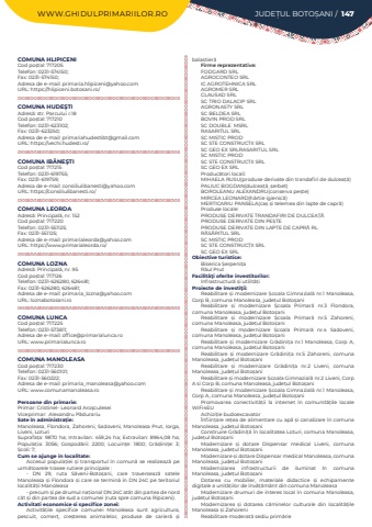 WWW.GHIDULPRIMARIILOR.RO JUDE%u021aUL BOTO%u0218ANI / 147COMUNA HLIPICENICod po%u0219tal: 717205Telefon: 0231-574150; Fax: 0231-574150; Adresa de e-mail: primaria.hlipiceni@yahoo.comURL: https://hlipiceni.botosani.ro/COMUNA HUDE%u015eTIAdres%u0103: str. Parcului r.18Cod po%u0219tal: 717210Telefon: 0231-623102; Fax: 0231-623250; Adresa de e-mail: primariahudestibt@gmail.comURL: https://vechi.hudesti.ro/COMUNA IB%u0102NE%u015eTICod po%u0219tal: 717215Telefon: 0231-619755; Fax: 0231-619759; Adresa de e-mail: consiliulibanesti@yahoo.comURL: https://consiliulibanesti.ro/COMUNA LEORDAAdres%u0103: Principal%u0103, nr. 152Cod po%u0219tal: 717220Telefon: 0231-551125; Fax: 0231-551125; Adresa de e-mail: primarialeorda@yahoo.comURL: https://www.primarialeorda.ro/COMUNA LOZNAAdres%u0103: Principal%u0103, nr. 95Cod po%u0219tal: 717126Telefon: 0231-626280, 626481; Fax: 0231-626280, 626481; Adresa de e-mail: primaria_lozna@yahoo.comURL: loznabotosani.roCOMUNA LUNCACod po%u0219tal: 717225Telefon: 0231-573811; Adresa de e-mail: office@primarialunca.roURL: www.primarialunca.roCOMUNA MANOLEASACod po%u0219tal: 717230Telefon: 0231-560101; Fax: 0231-560222; Adresa de e-mail: primaria_manoleasa@yahoo.comURL: www.comunamanoleasa.roPersoane din primarie:Primar: Cristinel-%u00a0Leonard Aro%u015fculeseiViceprimar: %u00a0Alexandru P%u0103durariu%u00a0Sate %u00een administra%u021bie:Manoleasa, Flondora, Zahoreni, Sadoveni, Manoleasa Prut, Iorga, Liveni, LoturiSuprafa%u021ba:%u00a09870 ha; Intravilan:%u00a0459,24 ha; Extravilan:%u00a08964,08 ha; Popula%u021bia:%u00a0 3056; Gospod%u0103rii:%u00a0 2200; Locuin%u021be:%u00a0 1800; Gr%u0103dini%u021be:%u00a0 3; %u0218coli:%u00a07; Cum se ajunge in localitate:Accesul popula%u021biei %u0219i transportul %u00een comun%u0103 se realizeaz%u0103 pe urm%u0103toarele trasee rutiere principale :- DN 29, ruta S%u0103veni-Boto%u0219ani, care traverseaz%u0103 satele Manoleasa %u0219i Flondora %u0219i care se termin%u0103 %u00een DN 24C pe teritoriul localit%u0103%u021bii Manoleasa- precum %u0219i pe drumul na%u021bional DN 24C at%u00e2t din partea de nord c%u00e2t %u0219i din partea de sud a comunei (ruta spre comuna Ripiceni).Activitati economice si specifice zonei:Activit%u0103%u021bile specifice comunei Manoleasa sunt agricultura, pescuit, comer%u021b, cre%u0219terea animalelor, produse de carier%u0103 %u0219i balastier%u0103Firme reprezentative:FODGARD SRLAGROCONTEO SRLIC AGROTEHNICA SRLAGROMER SRLCLAUSAD SRLSC TRIO DALACIP SRLAGRONASTY SRLSC BELDEA SRLBOVIN PROD SRLSC DOUBLE%u00a0 MSRLRASARITUL SRLSC MISTIC PRODSC STE CONSTRUCTII SRLSC GEO EX SRLRASARITUL SRLSC MISTIC PRODSC STE CONSTRUCTII SRLSC GEO EX SRLProduc%u0103tori locali:MIHAELA RUSU(produse derivate din trandafiri de dulcea%u021b%u0103)PALIUC BOGDAN(dulcea%u021b%u0103, %u0219erbet)BOROLEANU ALEXANDRU(conserva pe%u0219te)MIRCEA LEONARD(h%u00e2rtie igienic%u0103)MERTICARIU PANSELA(ca%u0219 %u0219i telemea din lapte de capr%u0103)Produse locale:PRODUSE DERIVATE TRANDAFIRI DE DULCEA%u021a%u0102PRODUSE DERIVATE DIN PE%u0218TEPRODUSE DERIVATE DIN LAPTE DE CAPR%u0102 RLR%u0102S%u0102RITUL SRLSC MISTIC PRODSC STE CONSTRUC%u021aII SRLSC GEO EX SRLObiective turistice:Biserica %u0218erpeni%u021baR%u00e2ul PrutFacilit%u00e3%u0163i oferite investitorilor:Infrastructur%u0103 %u0219i utilit%u0103%u021biProiecte de investi%u0163ii:Reabilitare %u0219i modernizare %u0218coala Gimnazial%u0103 nr.1 Manoleasa, Corp B, comuna Manoleasa, jude%u021bul Boto%u0219aniReabilitare %u0219i modernizare %u0218coala Primar%u0103 nr.3 Flondora, comuna Manoleasa, jude%u021bul Boto%u0219aniReabilitare %u0219i modernizare %u0218coala Primar%u0103 nr.5 Zahoreni, comuna Manoleasa, jude%u021bul Boto%u0219aniReabilitare %u0219i modernizare %u0218coala Primar%u0103 nr.4 Sadoveni, comuna Manoleasa, jude%u021bul Boto%u0219aniReabilitare %u0219i modernizare Gr%u0103dini%u021ba nr.1 Manoleasa, Corp A, comuna Manoleasa, jude%u021bul Boto%u0219aniReabilitare %u0219i modernizare Gr%u0103dini%u021ba nr.5 Zahoreni, comuna Manoleasa, jude%u021bul Boto%u0219aniReabilitare %u0219i modernizare Gr%u0103dini%u021ba nr.2 Liveni, comuna Manoleasa, jude%u021bul Boto%u0219aniReabilitare %u0219i modernizare %u0218coala Gimnazial%u0103 nr.2 Liveni, Corp A si Corp B, comuna Manoleasa, jude%u021bul Boto%u0219aniReabilitare %u0219i modernizare %u0218coala Gimnazial%u0103 nr.1 Manoleasa, Corp A, comuna Manoleasa, jude%u021bul Boto%u0219aniPromovarea conectivit%u0103%u021bii la internet %u00een comunit%u0103%u021bile locale WiFi4EUAchizi%u021bie budoexcavator%u00cenfiin%u021bare re%u021bea de alimentare cu ap%u0103 %u0219i canalizare %u00een comuna Manoleasa, jude%u021bul Boto%u0219aniConstruire Gr%u0103dini%u021b%u0103%u00a0%u00een localitatea Loturi, comuna Manoleasa, jude%u021bul Boto%u0219aniModernizare %u0219i dotare Dispensar medical Liveni, comuna Manoleasa, jude%u021bul Boto%u0219aniModernizare %u0219i dotare Dispensar medical Manoleasa, comuna Manoleasa, jude%u021bul Boto%u0219aniModernizarea infrastructurii de iluminat %u00een comuna Manoleasa, jude%u021bul Boto%u0219aniDotarea cu mobilier, materiale didactice %u0219i echipamente digitale a unit%u0103%u021bilor de %u00eenv%u0103%u021b%u0103m%u00e2nt din comuna ManoleasaModernizare drumuri de interes local %u00een comuna Manoleasa, jude%u021bul Boto%u0219aniModernizarea %u0219i dotarea c%u0103minelor culturale din localit%u0103%u021bile Manoleasa %u0219i ZahoreniReabilitare moderat%u0103%u00a0sediu prim%u0103rie