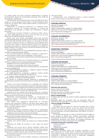 WWW.GHIDULPRIMARIILOR.RO JUDE%u021aUL BRA%u0218OV / 161Cu aceste utilaje am f%u0103cut economii substan%u021biale la bugetul local,neav%u00e2nd nevoie de contractarea serviciilor altor firme de specialitate in dez%u0103pezireAchizi%u021bionarea unui buldoexcavator Cukurova 885 din fonduri proprii cu care se asigur%u0103 interven%u021biile %u00een situa%u021bii deosebite (apa/canal etc.) %u015fi pentru alte lucr%u0103ri publice pentru a putea veni %u00een sprijinul cet%u0103%u0163enilorDeblocarea %u0219i finalizarea proiectului cu Gr%u0103dini%u021ba Noua Cutus,priect finan%u021bat din Fonduri Europene %u00een valuare de 1.591.224,92 lei %u0219i dotarea cu sistem de climatizare %u0219i sistem fotovoltaicIntroducerea Fondului Forestier %u00een programul APIA, pentru anii 2021- 2024,ob%u0163in%u00e2ndu-se anual suma de 228 mii lei care asigur%u0103 cofinan%u0163%u0103rile proiectelor EuropeneTinerii sunt unul dintre principalele atuuri ale comunei Crizbav,reprezent%u00e2nd at%u00e2t prezentul c%u00e2t si viitorul. Prioritatea mea este s%u0103 pot oferi facilita%u0163i tinerilor pentru a-i convinge s%u0103 r%u0103m%u00e2na %u00een comuna noastr%u0103 %u0219i pentru a-i determina pe cei pleca%u0163i s%u0103 se %u00eentoarc%u0103 acas%u0103. Astfel, %u00een vederea sprijinirii tinerilor,am demarat procedura de realizare a dou%u0103 cartiere Crizb%u0103%u0219el | si Crizb%u0103%u015fel II( l%u00e2nga Gr%u0103dini%u021ba noua din Cutu%u0219) %u0219i urmeaz%u0103 s%u0103 atribuim locuri de cas%u0103 %u00een baza legii nr.15/2003Montarea sistemului de supraveghere/monitorizare video a localit%u0103%u021bii Crizbav,din fonduri propriiAm construit platforma de de%u015feuri menajere si selective %u00een incinta Prim%u0103riei Crizbav care se folose%u015fte cu titlu gratuitLa intrarea %u00een comun%u0103 am instalat totemuri,intrarea devenind astfel mai vizibil%u0103Pavarea tuturor aleilor din cimitirele existente %u00een localitatea Crizbav cu dale(cimitirul ortodox,evanghelic,penticostal)Asfaltarea drumului c%u0103tre cimitirul ortodoxSitua%u0163ia la zi a proiectelor din Fonduri EuropeneAm reu%u015fit accesarea de fonduri europene pentru urmatoarele proiecte %u00een desf%u0103%u0219urare:a) PNRR-Reabilitare moderat%u0103 a cl%u0103dirilor publice Prim%u0103ria Crizbav %u00een valoare de 1.790.443,10 leib) PNRR-Reabilitare moderat%u0103 a cl%u0103dirilor publice %u0218coala Gimnazial%u0103 Crizbav %u00een valoare de 3.056.945,51 leic) Anghel Saligny-Modernizare drumuri Comuna Crizbav Jude%u021bul Bra%u0219ov %u00een valoare de 10.000.000,00 leid) Dotare cu mobilier,materiale didactice %u0219i echipamente digitale pentru %u0218coala Gimnazial%u0103 Crizbav %u00een valoare de 776.104,04 lei.Crearea unui c%u00e2mp fotovoltaic pe o suprafa%u021ba de 5 200m2 pentru consum propriu,la iluminatul public %u0219i institu%u021biile publice. Proiectul presupune instalarea de echipament (191 panouri putere 105 KW) care s%u0103 asigure 99% din energia electric%u0103 consumat%u0103 de UAT Crizbav,investi%u021bie in valoare de 1.150.762+TVACrearea unui nou tronson de iluminat public pe o lungime de 2Km %u0219i 100 de corpuri de iluminat de ultim%u0103 genera%u021bie (strada Bra%u015fovului,de la Ferme p%u00e2na in localitate)Re%u00eennoirea amenajamentului forestier %u0219i introducerea %u00een programul Corbon X (certificate verzi) pentru ob%u021binerea de Fonduri EuropeneVom ob%u0163ine prin programul MDLPA-AFM un microbuz hibrid iar prin programul PNRR un microbuz 100% electric deci dou%u0103%u00a0microbuze pentru comuna Crizbav din Fonduri Europene, pentru a putea transporta eleviiProiecte propuseReabilitarea Cabanei Forestiere Valea Mare %u015fi posibilitatea %u00eenchirierii de c%u0103tre cet%u0103%u021benii Comunei Crizbav, %u00een scop de recreereAsfaltarea drumului c%u0103tre cimitirul penticostalProiectarea %u015fi executarea trotoarelor %u0219i canalelor de scurgere a apelor pluviale %u00een satele Crizbav %u015fi CutusL%u0103rgirea podului de acces din DC39(spre Satu Nou) %u015fi crearea unei benzi de circula%u021bie pietonal%u0103Crearea unui circuit turistic pe traseul Sat Crizbav-Cetatea CrizbavMontarea pe st%u00e2lpii de iluminat a unor co%u015furi de gunoi menajerMontarea unui ecran led %u00een centrul localit%u0103%u021bii, astfel %u00eenc%u00e2t locuitorii comunei Crizbav s%u0103 fie informa%u0163i, %u00een timp real,cu privire la activit%u0103%u021bile desf%u0103%u015furate de c%u0103tre deciden%u0163ii comunei (Primar, Viceprimar, Consilieri Locali %u015fi Comisia de Fond Funciar)Atragerea de noi fonduri pentru a putea crea sta%u0163ia de epurare pentru comuna CrizbavAtragerea de orice fel de investi%u021bii necesare la dezvoltarea comunei CrizbavAchizi%u0163ionarea unui autogreder pentru a putea %u00eentre%u0163ine drumurile din c%u00e2mp %u0219i drumurile forestiereCOMUNA DR%u0102GU%u015eAdres%u0103: Principal%u0103, nr. 42Cod po%u0219tal: 507251Telefon: 0268-249618, 249601; Fax: 0268-249601; Adresa de e-mail: primariadragus@yahoo.comURL: https://comunadragus.ro/COMUNA DUMBR%u0102VI%u0162AAdres%u0103: Str. Mare, Nr. 1176Cod po%u0219tal: 507060Telefon: 0268-483100, 483014; Fax: 0268-483014; Adresa de e-mail: primaria.dumbravita@yahoo.comURL: http://www.primariadumbravita.roMUNICIPIUL F%u0102G%u0102RA%u015eAdres%u0103: Republicii, nr. 3Cod po%u0219tal: 505200Telefon: 0368-402949 , 402919; Fax: 0368-402805; Adresa de e-mail: secretariat@primaria-fagaras.roURL: www.primaria-fagaras.roCOMUNA FELDIOARAAdres%u0103: Octavian Goga, nr. 55Cod po%u0219tal: 507065Telefon: 0268-265403; Fax: 0268-265403; Adresa de e-mail: primariafeldioarabv@yahoo.comcontact@primaria-feldioara.roURL: www.primaria-feldioara.roCOMUNA FUNDATAAdres%u0103: Principal%u0103, nr. 56Cod po%u0219tal: 507070Telefon: 0268-236651; Fax: 0268-238068; Adresa de e-mail: primariafundata@yahoo.comURL: http://primariafundata.ro/Persoane din primarie:Primar:%u00a0Marian Florin%u00a0P%u00e2teaViceprimar: D%u0103nu%u0163%u00a0C%u0103ciul%u0103%u