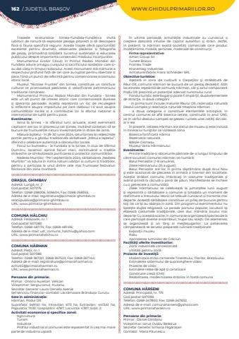 162 / JUDE%u021aUL BRA%u0218OV WWW.GHIDULPRIMARIILOR.ROTraseele ecoturistice Sirnea-Fundata-Fund%u0103%u021bica invit%u0103 iubitorii de natur%u0103 s%u0103 exploreze peisaje pitore%u0219ti %u0219i s%u0103 descopere flora %u0219i fauna specific%u0103 regiunii. Aceste trasee ofer%u0103 oportunit%u0103%u021bi excelente pentru drume%u021bii, observarea p%u0103s%u0103rilor %u0219i fotografia de peisaj, promov%u00e2nd totodat%u0103 turismul sustenabil %u0219i educarea publicului despre importan%u021ba conserv%u0103rii mediului %u00eenconjur%u0103tor.Monumentul Eroilor C%u0103zu%u021bi %u00een Primul Razboi Mondial din Fundata aduce omagiu curajului %u0219i sacrificiului solda%u021bilor care %u0219iau dat via%u021ba %u00een timpul razboiului. Acest monument st%u0103 m%u0103rturie a respectului profund fa%u021b%u0103 de cei care au luptat pentru libertate %u0219i pace, fiind un punct de referin%u021b%u0103 pentru comemorarea eroismului istoric local.Muzeul %u201cNicolae Fruntes%u201d din %u0218irnea, constituie un sanctuar cultural ce promoveaz%u0103 p%u0103strarea %u0219i valorificarea patrimoniului tradi%u021bional rom%u00e2nesc.Monumentul Primului R%u0103zboi Mondial din Fundata - %u0218irnea este un alt punct de interes istoric care comemoreaz%u0103 durerea %u0219i speran%u021ba perioadei. Acesta reprezint%u0103 un loc de reculegere %u0219i reflectare asupra impactului pe care r%u0103zboiul l-a avut asupra comunit%u0103%u021bilor locale %u0219i a contribu%u021biei lor la efortul na%u021bional %u0219i interna%u021bional de lupt%u0103 pentru pace.Evenimente:Iarna la %u015eirnea - la sf%u00e2r%u0219itul lunii ianuarie, acest eveniment captivant are loc %u00een pitorescul sat %u015eirnea, invit%u00e2nd vizitatorii s%u0103 se bucure de frumuse%u021bile naturii %u00eenve%u0219m%u00e2ntate %u00een straie de iarn%u0103.M%u0103sura laptelui - %u00een 29-30 iunie 2024, satul %u0218irnea %u00ee%u0219i redeschide por%u021bile pentru a g%u0103zdui tradi%u021bionala s%u0103rb%u0103toare %u201eM%u0103sura laptelui%u201c, oferind o celebrare autentic%u0103 a obiceiurilor locale.Focul lui Sumedru - la Fundata %u0219i la %u0218irnea, %u00een ziua de Sf%u00e2ntul Dumitru, localnicii aprind focuri mari, continu%u00e2nd o tradi%u021bie str%u0103veche ce simbolizeaz%u0103 purificarea %u0219i protec%u021bia comunit%u0103%u021bilor.Nedeea Mun%u021bilor - Pe 1 septembrie 2024, s%u0103rb%u0103toarea %u201eNedeea Mun%u021bilor%u201c va aduna %u00een inima naturii iubitori ai culturii %u0219i tradi%u021biilor, pentru a participa la unul dintre cele mai frumoase festivaluri folclorice din zona montan%u0103.ORA%u0218UL GHIMBAVAdres%u0103: Lung%u0103, nr. 2Cod po%u0219tal: 507075Telefon: 0268-258006, 506604; Fax: 0268-258355; Adresa de e-mail: registratura@primaria-ghimbav.ro relatiipublice@primaria-ghimbav.roURL: www.primaria-ghimbav.roCOMUNA H%u0102LCHIUAdres%u0103: Feldioarei, nr. 1Cod po%u0219tal: 507080Telefon: 0268-481174; Fax: 0268-481416; Adresa de e-mail: uat_comuna_halchiu@yahoo.comURL: www.primariahalchiu.roCOMUNA H%u0102RMANAdres%u0103: Pie%u0163ii, nr. 1Cod po%u0219tal: 507085Telefon: 0268-367221, 0268-367523; Fax: 0268-367144; Adresa de e-mail: registratura@primariaharman.roachizitii@primariaharman.roURL: www.primariaharman.roPersoane din primarie:Primar:%u00a0 Onoriu Aurelian%u00a0%u00a0VelicanViceprimar: Sergiu Ionu%u021b%u00a0%u00a0Hu%u021banu%u00a0Secretar General: Laura Daniela Axenie%u0218ef serviciu financiar-contabil: L%u0103cr%u0103mioara Br%u00e2ndu%u0219a%u00a0Curu%u021bu%u00a0Sate %u00een administra%u021bie:H%u0103rman, Podul OltSuprafa%u021ba:%u00a0 5491,61 ha; Intravilan:%u00a0 673 ha; Extravilan:%u00a0 4413,61 ha; Popula%u021bia:%u00a07033; Gospod%u0103rii:%u00a04787; Locuin%u021be:%u00a04787; %u0218coli:%u00a02; Activitati economice si specifice zonei:Agricultur%u0103TurismIndustrie Profilul industrial al comunei este reprezentat %u00een cea mai mare parte de industria u%u015foar%u0103%u00cen ultima perioad%u0103, activit%u0103%u0163ile industriale au cunoscut o cre%u015ftere datorat%u0103 infuziei de capital autohton %u015fi str%u0103in. Astfel, %u00een prezent, la H%u0103rman exist%u0103 societ%u0103%u0163i comerciale care produc %u00eenc%u0103l%u0163%u0103minte, mobil%u0103, %u015feminee, materiale de construc%u0163iiFirme reprezentative:Aman Group SrlTunele Bra%u0219ovFrontex TradeKronemag IndustriesArmaturenfabrik Franz Schneider SRLObiective turistice:A%u015fezat%u0103 %u00een zona de curbur%u0103 a Carpa%u0163ilor %u015fi str%u0103b%u0103tut%u0103 de R%u00e2ul Olt, comuna H%u0103rman se bucur%u0103 de un peisaj deosebit. At%u00e2t localitatea re%u015fedint%u0103 de comun%u0103, H%u0103rman, c%u00e2t %u015fi satul component Podu Olt prezint%u0103 un poten%u0163ial adecvat turismului ruralFondul turistic este bogat %u015fi poate fi %u00eemp%u0103r%u0163it, dup%u0103 elementele de atrac%u0163ie, %u00een dou%u0103 categorii:- %u00een prima sunt incluse malurile R%u00e2ului Olt, rezerva%u0163ia natural%u0103 Dealul Lempes %u015fi rezerva%u0163ia natural%u0103 Mla%u015ftina H%u0103rman- a doua categorie o constituie elementele antropice, %u00een centrul comunei se afl%u0103 biserica-cetate, construit%u0103 %u00een anul 1290, iar %u00een v%u00e2rful dealului Lempes se g%u0103sesc ruinele unei cet%u0103%u0163i din sec. al V-lea%u00cen prezent, cetatea H%u0103rman are statut de muzeu %u015fi este inclus%u0103 %u00een itinerariul turi%u015ftilor ce viziteaz%u0103 zonaBiserica fortificat%u0103 H%u0103rmaRezerva%u021bia natural%u0103B%u0103l%u0219ile Cisma%u0219uMuzeul Vatra H%u0103rmanuluiEvenimente:Printre tradi%u0163iile %u015fi obiceiurile p%u0103strate de-a lungul timpului de c%u0103tre locuitorii comunei H%u0103rman se num%u0103r%u0103:Balul Pena%u0219ilor (1-8 ianuarie),Zilele H%u0103rmanului (15 august)%u00a0Balul Pena%u0219ilor are loc %u00een prima s%u0103pt%u0103m%u00e2na dup%u0103 Anul Nou %u015fi este ocazionat de plecarea %u00een armat%u0103 a tinerilor din localitate. Ace%u015ftia 