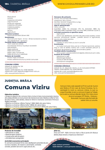 184 / JUDE%u021aUL BR%u0102ILA WWW.GHIDULPRIMARIILOR.ROPiscicultur%u0103Comer%u0163Cre%u015fterea animalelorLegumicultur%u0103Produc%u0163ie vegetal%u0103Cre%u015fterea animalelorCre%u015fterea pe%u015fteluiLegumicultur%u0103ServiciiAgricultur%u0103Obiective turistice:Sta%u0163iunea balnear%u0103 C%u00e2ineni-B%u0103iEvenimente:Ziua comunei Vi%u015fani - 21 mai - Sfin%u0163ii Constantin %u015fi ElenaT%u00e2rg s%u0103pt%u0103m%u00e2nal - duminicaFacilit%u00e3%u0163i oferite investitorilor:Teren arabil de calitateConcesion%u0103ri terenuri la pre%u0163uri accesibileAp%u0103 potabil%u0103Re%u0163ea telefonieRe%u0163ea electricitateRe%u0163ea cablu TV/internetRe%u0163ea de drumuri reabilitateProiecte de investi%u0163ii:Proiect re%u0163ea canalizareProiect asfaltare drumuri %u015fi str%u0103zi comunaleCOMUNA VIZIRUAdres%u0103: Str. Br%u0103ilei, Nr. 129Cod po%u0219tal: 817215Telefon: 0239-666400; Fax: 0239-666490; Adresa de e-mail: registratura@primaria-viziru.roURL: www.primaria-viziru.roPersoane din primarie:Primar: Ana Cornelia M%u0103crineanuViceprimar: Nicu ChiriacSecretar General: Drago%u015f-Silviu LunguContabil: Viorica AndroneSate %u00een administra%u021bie:Viziru, LanurileSuprafa%u021ba:%u00a0 10564 ha; Intravilan:%u00a0 674 ha; Extravilan:%u00a0 9894 ha; Popula%u021bia:%u00a06396; Gospod%u0103rii:%u00a02027; Locuin%u021be:%u00a01995; Gr%u0103dini%u021be:%u00a03; %u0218coli:%u00a02; Activitati economice si specifice zonei:Agricultur%u0103Firme care desf%u0103%u0219oara activita%u021bi de prelucrarea laptelui, tratat semin%u021be ,achizi%u021bionat cereale , prest%u0103ri servicii %u00een agricultur%u0103, service auto, sta%u021bie benzina.Obiective turistice:2 biserici %u00een satul Viziru %u0219i una %u00een LanurileEvenimente:La nivelul comunei Viziru are loc in fiecare duminic%u0103, vestitul t%u00e2rg %u00een care se desfac m%u0103rfuri de o mare varietate precum %u0219i schimburi de produse %u0219i v%u00e2nz%u0103ri de animale %u0219i p%u0103s%u0103ri.Facilit%u00e3%u0163i oferite investitorilor:Oficiu po%u0219tal ,centrala telefonic%u0103%u00a0digitala, televiziune prin cabluProiecte de investi%u0163ii:Aduc%u0163iune cu ap%u0103Reamenajat StadionConstruit Sal%u0103 de SportAchizi%u0163ionat AutogrederCOMUNA Z%u0102VOAIAAdres%u0103: Str. Dr. Alexandru Vechiu, nr. 51; Cod po%u0219tal: 817220Telefon: 0239-638790; Fax: 0239-638790; Adresa de e-mail: zavoaiabr@yahoo.comURL: www.primariazavoaia.ro