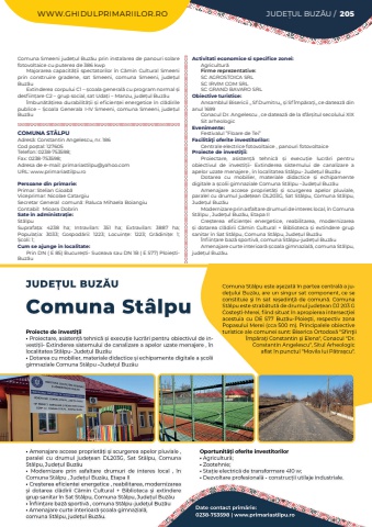 WWW.GHIDULPRIMARIILOR.RO JUDE%u021aUL BUZ%u0102U / 205Comuna Smeeni jude%u021bul Buz%u0103u prin instalarea de panouri solare fotovoltaice cu puterea de 386 kwpMajorarea capacit%u0103%u021bii spectatorilor %u00een C%u0103min Cultural Smeeni prin construire gradene, sat Smeeni, comuna Smeeni, jude%u021bul Buz%u0103uExtinderea corpului C1 %u2013 %u0219coala general%u0103%u00a0cu program normal %u0219i desfiin%u021bare C2 %u2013 grup social, sat Uda%u021bi %u2013 Manzu, jude%u021bul Buz%u0103u%u00cembun%u0103t%u0103%u021birea durabilit%u0103%u021bii %u0219i eficien%u021bei energetice %u00een cl%u0103dirile publice %u2013 %u0218coala Generala I-IV Smeeni, comuna Smeeni, jude%u021bul Buz%u0103uCOMUNA ST%u00c2LPUAdres%u0103: Constantin Angelescu, nr. 186Cod po%u0219tal: 127605Telefon: 0238-753598; Fax: 0238-753598; Adresa de e-mail: primariastilpu@yahoo.comURL: www.primariastilpu.roPersoane din primarie:Primar:%u00a0Stelian%u00a0Gioab%u0103%u00a0Viceprimar: Nicolae%u00a0Catargiu%u00a0Secretar General%u00a0 comun%u0103: Raluca Mihaela%u00a0BoiangiuContabil:%u00a0 Mioara%u00a0DobrinSate %u00een administra%u021bie:St%u00e2lpuSuprafa%u021ba:%u00a0 4238 ha; Intravilan:%u00a0 351 ha; Extravilan:%u00a0 3887 ha; Popula%u021bia:%u00a0 3033; Gospod%u0103rii:%u00a0 1223; Locuin%u021be:%u00a0 1223; Gr%u0103dini%u021be:%u00a0 1; %u0218coli:%u00a01; Cum se ajunge in localitate:Prin DN ( E 85) Bucure%u0219ti- Suceava sau DN 1B ( E 577) Ploie%u0219tiBuz%u0103uActivitati economice si specifice zonei:Agricultur%u0103Firme reprezentative:SC AGROSTOICA SRLSC IRVIM COM SRL SC GRAND BAVARO SRLObiective turistice:Ansamblul Bisericii ,, Sf Dumitru,, %u0219i Sf %u00cemp%u0103ra%u021bi,, ce dateaz%u0103%u00a0din anul 1699Conacul Dr. Angelescu , ce dateaz%u0103%u00a0de la sf%u00e2r%u0219itul secolului XIX Sit arheologicEvenimente:Festivalul %u201dFloare de Tei%u201dFacilit%u00e3%u0163i oferite investitorilor:Centrale electrice fotovoltaice , panouri fotovoltaiceProiecte de investi%u0163ii:Proiectare, asisten%u021b%u0103%u00a0 tehnic%u0103%u00a0 %u0219i execu%u021bie lucr%u0103ri pentru obiectivul de investi%u021bii- Extinderea sistemului de canalizare a apelor uzate menajere , %u00een localitatea St%u00e2lpu- Jude%u021bul Buz%u0103uDotarea cu mobilier, materiale didactice %u0219i echipamente digitale a %u0219colii gimnaziale Comuna St%u00e2lpu %u2013Jude%u021bul Buz%u0103uAmenajare accese propriet%u0103%u021bi %u0219i scurgerea apelor pluviale, paralel cu drumul jude%u021bean DL203G, Sat St%u00e2lpu, Comuna St%u00e2lpu, Jude%u021bul Buz%u0103uModernizare prin asfaltare drumuri de interes local, %u00een Comuna St%u00e2lpu , Jude%u021bul Buz%u0103u, Etapa IICre%u0219terea eficien%u021bei energetice, reabilitarea, modernizarea %u0219i dotarea cl%u0103dirii C%u0103min Cultural + Biblioteca %u0219i extindere grup sanitar %u00een Sat St%u00e2lpu, Comuna St%u00e2lpu, Jude%u021bul Buz%u0103u%u00cenfiin%u021bare baz%u0103 sportiv%u0103, comuna St%u00e2lpu-jude%u021bul Buz%u0103uAmenajare curte interioar%u0103%u00a0%u0219coala gimnazial%u0103, comuna St%u00e2lpu, jude%u021bul Buz%u0103u.