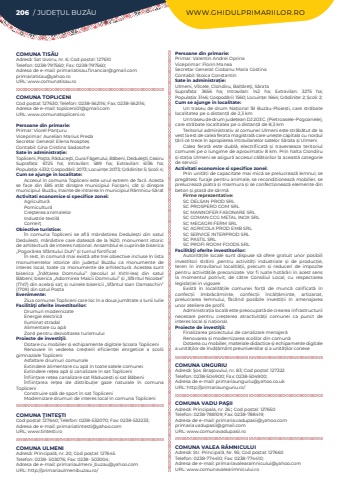 206 / JUDE%u021aUL BUZ%u0102U WWW.GHIDULPRIMARIILOR.ROCOMUNA TIS%u0102UAdres%u0103: Sat Izvoru, nr. 6; Cod po%u0219tal: 127610Telefon: 0238-797560; Fax: 0238-797560; Adresa de e-mail: primariatisau.financiar@gmail.comprimariatisau@yahoo.roURL: www.comunatisau.roCOMUNA TOPLICENICod po%u0219tal: 127630; Telefon: 0238-562116; Fax: 0238-562116; Adresa de e-mail: topliceni01@gmail.comURL: www.comunatopliceni.roPersoane din primarie:Primar:%u00a0Viorel%u00a0Pan%u0163uru%u00a0Viceprimar:%u00a0Aurelian Marius PredaSecretar General:%u00a0Elena%u00a0Noapte%u0219%u00a0Contabil: Gina Cristina SadoscheSate %u00een administra%u021bie:Topliceni, Po%u015fta, R%u0103duce%u015fti, Gura F%u0103getului, B%u0103beni, Dedule%u015fti, CeairuSuprafa%u021ba:%u00a0 6725 ha; Intravilan:%u00a0 589 ha; Extravilan:%u00a0 6136 ha; Popula%u021bia:%u00a04332; Gospod%u0103rii:%u00a02073; Locuin%u021be:%u00a02073; Gr%u0103dini%u021be:%u00a05; %u0218coli:%u00a04; Cum se ajunge in localitate:Accesul %u00een comuna Topliceni este unul extrem de facil. Acesta se face din E85 at%u00e2t dinspre municipiul Foc%u0219ani, c%u00e2t %u0219i dinspre municipiul%u00a0%u00a0Buz%u0103u, %u00eenainte de intrarea %u00een municipiul%u00a0R%u00e2mnicu-S%u0103ratActivitati economice si specifice zonei:Agricultur%u0103Pomicultur%u0103Cre%u015fterea animalelorIndustrie textil%u0103Comer%u0163Obiective turistice:%u00cen comuna Topliceni se afl%u0103 m%u0103n%u0103stirea Dedule%u0219ti din satul Dedule%u0219ti, m%u0103n%u0103stire care dateaz%u0103 de la 1620, monument istoric de arhitectur%u0103 de interes na%u021bional. Ansamblul ei cuprinde biserica %u201ePogor%u00e2rea Sf%u00e2ntului Duh%u201d %u0219i turnul fortificat%u00cen rest, %u00een comun%u0103 mai exist%u0103 alte trei obiective incluse %u00een%u00a0lista monumentelor istorice din jude%u021bul Buz%u0103u%u00a0 ca monumente de interes local, toate ca monumente de arhitectur%u0103. Acestea sunt biserica %u201e%u00cen%u0103l%u021barea Domnului%u201d (secolul al XVIII-lea) din satul B%u0103beni; biserica %u201eAdormirea Maicii Domnului%u201d %u0219i %u201eSf%u00e2ntul Nicolae%u201d (1747) din acela%u0219i sat; %u0219i ruinele bisericii %u201eSf%u00e2ntul Ioan Damaschin%u201d (1709) din satul Po%u0219taEvenimente:Ziua comunei Topliceni care loc %u00een a doua jum%u0103tate a lunii IulieFacilit%u00e3%u0163i oferite investitorilor:Drumuri modernizateEnergie electric%u0103Iluminat stradalAlimentare cu ap%u0103Zon%u0103 pentru dezvoltarea turismuluiProiecte de investi%u0163ii:Dotare cu mobilier %u0219i echipamente digitale %u0218coala TopliceniRenovare %u00een vederea cre%u0219terii eficien%u021bei enrgetice a %u0219colii gimnaziale TopliceniAsfaltare drumuri comunaleExtindere alimentare cu ap%u0103%u00a0%u00een toate satele comuneiExtindere re%u021bea ap%u0103%u00a0%u0219i canalizare %u00een sat Topliceni%u00cenfiin%u021bare re%u021bea canalizare sat R%u0103duce%u0219ti %u0219i sat B%u0103beni%u00cenfiin%u021barea re%u021bea de distribu%u021bie gaze naturale %u00een comuna TopliceniConstruire sal%u0103%u00a0de sport %u00een sat TopliceniModernizare drumuri de interes local %u00een comuna TopliceniCOMUNA %u0162INTE%u015eTICod po%u0219tal: 127640; Telefon: 0238-532070; Fax: 0238-532233; Adresa de e-mail: primariatintesti@yahoo.comURL: www.tintesti.roCOMUNA ULMENIAdres%u0103: Principal%u0103, nr. 20; Cod po%u0219tal: 127645Telefon: 0238- 503076; Fax: 0238- 503004; Adresa de e-mail: primariaulmeni_buzau@yahoo.comURL: http://primariaulmenibuzau.ro/Persoane din primarie:Primar: Valentin Andrei OprinaViceprimar: Florin ManeaSecretar General: Ciobanu Maria CostinaContabil: Stoica ConstantinSate %u00een administra%u021bie:Ulmeni, V%u00eelcele, Clondiru, Balt%u0103re%u0163i, S%u0103rataSuprafa%u021ba:%u00a0 3656 ha; Intravilan:%u00a0 142 ha; Extravilan:%u00a0 3275 ha; Popula%u021bia:%u00a03146; Gospod%u0103rii:%u00a01560; Locuin%u021be:%u00a01664; Gr%u0103dini%u021be:%u00a02; %u0218coli:%u00a02; Cum se ajunge in localitate:Un traseu de drum Na%u021bional 1B Buz%u0103u-Ploie%u0219ti, care str%u0103bate localitatea pe o distan%u021b%u0103%u00a0de 2,3 kmUn traseu de drum jude%u021bean DJ 203 C. (Pietroasele-Pogoanele), care str%u0103bate localitatea pe o distan%u021b%u0103%u00a0de 8,3 kmTeritoriul administrativ al comunei Ulmeni este str%u0103b%u0103tut de la vest la est de calea ferata magistral%u0103%u00a0care une%u0219te capitala cu nordul %u021b%u0103rii ce trece %u00een apropierea intravilanelor satelor S%u0103rata %u0219i UlmeniCalea ferat%u0103%u00a0 este dubl%u0103, electrificat%u0103%u00a0 %u0219i traverseaza teritoriul comunei pe o lungime de aproximativ 8 km. Prin halta Clondiru %u0219i sta%u021bia Ulmeni se asigur%u0103%u00a0accesul c%u0103l%u0103torilor la aceast%u0103%u00a0categorie de serviciiActivitati economice si specifice zonei:Prin unit%u0103%u021bi de capacitate mai mic%u0103%u00a0se prelucreaz%u0103%u00a0lemnul, se preg%u0103tesc furaje pentru animale, se reconditioneaz%u0103%u00a0mobilier, se prelucreaz%u0103%u00a0piatra %u0219i marmura %u0219i se confectioneaz%u0103%u00a0elemente din beton %u0219i plas%u0103%u00a0de s%u00e2rm%u0103Firme reprezentative:SC DELSAN PROD SRLSC PROSPERO COM SRLSC MANNOFER FASONARE SRLSC COMAN CCG METAL INOX SRLSC MECAGRI FERM SRLSC AGRICOLA PROD EMB SRLSC SERVICE INTERPROD SRLSC PASTIL SRL SC PROFI ROOM FOODS SRLFacilit%u00e3%u0163i oferite investitorilor:Autorit%u0103%u021bile locale sunt dispuse s%u0103%u00a0ofere gratuit unor posibili investitori str%u0103ini ,pentru activit%u0103%u021bi industriale %u0219i de produc%u021bie, teren %u00een intravilanul localit%u0103%u021bii, precum %u0219i reduceri de impozite pentru activit%u0103%u021bile preconizate. Vor fi luate hot%u0103r%u00e2ri %u00een acest sens la momentul potrivit, de c%u0103tre Consiliul Local, cu respectarea legisla%u021biei in vigoareExist%u0103%u00a0 %u00een localit%u0103%u021bile comunei for%u021b%u0103%u00a0 de munc%u0103%u00a0 calificat%u0103%u00a0 %u00een confec%u021bii %u00eembr%u010
