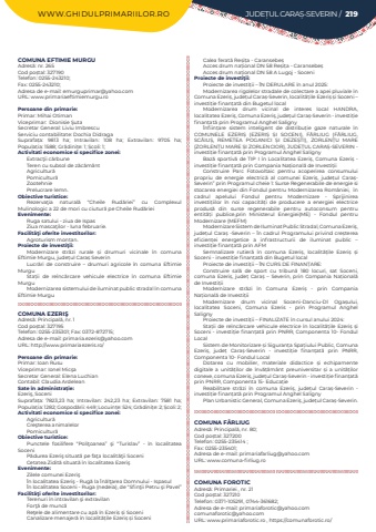 WWW.GHIDULPRIMARIILOR.RO JUDE%u021aUL CARA%u0218-SEVERIN / 219COMUNA EFTIMIE MURGUAdres%u0103: nr. 265Cod po%u0219tal: 327190Telefon: 0255-243210; Fax: 0255-243210; Adresa de e-mail: emurguprimar@yahoo.comURL: www.primariaeftimiemurgu.roPersoane din primarie:Primar: Mihai Otiman%u00a0Viceprimar:%u00a0%u00a0Dionisie %u015euta%u00a0Secretar General:%u00a0Liviu ImbrescuServiciu contabilitate:%u00a0Dochia DidragaSuprafa%u021ba:%u00a0 9813 ha; Intravilan:%u00a0 108 ha; Extravilan:%u00a0 9705 ha; Popula%u021bia:%u00a01588; Gr%u0103dini%u021be:%u00a01; %u0218coli:%u00a01; Activitati economice si specifice zonei:Extrac%u0163ii c%u0103rbuneTeren cu subsol de z%u0103c%u0103m%u00e2ntAgricultur%u0103Pomicultur%u0103ZootehniePrelucrare lemn.Obiective turistice:Rezerva%u0163ia natural%u0103 %u201cCheile Rud%u0103riei%u201d cu Complexul Mulinologic a 22 de mori cu ciutur%u0103 pe Cheile Rud%u0103rieiEvenimente:Ruga satului - ziua de%u00a0Ispas%u00a0Ziua masca%u0163ilor - luna februarie.Facilit%u00e3%u0163i oferite investitorilor:Agroturism montan.Proiecte de investi%u0163ii:Modernizare str%u0103zi rurale %u0219i drumuri vicinale %u00een comuna Eftimie Murgu, jude%u021bul Cara%u0219%u00a0SeverinLucr%u0103ri de construire %u2013 drumuri agricole %u00een comuna Eftimie MurguSta%u021bii de re%u00eenc%u0103rcare vehicule electrice %u00een comuna Eftimie MurguModernizarea sistemului de iluminat public stradal %u00een comuna Eftimie MurguCOMUNA EZERI%u015eAdres%u0103: Principal%u0103, nr. 1Cod po%u0219tal: 327195Telefon: 0255-235301; Fax: 0372-872715; Adresa de e-mail: primaria.ezeris@yahoo.comURL: http://www.primariaezeris.ro/Persoane din primarie:Primar: Ioan Rusu%u00a0Viceprimar:%u00a0Ionel%u00a0Mic%u015faSecretar General:%u00a0Elena%u00a0Luchian%u00a0Contabil:%u00a0Claudia%u00a0Ardelean%u00a0Sate %u00een administra%u021bie:Ezeri%u015f, SoceniSuprafa%u021ba:%u00a0 7823,23 ha; Intravilan:%u00a0 242,23 ha; Extravilan:%u00a0 7581 ha; Popula%u021bia:%u00a01282; Gospod%u0103rii:%u00a0449; Locuin%u021be:%u00a0524; Gr%u0103dini%u021be:%u00a02; %u0218coli:%u00a02; Activitati economice si specifice zonei:Agricultur%u0103Cre%u015fterea animalelorPomicultur%u0103Obiective turistice:Punctele fosilifere %u201cPoli%u0163oanea%u201d %u015fi %u201cTurislav%u201d - %u00een localitatea SoceniP%u0103durea Ezeri%u015f situat%u0103 pe fa%u0163a localit%u0103%u0163ii SoceniCetatea Zidit%u0103 situat%u0103 %u00een localitatea Ezeri%u015fEvenimente:Zilele comunei Ezeri%u015f%u00cen localitatea Ezeri%u015f - Rug%u0103 la %u00cen%u0103l%u0163area Domnului - Ispasul%u00cen localitatea Soceni - Ruga (nedeia), de %u201cSfin%u0163ii Petru%u00a0%u015fi Pavel%u201dFacilit%u00e3%u0163i oferite investitorilor:Terenuri %u00een intravilan %u015fi extravilanFor%u0163%u0103 de munc%u0103Re%u0163ele de alimentare cu ap%u0103 %u00een Ezeri%u0219%u00a0%u0219i SoceniCanalizare menajer%u0103 %u00een localit%u0103%u021bile Ezeri%u0219 %u0219i SoceniCalea ferat%u0103 Re%u0219i%u021ba - Caransebe%u0219Acces drum na%u021bional DN 58 Re%u0219i%u021ba - Caransebe%u0219Acces drum na%u021bional DN 58 A Lugoj - SoceniProiecte de investi%u0163ii:Proiecte de investi%u021bii %u2013 %u00ceN DERULARE %u00een anul 2025:Modernizarea rigolelor stradale de colectare a apei pluviale %u00een Comuna Ezeri%u0219, jude%u021bul Cara%u0219-Severin, localit%u0103%u021bile Ezeri%u0219 %u0219i Soceni %u2013 investi%u021bie finan%u021bat%u0103 din Bugetul localModernizarea drum vicinal de interes local HANDRA, localitatea Ezeri%u0219, Comuna Ezeri%u0219, jude%u021bul Cara%u0219-Severin - investi%u021bie finan%u021bat%u0103 prin Programul Anghel Saligny%u00cenfiin%u021bare sistem inteligent de distribu%u021bie gaze naturale %u00een COMUNELE EZERI%u0218 (EZERI%u0218 %u0218I SOCENI), F%u00c2RLIUG (F%u00c2RLIUG, SC%u0102IU%u0218, REMETEA POGANICI %u0218I DEZE%u0218TI), ZORLEN%u021aU MARE (ZORLEN%u021aU MARE %u0218I ZORLENCIOR), JUDE%u021aUL CARA%u0218-SEVERIN - investi%u021bie finan%u021bat%u0103 prin Programul Anghel SalignyBaz%u0103 sportiv%u0103 de TIP I %u00een Localitatea Ezeri%u0219, Comuna Ezeri%u0219 - investi%u021bie finan%u021bat%u0103 prin Compania Na%u021bional%u0103 de Investi%u021biiConstruire Parc Fotovoltaic pentru acoperirea consumului propriu de energie electric%u0103 al comunei Ezeri%u0219, jude%u021bul Cara%u0219Severin%u201d prin Programul cheie 1: Surse Regenerabile de energie si stocarea energiei din Fondul pentru Modernizarea Rom%u00e2niei, %u00a0%u00een cadrul apelului Fondul pentru Modernizare - Sprijinirea investi%u021biilor %u00een noi capacit%u0103%u021bi de producere a energiei electrice produs%u0103 din surse regenerabile pentru autoconsum pentru entit%u0103%u021bi publice,prin Ministerul Energiei(ME) - Fondul pentru Modernizare (MEFM)Modernizare Sistem de Iluminat Public Stradal, Comuna%u00a0Ezeri%u0219, jude%u021bul Cara%u0219 -Severin %u2013 %u00cen cadrul Programului privind cre%u0219terea eficien%u021bei energetice a infrastructurii de iluminat public %u2013 investi%u021bie finan%u021bat%u0103 prin AFMSemnalizare rutier%u0103 %u00een comuna Ezeri%u0219, localit%u0103%u021bile Ezeri%u0219 %u0219i Soceni - investi%u021bie finan%u021bat%u0103 din Bugetul localProiecte de investi%u021bii %u2013 %u00ceN CURS DE FINAN%u021aARE:Construire sal%u0103 de sport cu tribun%u0103 180 locuri, sat Soceni, comuna Ezeri%u0219, jude%u021b Cara%u0219 %u2013 Severin, prin Compania Na%u021bional%u0103 de Investi%u021biiModernizare str%u0103zi %u00een Comuna Ezeri%u0219 - prin Compania Na%u021bional%u0103 de Investi%u021biiModernizare drum vicinal Soceni-Danciu-Dl Oga%u0219ului, localitatea Soceni, Comuna Ezeris - prin Programul Anghel SalignyProiecte de investi%u021bii %u2013 FINALIZATE %u00een cursul anului 2024:Sta%u021bii de re%u00eenc%u0103rcare vehicule electrice %u00een localit%u0103%u021bile Ezeri%u0219 %u0219i Soceni - investi%u021bie finan%u021bat%u0103 prin PNRR, Componenta 10- Fondul LocalSistem de Monitorizare %u0219i Siguran%u021ba Spa%u021biului Public,