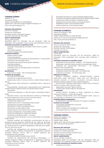 220 / JUDE%u021aUL CARA%u0218-SEVERIN WWW.GHIDULPRIMARIILOR.ROCOMUNA G%u00c2RNICAdres%u0103: nr. 77Cod po%u0219tal: 327215Telefon: 0731-306981; Fax: 0372-897791; Adresa de e-mail: comunagarnic@primariagarnic.roURL: www.primariagarnic.roPersoane din primarie:Primar: Ion SporeaViceprimar: Iosif PiececSecretar General:%u00a0Gheorghe%u00a0PopescuContabil: Francisca Simona%u00a0Ro%u015fu%u00a0Sate %u00een administra%u021bie:G%u00eernic, Padina MateiSuprafa%u021ba:%u00a0 4642 ha; Intravilan:%u00a0 146 ha; Extravilan:%u00a0 4496 ha; Popula%u021bia:%u00a01457; Gospod%u0103rii:%u00a0448; Locuin%u021be:%u00a0462; Gr%u0103dini%u021be:%u00a02; %u0218coli:%u00a02; Activitati economice si specifice zonei:Activit%u0103%u0163i me%u015fte%u015fug%u0103re%u015fti (t%u00e2mplari, rotari, fierari, curelari)Comer%u0163Alimenta%u0163ie public%u0103Produc%u0163ie bobine %u015fi transformatoareObiective turistice:Pe%u015ftera Padina MateiGrota Haiduceasc%u0103Complexul de mori de ap%u0103 din localitatea G%u00e2rnic - func%u0163ionabileRezerva%u0163ia natural%u0103 Valea MareComplexul de cascade de pe p%u00e2r%u00e2ul Mod%u0103vi%u0163aCascada Mod%u0103vi%u021baCascada Bur%u0103ul Mare Complexul de mori de ap%u0103 pe R%u00e2ul GramenscaCasa ceheasc%u0103Evenimente:Ruga Padina Matei %u2013 08 si 09 SeptembrieProiecte de investi%u0163ii:%u00ceN CURS DE REALIZAREAlimentare cu ap%u0103 localitate G%u00e2rnicModernizare str%u0103zi %u00een comuna G%u00e2rnic, satele Padina Matei %u0219i G%u00e2rnicModernizare str%u0103zi interioare %u00een localitatea G%u00e2rnic -%u00eentocmire P.U.G.%u00cembun%u0103t%u0103%u021birea infrastructurii educa%u021bionale prin reabilitarea, modernizarea %u0219i dotarea %u0218colii Gimnaziale Padina MateiREALIZATEConstruire Gr%u0103dini%u021b%u0103 cu 2 S%u0103li de clas%u0103 %u00een localitatea PadinaMatei%u00cenfiin%u021bare Centru Local de informare turistic%u0103 %u015fi marketingul serviciilor legate de turismul rural %u00een comuna G%u00e2rnicModernizare sediu prim%u0103rie G%u00e2rnicAchizi%u021bionare utilaje I.S.U.Modernizare drum %u00een localitatea Padina MateiAchizi%u021bionare pomp%u0103 sumersibil%u0103Alimentare cu Ap%u0103 %u00een localitatea G%u00e2rnicAlimentare cu Ap%u0103 Padina MateiModernizate DC 49 Moldova Noua-Padina MateiConstruire dispensar uman Padina MateiConstruire hal%u0103 pentru utilajele din dotareAchizi%u021bionare Buldoexcavator + accesoriiConstruire ziduri de sprijin %u00een urma calamit%u0103%u021bilor %u00een localitatea Padina MateiDotarea unit%u0103%u0163ilor de %u00eenv%u0103%u0163%u0103m%u00e2nt preuniversitar de stat cu echipamente de protec%u0163ie medical%u0103 de tip m%u0103%u015fti de protec%u0163ie medical%u0103, dezinfectan%u0163i, precum %u015fi alte echipamente de acest tip, necesare pentru a preveni r%u0103sp%u00e2ndirea coronavirusului SARSCov-2 %u00een Comuna GarnicAchizi%u021bia de echipamente din domeniul tehnologiei %u2013 IT mobile, respectiv tablete, echipamente %u0219i dispozitive necesare activit%u0103%u021bii didactice pentru elevii %u0219i cadrele didactice din %u00eenv%u0103%u021b%u0103m%u00e2ntul preuniversitarAmenajare platforme pietruite pe DC49Achizi%u021bia de echipamente din domeniul tehnologiei %u2013 IT mobile, respectiv tablete, echipamente %u0219i dispozitive necesare activit%u0103%u021bii didactice pentru elevii %u0219i cadrele didactice din %u00eenv%u0103%u021b%u0103m%u00e2ntul preuniversitarProiecte de viitorExtindere alimentare cu ap%u0103 localitatea Padina MateiCanalizare menajer%u0103 %u0219i sta%u021bie de epurare localitatea Padina MateiModernizare re%u021bea stradal%u0103 %u00een localitate G%u00e2rnicModernizare iluminat public %u00een localitatea G%u00e2rnicReabilitare C%u0103min Cultural Padina MateiDotare Dispensar Uman Padina MateiCOMUNA GLIMBOCAAdres%u0103: Principal%u0103, nr. 367Cod po%u0219tal: 327220Telefon: 0255-534378; Fax: 0255-534378; Adresa de e-mail: primaria.glimboca@gmail.comURL: www.primaria-glimboca.roPersoane din primarie:Primar: ing. Novac Petru Cr%u00eesnic%u00a0Viceprimar:%u00a0Pavel%u00a0M%u00e2%u0163uSecretar General:%u00a0Florin%u00a0N%u0103sl%u0103uContabil:%u00a0Ana%u00a0Groza%u00a0Sate %u00een administra%u021bie:Cartier BoiaSuprafa%u021ba:%u00a0 4246 ha; Intravilan:%u00a0 161 ha; Extravilan:%u00a0 4085 ha; Popula%u021bia:%u00a0 1733; Gospod%u0103rii:%u00a0 541; Locuin%u021be:%u00a0 633; Gr%u0103dini%u021be:%u00a0 1; %u0218coli:%u00a01; Activitati economice si specifice zonei:Exploatare carier%u0103 de piatr%u0103 %u201candezit%u201d - SC DAMIACONS SAExploatare mas%u0103 lemnoas%u0103 (conform amenajament silvic)Produc%u0163ie de componente electronice - SC CUSTOM PRODUCTION EUROPE SRLPrelucrare mas%u0103 lemnoas%u0103 - gatere lemnExploatare z%u0103c%u0103minte marmur%u0103 - SC CORSO SRLCre%u015fterea animalelor %u00a0- SC Ristomagic SRL%u00a0Obiective turistice:Biserica Ortodox%u0103 Cre%u0219tin%u0103 Glimboca-Poart%u0103 hramul %u201cAdormirea Maicii Domnului%u201d, zidit%u0103 %u00eentre anii 1790-1794 %u0219i renovat%u0103 periodic cu ajutorul locuitorilor comunei Biserica Baptist%u0103 Glimboca Biserica Penticostal%u0103 GlimbocaMonumentul %u201cOsta%u0219ului Necunoscut%u201d, aflat %u00een fa%u021ba cimitirului, ridicat %u00een cinstea eroilor c%u0103zuti %u00een lupt%u0103A%u015fez%u0103m%u00e2nt monahal %u201cSf%u00e2nta Treime%u201dTunelul iubiri Poiana M%u0103rului Muntele MicEvenimente:Hramul Bisericii Ortodoxe %u015fi Ruga, organizate la nivelul comunei Glimboca - %u00een data de 15 augustFestival: Comemorarea celor doi coreografi Afilon La%u0163cu %u015fi Ioan Muntean, %u00een fiecare an %u00een luna octombrieFacilit%u00e3%u0163i oferite investitorilor:Concesion%u0103ri %u015fi %u00eenchirieri de terenuri la pre%u0163uri accesibileProiecte de investi%u0163ii:Amenajarea peisagistic%u0103 a comuneiImplementare PUGSistem integrat de management al de%u015feurilorAmenajare zon%u0103 %u201cLac Pesc%u0103rie%u201dCOMUNA GORUIAAdres%u0103: Principal%u0103, nr. 211Co