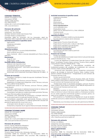 232 / JUDE%u021aUL CARA%u0218-SEVERIN WWW.GHIDULPRIMARIILOR.ROCOMUNA T%u00c2RNOVAAdres%u0103: Principal%u0103, nr. 376Cod po%u0219tal: 327385Telefon: 0255-234704; Fax: 0255-234707; Adresa de e-mail: primaria@tarnova.roURL: www.tarnova.roPersoane din primarie:Primar : Walter FloreaViceprimar%u00a0: Ion ChinceaSecretar General :Ionela L%u0103crimioara Fara%u00a0Contabil: Rodica Loredana%u021aibru%u00a0Suprafa%u021ba:%u00a0 4966 ha; Intravilan:%u00a0 123 ha; Extravilan:%u00a0 4843 ha; Popula%u021bia:%u00a01636; Gospod%u0103rii:%u00a0584; Locuin%u021be:%u00a0584; Gr%u0103dini%u021be:%u00a01; %u0218coli:%u00a01; Activitati economice si specifice zonei:Agricultur%u0103Cre%u0219terea animalelorAgroturism Exploatare lemnObiective turistice:Trasee cuprinse %u00een circuitul ENDUROM%u00c2NIAZona turistic%u0103 Lacul SecuZona montan%u0103 - ofer%u0103 o atrac%u0163ie deosebit%u0103 prin flora %u015fi fauna specific%u0103Evenimente:Ruga Sf. IoanRuga Pa%u0219te %u2013 3 zileFacilit%u00e3%u0163i oferite investitorilor:Reduceri de impozite %u015fi taxeConcesion%u0103ri teren la pre%u0163 avantajosPosibilit%u0103%u0163i agroturism - Lacul Secu, zona BratovaFor%u0163%u0103 de munc%u0103Acces la DN 58 prin DC 89 (asfaltat) T%u00e2rnova-Soceni, 7 kmAcces spre zona industriala Municipiul Re%u0219i%u021ba pe DJ 582A %u2013 9 kmProiecte de investi%u0163ii:Canalizare menajer%u0103 %u0219i sta%u0163ie de epurare localitatea T%u00e2rnova,%u00a0 Comuna T%u00e2rnovaAlimentare cu ap%u0103 T%u00e2rnova, comuna T%u00e2rnovaReabilitare %u015fi modernizare dispensar uman T%u00e2rnova, comuna%u00a0 T%u00e2rnova, jude%u021bul%u00a0Cara%u015f-SeverinModernizare str%u0103zi %u00een sat T%u00e2rnova, comuna T%u00e2rnova, jude%u0163ul%u00a0 Cara%u015f-SeverinExtindere, optimizare %u0219i realizare bran%u015famente la re%u021beaua de%u00a0 Alimentare cu ap%u0103 %u0219i realizare racorduri la re%u021beaConsolidare, extindere %u015fi modernizare sediu prim%u0103ria T%u00e2rnova,%u00a0 Comuna%u00a0T%u00e2rnova jude%u021bul%u00a0Cara%u015f-SeverinInstalarea unei capacit%u0103%u021bi de producere a energiei electrice%u00a0 din surse solare pentru %u0219coala gimnazial%u0103%u00a0T%u00e2rnovaConsolidarea%u00a0 capacit%u0103%u021bii %u0219colii gimnaziale T%u00e2rnova, comuna T%u00e2rnova, jude%u021bul Cara%u015f-Severin, %u00een vederea gestion%u0103rii situa%u021biei de pandemie generat%u0103 de virusul sars-cov-2%u00a0Amenajare teren de sport cu nocturn%u0103%u00centre%u0163inere %u015fi repara%u021bii drum agricol Mlana-Aninoasa- Br%u0103ni%u015fteCOMUNA TICVANIU MAREAdres%u0103: Str. Principal%u0103, Nr. 1Cod po%u0219tal: 327395Telefon: 0255-577100; Fax: 0255-577101; Adresa de e-mail: primar@primariaticvaniumare.roURL: www.primariaticvaniumare.roPersoane din primarie:Primar: Ciprian Sebastian M%u0103ce%u0219anuViceprimar: Mihaela Iasmina SimaSecretar General: Delia Karla D%u0103nil%u0103Sate %u00een administra%u021bie:Ticvaniu Mare, Ticvaniu Mic, C%u00e2rnecea, Sec%u0103%u015feniSuprafa%u021ba:%u00a0 12059 ha; Intravilan:%u00a0 367 ha; Extravilan:%u00a0 11692 ha; Popula%u021bia:%u00a0 2066; Gospod%u0103rii:%u00a0 400; Locuin%u021be:%u00a0 768; Gr%u0103dini%u021be:%u00a0 4; %u0218coli:%u00a03; Activitati economice si specifice zonei:Cre%u015fterea animalelorAgricultur%u0103Apicultur%u0103Pomicultur%u0103Prelucrare lemn Firme reprezentative:CIUTA INDIMEX S.R.L.Produc%u0103tori locali: SMAC-VUC N. NICOLETA P.F.A., FAM. VESELINProduse locale: Miere de albina, FructeObiective turistice:CIMITIRUL TICVANIU-MARE (crucile de piatr%u0103)Ruinele bisericii cre%u0219tine de la C%u00e2rneceaEvenimente:Ruga satului Ticvaniu Mare (20 iulie)Ruga satului Ticvaniu Mic ( a doua zi de Pa%u0219ti)Ruga satului Sec%u0103%u0219eni (ziua de Rusali)Ruga satuui C%u00e2rnecea (15 august)Facilit%u00e3%u0163i oferite investitorilor:Concesion%u0103ri de teren arabil %u015fi pomicolTeren forestierProiecte de investi%u0163ii:Fonduri europene:-Lucr%u0103ri de reabilitare %u0219i modernizare C%u0103min Cultural C%u00e2rnecea (valoare 672.834,64 lei + TVA)- Lucr%u0103ri de reabilitare %u0219i modernizare Casa de Cultura %u201cVirgil Birou%u201d, localitatea Ticvaniu Mare, comuna Ticvaniu Mare, jude%u021bul Cara%u0219-Severin (valoare 1.195.625,38 lei + TVA)-Transformarea digital%u0103 %u0219i %u00eembun%u0103t%u0103%u021birea condi%u021biilor de %u00eenv%u0103%u021b%u0103m%u00e2nt-predare ale unit%u0103%u021bilor de %u00eenv%u0103%u021b%u0103m%u00e2nt din comuna Ticvaniu Mare (valoare 390.068,77 lei + TVA)- Construire parc fotovoltaic pentru acoperirea consumului propriu de energie al Comunei Ticvaniu Mare, Jude%u021bul Cara%u0219Severin (valoare 411,000.00 lei + TVA)(aceasta nu are contract de finan%u021bare semnat %u00eenc%u0103)Fonduri guvernamentale:-%u00cenfiin%u021bare canalizare %u00een comuna Ticvaniu Mare, sat Ticvaniu Mare, jude%u021bul Cara%u0219-Severin (valoare 11 667 651.26 lei + TVA)(aceasta nu are contract de finan%u021bare semnat %u00eenc%u0103)-Modernizare str%u0103zi %u00een localitatea Sec%u0103%u0219eni, comuna Ticvaniu Mare, jude%u021bul Cara%u0219-Severin (valoare 15.467.966,36 lei)(aceasta nu are contract de finan%u021bare semnat %u00eenc%u0103)Realiz%u0103ri:%u00cenceperea lucr%u0103rilor la C%u0103minul cultural Virgil Birou Ticvaniu Mare %u0219i C%u0103minul Cultural C%u00e2rnecea-odat%u0103 cu finalizarea lucr%u0103rilor se vor putea organiza evenimente publice %u0219i private, pentru c%u0103 p%u00e2n%u0103 acum cl%u0103dirile nu au putut fi utilizatePrin proiectul cu Transformarea Digital%u0103 am reu%u0219it s%u0103 dot%u0103m %u0219colile din comun%u0103 cu table interactive, echipamente IT %u0219i mobilier nou Ob%u021binerea unui microbuz %u0219colar nou din patrimoniul MDLPACOMUNA TOPLE%u0162Adres%u0103: nr. 97Cod po%u0219tal: 327400Telefon: 0255-522409; Fax: 0255-522409; Adresa de e-mail: primaria.toplet@gmail.comURL: http://www.primaria-toplet.ro/Persoane din primarie:Primar: Ion BlidaruViceprimar: Ion Sorin ManeaSecretar Gener