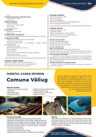 WWW.GHIDULPRIMARIILOR.RO JUDE%u021aUL CARA%u0218-SEVERIN / 233 CFRActivitati economice si specifice zonei:Cre%u015fterea animalelorPiscicultur%u0103Obiective turistice:Sfinxul B%u0103n%u0103%u0163eanApeductele %u201cMariei Tereza%u201dMori de ap%u0103Via TransilvanicaEvenimente:Nedeile din cele 2 sate Ziua eroilorFacilit%u00e3%u0163i oferite investitorilor:Amenaj%u0103ri hidrotehnice pe cursurile de ap%u0103 %u0219i parcuri eolieneProiecte de investi%u0163ii:Reabilitare %u0219i dotore C%u0103min Cultural Tople%u021bGr%u0103dini%u021ba 2 grupe Tople%u0219Reabilitare,modernizare %u0219i eficientizare%u00a0 energie %u0219coala gimnazial%u0103Tople%u021bPist%u0103%u00a0biciclete Tople%u021bReabilitare pod peste r%u00e2ul CernaDrumuri Tople%u021bDrum Stoghir%u00cenfiin%u021bare Serviciu%u00a0de distribuire a gazelor naturaleDotore %u0219coala Tople%u021bAlimentare cu ap%u0103%u00a0%u0219i%u00a0canalizareCOMUNA TURNU RUIENIAdres%u0103: Principal%u0103, nr. 45; Cod po%u0219tal: 327405Adresa de e-mail: primariaturnuruieni@gmail.comURL: http://www.comuna-turnuruieni.ro/COMUNA VARADIAAdres%u0103: Principala, nr. 379Cod po%u0219tal: 327420Telefon: 0769-065253; Adresa de e-mail: primaria_varadia@yahoo.comURL: http://primariavaradiacs.ro/COMUNA V%u0102LIUGAdres%u0103: Principal%u0103, nr. 56Cod po%u0219tal: 327415Telefon: 0255-235691; Fax: 0255-235601; Adresa de e-mail: prim_valiug@yahoo.comURL: www.primaria-valiug.roPersoane din primarie:Primar: Gheorghe Sorin BlagaViceprimar: Petru Alin MarcuSecretar General: Diana DragomirContabil: Mihaela SuruSate %u00een administra%u021bie:V%u0103liug, Zona turistic%u0103 Crivaia, Muntele SemenicSuprafa%u021ba:%u00a0 9798,7 ha; Intravilan:%u00a0 320,94 ha; Extravilan:%u00a0 9477,76 ha; Popula%u021bia:%u00a0643; Gospod%u0103rii:%u00a01000; Locuin%u021be:%u00a01000; Gr%u0103dini%u021be:%u00a01; %u0218coli:%u00a01; Cum se ajunge in localitate:Accesul %u00een comuna V%u0103liug se realizeaz%u0103 din municipiul Re%u0219i%u021ba (DN 58) sau din comuna Slatina Timi%u0219 (DN 6) prin interemediul DJ 582. Distan%u021ba %u00eentre Re%u0219i%u021ba %u0219i V%u0103liug este de 24 km, iar %u00eentre V%u0103liug %u0219i Slatina Timi%u0219 de 36 km.Activitati economice si specifice zonei:Comer%u021b, turism, alimentatie public%u0103, transport, prelucrarea lemnului, construc%u021bii