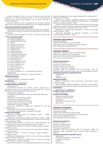 WWW.GHIDULPRIMARIILOR.RO JUDE%u021aUL C%u0102L%u0102RA%u0218I / 237Drumul jude%u021bean DJ411 (4 km pe teritoriul comunei) se desprinde din drumul na%u021bional DN41 la km 7+301 pe partea dreapt%u0103, drum care asigur%u0103 leg%u0103tura %u00eentre comuna Chirnogi %u0219i comuna Radovanu. Drumul comunal DC27 se desprinde din drumul na%u021bional DN41 la km 7+101 pe partea dreapt%u0103, drum care asigur%u0103 legatura %u00eentre comuna Chirnogi %u0219i comuna Mitreni.Activitati economice si specifice zonei:Dezvoltarea %u00een ultimii ani a sectorului serviciilor %u015fi comer%u0163ului.Poten%u0163ial suficient de materie prim%u0103 agricol%u0103 pentru industria alimentar%u0103.Poten%u021bial mare de for%u021b%u0103 de munc%u0103 %u00een agricultur%u0103 (60% din totalul popula%u021biei ocupate).Firme reprezentative:S.C. AGRO CHIRNOGI S.A.S.C. CHEMTRANSFERT S.R.L.S.A. DACIAS.C. SILVATICA COM S.R.L.S.C. NEKSIO LAND S.R.L.S.C. DENIAGRODARI S.R.L.S.C. DIDROM S.R.L.S.C. MILEX 2000 S.R.L.S.A. CERES CHIRNOGIP.F.A. COARN%u0102 M. DUMITRUP.F.A. P%u0102TURAN FLORIANS.C. MICROTRANS S.R.L.S.C. MAGICOM S.R.L.S.C. LIFE CONSTRUCT S.R.L.S.C. BELLA VENEZIA S.R.L.S.C. OACHY GAMES S.R.L.S.C. PRO VIDEO S.R.L.S.C. RANDIS AGRO S.R.L.Produc%u0103tori locali:S.C. AGRO CHIRNOGI S.A. - produc%u0103tori de cerealeMe%u0219te%u0219ugari: Artache Lucian %u0219i Coarn%u0103 Iulian - prelucrare lemnObiective turistice:Muzeul ChirnogiCasa %u021a%u0103r%u0103neasc%u0103 - CE RANDIS HORSESEvenimente:Ziua localit%u0103%u021bii - 8 septembrie.Facilit%u00e3%u0163i oferite investitorilor:OPORTUNIT%u0102%u021aI:Posibilitatea acces%u0103rii de fonduri pentru agricultur%u0103 %u015fi dezvoltare rural%u0103 prin programele de finan%u0163are ale Uniunii Europene, B%u0103ncii Mondiale %u015fi a altor institu%u0163iiAtragerea de investitoriAtragerea investi%u0163iilor externe pe baza Strategiei elaborate.FACILIT%u0102%u021aI:Rezerve suficiente de ap%u0103 potabil%u0103Alimentare cu energie electric%u0103Nivel %u00eenalt de telefonizare %u0219i internetAcces la cale de comunicatie naval%u0103Alimentare cu ap%u0103 %u00een localitateProiect de extindere a re%u021belei de canalizare %u00een curs de implementareAsigurarea de locuri %u00een %u015fcoli %u0219i gr%u0103dini%u021be Construirea unei gradinite cu program prelungit.Proiecte de investi%u0163ii:Asigurarea infrastructurii de transport verde - ITS/alte infrastructuri TIC - PNRRAsigurarea infrastructurii pentru transportul verde %u2013 piste pentru biciclete la nivel local/metropolitan; in cadrul UAT Chirnogi, jude%u021bul C%u0103l%u0103ra%u0219i- PNRRElaborarea/actualizarea %u00een format GIS a documenta%u021biilor de amenajare a teritoriului %u0219i de planificare urban%u0103 - PNRRModernizare trotuare %u00een comuna Chirnogi, jude%u021bul%u00a0 C%u0103l%u0103ra%u0219i - BUGETUL LOCALAmenajare centru civic Comuna Chirnogi, jude%u021bul C%u0103l%u0103ra%u0219i - BUGETUL LOCALAsfaltare str%u0103zi %u00een comuna Chirnogi, jude%u021bul C%u0103l%u0103ra%u0219i - BUGETUL LOCALAsfaltare %u0219i modernizare str%u0103zi %u00een comuna Chirnogi, jude%u021bul C%u0103l%u0103ra%u0219i - ANGHEL SALIGNYModernizare drumuri de interes local %u00een comuna Chirnogi, jude%u021bul C%u0103l%u0103ra%u0219i - ANGHEL SALIGNYSprijinirea investi%u021biilor %u00een noi capacit%u0103%u021bi de producere a energiei electrice produs%u0103 din surse regenerabile pentru autoconsum - FONDURI EUROPENEDotarea cu mobilier, materiale didactice %u0219i echipamente digitale a unit%u0103%u021bilor de %u00eenv%u0103%u021b%u0103m%u00e2nt preuniversitar %u0219i a unit%u0103%u021bilor conexe din jude%u021bul C%u0103l%u0103ra%u0219i - PNRRProiectul regional de dezvoltare a infrastructurii de ap%u0103 %u0219i ap%u0103 uzat%u0103 pentru aria de operare a Operatorului Regional %u00een jude%u021bele C%u0103l%u0103ra%u0219i %u0219i Ialomi%u021ba %u00een perioada 2014-2020 - POIMReabilitare %u0219i modernizare dispensar %u00een comuna Chirnogi, jude%u021bul C%u0103l%u0103ra%u0219i - PNDL Construire gradinit%u0103 cu program prelungit %u00een comuna Chirnogi, jude%u021bul C%u0103l%u0103ra%u0219i.- PNDLCOMUNA C%u0102SCIOARELECod po%u0219tal: 917020Telefon: 0242-525046; Fax: 0242-525046; Adresa de e-mail: contact@comunacascioarele.roURL: https://comunacascioarele.ro/COMUNA CHISELETAdres%u0103: %u015eos. C%u0103l%u0103ra%u015fi, Nr.215; Cod po%u0219tal: 917030Telefon: 0242-521023; Fax: 0242-521025; Adresa de e-mail: primariachiselet@yahoo.comURL: www.primariachiselet.roPersoane din primarie:Primar: Mihail%u00a0PenuViceprimar: Tudorel%u00a0Fotin%u00a0Secretar General:%u00a0 Sofia%u00a0Dun%u0103%u00a0Contabil:%u00a0 Constantin%u00a0GheorgheSuprafa%u021ba:%u00a0 8557 ha; Intravilan:%u00a0 365 ha; Extravilan:%u00a0 8192 ha; Popula%u021bia:%u00a03200; Gospod%u0103rii:%u00a01140; Locuin%u021be:%u00a01434; Gr%u0103dini%u021be:%u00a02; %u0218coli:%u00a01; Activitati economice si specifice zonei:Agricultur%u0103Comer%u0163Prest%u0103ri serviciiObiective turistice:Biserica %u201cAdormirea Maicii Domnului%u201d, monument istoric construit %u00een 1860Situl arheologic %u201cM%u0103gura Fundeanca%u201d situat %u00een Lunca Dun%u0103rii, la o distan%u0163%u0103 de aproximativ 3,5 km de fluviul Dun%u0103rea%u00a0%u015fi la 2 km de satEvenimente:Ziua comunei - 8 septembrieFacilit%u00e3%u0163i oferite investitorilor:Terenuri arabileProiecte de investi%u0163ii:Construire parc fotovoltaicAsfaltare str%u0103zi comunaleCanalizareExtindere alimentare cu ap%u0103Teren sportCOMUNA CIOC%u0102NE%u015eTIAdres%u0103: str.Principala , nr 291; Cod po%u0219tal: 917035Telefon: 0242-337305; Fax: 0242-337292; Adresa de e-mail: primaria@primaria-ciocanesti.roprimariaciocanesti@yahoo.comURL: https://primaria-ciocanesti.ro/Persoane din primarie:Primar: Dan%u00a0Velicu%u00a0Viceprimar: Vasilic%u0103 TudorSecretar: Valentin C%u0103linContabil: Ionu%u021b%u00a0IordacheSuprafa%u021ba:%u00a0 12715 ha; Intravilan:%u00a0 529 ha; Extravilan:%u00a0 12186 ha; Popula%u021bia:%u0