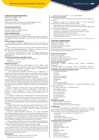 WWW.GHIDULPRIMARIILOR.RO JUDE%u021aUL CLUJ / 265COMUNA M%u0102GURI-R%u0102C%u0102T%u0102UAdres%u0103: Principal%u0103, nr. 88Cod po%u0219tal: 407365Telefon: 0744-613879; Adresa de e-mail: primariamaguriracatau@yahoo.comURL: http://www.comunamaguriracatau.ro/Persoane din primarie:Primar: Alexandru LivescuSecretar General: Vidrean NicoletaContabil: Sucal%u0103 MarianaSate %u00een administra%u021bie:M%u0103guri-R%u0103c%u0103t%u0103u, M%u0103guri, Muntele ReceSuprafa%u021ba:%u00a026894,62 ha; Intravilan:%u00a0919,89 ha; Extravilan:%u00a025974,73 ha; Popula%u021bia:%u00a0 2297; Gospod%u0103rii:%u00a0 1160; Locuin%u021be:%u00a0 948; Gr%u0103dini%u021be:%u00a0 3; %u0218coli:%u00a03; Cum se ajunge in localitate:Satul M%u0103guri R%u0103c%u0103t%u0103u, re%u015fedin%u0163%u0103 de comun%u0103 este situat la 40km fa%u0163%u0103 de re%u015fedin%u0163a de jude%u0163 Cluj-Napoca %u015fi la 22 km fa%u0163%u0103 de Gil%u0103u.Cele 2 sate apar%u0163in%u0103toare sunt situate, fa%u0163%u0103 de re%u015fedin%u0163a M%u0103guri R%u0103c%u0103t%u0103u , la urm%u0103toarele distan%u0163e: - M%u0103guri cu acces auto la 10,5 km - pe DJ107T (6km.)%u015fiDC110C(4,5km.)pietruit. Exist%u0103 %u015fi un acces direct,mai scurt, din M%u0103guri R%u0103c%u0103t%u0103u de 2,5km.-pe DC111 . -Muntele Rece - la 11km - pe DJ107S(9km)asfaltat %u015fiDC110(2km.)Activitati economice si specifice zonei:Colectarea fructelor de p%u0103dure %u0219i a ciupercilorTurismulCre%u0219terea animalelorObiective turistice:Din punct de vedere al importan%u0163ei pe care o de%u0163ine, este necesar%u0103 punerea %u00een eviden%u0163%u0103 a turismului. Aceast%u0103 zon%u0103 este cuprins%u0103 %u00een Parcul Na%u0163ional al Mun%u0163ilor Apuseni %u015fi %u00eenglobeaz%u0103 %u00een arealul s%u0103u c%u00e2teva rezerva%u0163ii naturale:-%u00a0 de importan%u0163%u0103 na%u0163ional%u0103: Turb%u0103ria de la C%u0103p%u0103%u0163%u00e2na, cu valoare botanic%u0103, pus%u0103 sub protec%u0163ie %u00een anul 1969, fiind situat%u0103 pe creasta principal%u0103 a masivului Gil%u0103u-Muntele Mare, %u00eentre v%u00e2rfurile C%u0103p%u0103%u0163%u00e2na %u015fi Balomireasa, la altitudinea de 1600 m-%u00a0 de importan%u0163%u0103 jude%u0163ean%u0103: Cheile Dumitresei (cu valoare peisagistic%u0103); ob%u00e2r%u015fia Some%u015fului Rece %u015fi ob%u00e2r%u015fia R%u0103c%u0103t%u0103ului (cu valoare cinegetic%u0103); defileul Some%u015fului Rece %u015fi defileul R%u0103c%u0103t%u0103ului (cu valoare mixt%u0103) %u2013 defileul R%u0103c%u0103t%u0103ului se afl%u0103 pe teritoriul a dou%u0103 comune: M%u0103guri-R%u0103c%u0103t%u0103u %u015fi M%u0103ri%u015fel %u015fi a fost pus sub protec%u0163ie %u00een anul 1994.Printre atrac%u021biile turistice din comuna M%u0103guri-R%u0103c%u0103t%u0103u se num%u0103r%u0103 %u0219i Turb%u0103ria de la Dame%u0219, C%u0103rbunare %u2013 producere de c%u0103rbune %u00een mod tradi%u021bional %u00een satul Muntele Rece, Concurs Ecvestru %u2013 Proba de trac%u021biune %u0219i Concurs frumuse%u021be bovine %u2013 %u00een luna iulie%u00cen categoria obiectivelor turistice poate fi inclus%u0103 aduc%u0163iunea din Valea Ierii %u015fi acumularea Some%u015fu Rece II, construit%u0103 %u00een anul 1978, cu un baraj de 40 m %u00een%u0103l%u0163ime, acumulare care se afl%u0103 %u00een vecin%u0103tatea drumului comunal DC110A, %u00eens%u0103 la o altitudine cu circa 40 m mai cobor%u00e2t%u0103 dec%u00e2t acesta, ceea ce m%u0103re%u015fte pitorescul peisajului.O importan%u0163%u0103 destul de ridicat%u0103 prezint%u0103 %u015fi bisericile de lemn ale a%u015fez%u0103rii, precum %u015fi M%u0103n%u0103stirea Borde%u015fti care, tocmai prin amplasarea ei %u00eentr-o zon%u0103 %u00eenalt%u0103, destul de izolat%u0103, determin%u0103 includerea sa %u00een traseele turi%u015ftilor,Comuna M%u0103guri-R%u0103c%u0103t%u0103u dispune de zone favorabile dezvolt%u0103rii bazelor de agrement care ar putea fi folosite tot timpul anului, at%u00e2t vara (pentru pescuit, v%u00e2n%u0103toare, terenuri de sport), c%u00e2t %u015fi iarna (p%u00e2rtii de schi, s%u0103niu%u0163e, bob %u2013 o p%u00e2rtie de schi exist%u0103 deja %u00een satul M%u0103guri, iar prim%u0103ria a%u015fez%u0103rii %u00ee%u015fi propune amenajarea alteia %u00een zona central%u0103 a re%u015fedin%u0163ei, mai exact la Hoanca Trencii)Tuturor acestor obiective cu valoare natural%u0103 %u015fi peisagistic%u0103, li se adaug%u0103 valoarea etnografic%u0103 a c%u0103tunelor, determinat%u0103 de structura risipit%u0103 a a%u015fez%u0103rii, fiind vorba de %u201esate cr%u00e2ng%u201d Pentru facilitarea vizit%u0103rii acestor obiective turistice, se pot urma traseele turistice marcate (%u00een num%u0103r de patru) sau chiar cele nemarcate (%u00een num%u0103r de 5), care leag%u0103 %u00eentre ele diferite forme de relief, obiective turistice %u015fi c%u0103tune %u015fi care %u00eencep sau se continu%u0103 pe teritoriul comunelor %u00eenvecinate.Evenimente:Pastoral de var%u0103 %u2013 ie%u0219itul cu animale %u00een munteS%u0103rb%u0103toarea Sf. Petru %u0219i Pavel %u2013 29 iunie Festivalul %u201eJunii satului%u201d %u2013 %u00een luna decembrieProiecte de investi%u0163ii:Realizare centru de depozitare %u015fi prelucrare fructe p%u0103dure %u015fi ciuperciRealizare centru de colectare lapte %u00een zona montan%u0103/Proiectarea unei fabrici de produse lactateDezvoltarea unui centru de sprijin pentru afaceriModernizarea drumurilor comunale %u015fi a drumurilor s%u0103te%u015fti din comuna M%u0103guri-R%u0103c%u0103t%u0103uConstruire, reabilitare %u015fi extindere poduri %u015fi pode%u0163eExtindere %u015fi modernizare sistem de alimentare cu ap%u0103Reabilitare re%u0163ea de iluminat publicAmenajarea unor puncte de picnic pentru turi%u015ftiAmenajare p%u00e2rtie de schiCOMUNA M%u0102N%u0102STIRENIAdres%u0103: Principal%u0103, nr. 222Cod po%u0219tal: 407370Telefon: 0264-375201, 375266; Fax: 0264-375201; Adresa de e-mail: primariamanastireni@yahoo.comURL: http://primariamanastireni.ro/