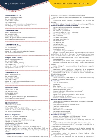 28 / JUDE%u021aUL ALBA WWW.GHIDULPRIMARIILOR.ROCOMUNA MIR%u0102SL%u0102UAdres%u0103: Principal%u0103, nr. 283Cod po%u0219tal: 517470Telefon: 0358-405066; Fax: 0358-405065; Adresa de e-mail: primaria.miraslau@yahoo.comURL: https://www.primariamiraslau.ro/COMUNA MOGO%u015eAdres%u0103: Principal%u0103, nr. 3ACod po%u0219tal: 517480Telefon: 0258-700100; Adresa de e-mail: primariamogos@yahoo.comURL: https://comunamogos.ro/COMUNA NO%u015eLACAdres%u0103: Principal%u0103, nr. 78Cod po%u0219tal: 517515Telefon: 0258-889101; Adresa de e-mail: primarianoslac@yahoo.comURL: www.primarianoslac.roORA%u0218UL OCNA MURE%u015eAdres%u0103: Nicolae Iorga, nr. 27Cod po%u0219tal: 515700Telefon: 0258-871217 , 871257; Fax: 0258-871217; Adresa de e-mail: contact@primariaocnamures.roURL: primariaocnamures.roCOMUNA OCOLI%u015eAdres%u0103: Principal%u0103, nr. 152Cod po%u0219tal: 517525Telefon: 0258-700888; Fax: 0258-700888; Adresa de e-mail: primariaocolis@yahoo.comURL: www.ocolis-ab.roCOMUNA OHABAAdres%u0103: Viilor, nr. 188Cod po%u0219tal: 517530Telefon: 0258-854511; Fax: 0258-854502; Adresa de e-mail: primariaohaba_ab@yahoo.comURL: https://comunaohaba.ro/COMUNA PIANU Adres%u0103: Principal%u0103, nr. 94Cod po%u0219tal: 517537Telefon: 0258-761111; Fax: 0258-761112; Adresa de e-mail: primariacomuneipianu@yahoo.comURL: www.primariapianu.roPersoane din primarie:Primar: Ing. Jr. Marin Ioan%u00a0PetruseViceprimar:%u00a0Ovidiu Iancu%u00a0Voi%u0219anSecretar General: Jr. Camelia Cristina%u00a0Catargiu%u00a0Contabil: Ec. %u00a0Mihai%u00a0C%u0103ru%u0163%u00a0Rela%u021bii publice Insp. Gabriela BodeaSate %u00een administra%u021bie:Pianu de Jos, Pianu de Sus, Strungari, Purc%u0103re%u0163i, PlaiuriSuprafa%u021ba:%u00a0 122067 ha; Intravilan:%u00a0 450 ha; Extravilan:%u00a0 11817 ha; Popula%u021bia:%u00a0 3375; Gospod%u0103rii:%u00a0 1205; Locuin%u021be:%u00a0 1249; Gr%u0103dini%u021be:%u00a0 5; %u0218coli:%u00a05; Cum se ajunge in localitate:Prin :partea de sud a jude%u021bului Alba %u00een apropiere de DN 7 la 15 km de Municipiul Alba Iulia %u0219i la 13 km de Municipiul Sebe%u0219DN 7 la 15 km de Municipiul Alba Iulia %u0219i la 13 km de Municipiul Sebe%u0219Autostrada A1-Mol dreapta km.316+560, Mol st%u00e2nga km 316+360 DJ 704 A-Sebe%u0219,- Pianu de Jos-Pianu de Sus-Strungari-R%u0103chitaActivitati economice si specifice zonei:Comer%u021b, alimenta%u021bie public%u0103, agricultur%u0103, turism, sportFirme reprezentative:SC Triticum Agro TineretSC Centru Medical %u2018%u2019Laura C%u0103tan%u0103%u2019 SRLSC Agrostea Product SRLSC Enderol SRLSC Hobit Integral SRLSC Blaga Alion Hemflax SC Hemhlet SRLSC Selcofan SRLSC Adimat SRLDronkers Grond SRLHotel Golf PianuProduc%u0103tori locali:Apicultori locali, peroane fizice:Neghiu Gheorghe Pianu de Sus, Irimie Ioan Pianu de Sus, Ivan Vasile Pianu de Jos, One%u021b Gheorghe Pianu de Jos, Stefani Ioana Pianu de Jos, Troanche%u0219 Petru Pianu de Jos, Medrea Toma Pianu de Sus, Iepure Elisabeta Purc%u0103re%u021bi, Ciucur Marin Purc%u0103re%u021biProduse locale:Produse din lapte - lactate - BIOLACT ST%u0102NU%u0218 SRL Pianu de SusProduse tradi%u021bionale din carne VIR%u0218LI SBUCIUMELEA Pianu de SusSt%u00e2na %u201cM%u0103rgini%u201d %u2013 punct tradi%u021bional de prelucrare a laptelui, Pianu de JosFabricarea p%u00e2inii, fabricarea pr%u0103jiturilor %u0219i a produselor proaspete de patiserie BRUTARIA VASITEO SRL Pianu de Sus Ferma de ou%u0103 G%u0102LBENEL SC TRITICUM SEBES AGROTINERET SRL SRL, Pianu de JosObiective turistice:Toate informa%u021biile pot fi ob%u021binute prin Centrul de informare %u0219i orientare turistic%u0103 din Pianu de JosEvenimente:Ziua de %u201c1 Decembrie%u201dFii satuluiZiua EroilorTurnee De Golf %u201dPaul Tomi%u021b%u0103%u201dFestivalul Sportului S%u0103tescHramul M%u0103n%u0103stirii %u201cSf%u00e2ntul Ioan Botez%u0103torul%u201dC%u00e2rnilejul %u0219a%u0219ilorSf%u00e2ntul Ioan Botez%u0103torul-Biserica Pianu de JosSfin%u021birea st%u00e2nilor de la Recea Festival %u201eArmonii %u0219i Gusturi la Pianu%u201d Jude%u021bul AlbaFacilit%u00e3%u0163i oferite investitorilor:Teren pentru amplasarea obiectivelor turistice %u0219i industrialeFacilit%u0103%u021bi fiscaleSimplificarea procedurii administrativeTelefonie mobil%u0103%u00a0%u0219i fix%u0103Re%u021bea internetDrumuri %u0219i str%u0103zi %u00eentre%u021binuteConexiune la Autostrad%u0103Re%u021bele de ap%u0103 %u0219i canalizareProiecte de investi%u0163ii:Proiect Tehnic-Asfaltare DC 171 Strungari %u2013 ToneaProiect Tehnic-Asfaltare DC 52 Purc%u0103re%u021biExtindere re%u021bele apa/canal %u00een Pianu de Sus %u0219i Pianu de Josetapa ICaptare aduc%u021biune distribu%u021bie ap%u0103 %u00een Plaiuri %u0219i Strungari;%u00cenfiin%u021bare Sistem Inteligent de Distribu%u021bie Gaze Naturale %u00een Comuna Pianu, jude%u021bul AlbaSistem inteligent de management al datelor spa%u021biale din comuna Pianu, pentru integrarea acestora %u00eentr-o solu%u021bie GIS, C10-I1.2-2979Amenajare str%u0103zi %u00een comuna Pianu, jude%u021bul Alba (Strungari,Str%u00e2mturi %u0219i R%u00e2ului)Amenajare alei pietonale, loc de recreere %u0219i petrecere a
