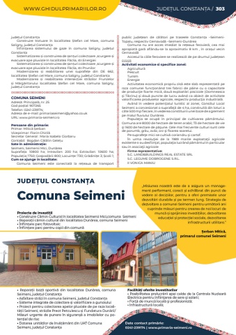 WWW.GHIDULPRIMARIILOR.RO JUDE%u021aUL CONSTAN%u021aA / 303jude%u021bul Constan%u021baConstruire trotuare %u00een localitatea %u0218tefan cel Mare, comuna Saligny, jude%u021bul Constan%u021ba%u00cenfiin%u021barea sistemului de gaze %u00een comuna Saligny, jude%u021bul Constan%u021baSistematizarea %u0219i construirea de %u0219an%u021buri colectoare ,scurgere %u0219i evacuare ape pluviale %u00een localitatea F%u0103clia, str.EnergieiSistematizarea %u0219i construirea de %u0219an%u021buri colectoare ,scurgere %u0219i evacuare ape pluviale %u00een localitatea F%u0103clia, str.PrunilorModernizarea %u0219i reabilitarea unei suprafe%u021be din DE 662, localitatea %u0218tefan cel Mare, comuna Saligny, jude%u021bul Constan%u021baModernizarea %u0219i reabilitarea intersec%u021biei str%u0103zilor Frunzelor %u0219i M%u0103rg%u0103ritarului localitatea %u0218tefan cel Mare, comuna Saligny, jude%u021bul Constan%u021baCOMUNA SEIMENIAdres%u0103: Principal%u0103, nr. 25Cod po%u0219tal: 907265Telefon: 0241-239174; Adresa de e-mail: primariaseimeni@yahoo.co.ukURL: www.primaria-seimeni.roPersoane din primarie:Primar: Mitic%u0103%u00a0%u0218erbanViceprimar: Florin%u00a0Chiril%u0103%u00a0Secretar General :%u00a0Maria Isabela%u00a0Ciorbaru%u00a0Contabil:%u00a0 Bogdan C%u0103t%u0103lin%u00a0Gele%u021buSate %u00een administra%u021bie:Seimeni, Seimenii Mici, Dun%u0103reaSuprafa%u021ba:%u00a0 10800 ha; Intravilan:%u00a0 200 ha; Extravilan:%u00a0 10600 ha; Popula%u021bia:%u00a01750; Gospod%u0103rii:%u00a0800; Locuin%u021be:%u00a0730; Gr%u0103dini%u021be:%u00a03; %u0218coli:%u00a01; Cum se ajunge in localitate:Comuna Seimeni este conectat%u0103%u00a0 la re%u021beaua de transport public jude%u021bean de c%u0103l%u0103tori pe traseele Constan%u021ba %u2013SeimeniTopalu, respectiv Cernavod%u0103%u00a0%u2013Seimeni-Dun%u0103reaComuna nu are acces imediat la re%u021beaua ferovier%u0103, cea mai apropiat%u0103%u00a0 gar%u0103%u00a0 afl%u00e2ndu-se la aproximativ 8 km , %u00een ora%u0219ul vecin Cernavod%u0103Accesul la c%u0103ile feroviere se realizeaz%u0103%u00a0de pe drumul jude%u021bean DJ223Activitati economice si specifice zonei:Agricultur%u0103PescuitTurismEnergieActivitatea economic%u0103 propriu zis%u0103 este slab reprezentat%u0103 pe raza comunei func%u0163ion%u00e2nd trei fabrici de p%u00e2ine cu o capacitate de produc%u0163ie foarte mic%u0103, dou%u0103 exploat%u0103ri piscicole (Domneasca %u015fi Tibrinu) %u015fi dou%u0103 puncte de lucru av%u00e2nd ca obiect de activitate valorificarea produselor agricole, respectiv produc%u0163ia industrial%u0103.Av%u00e2nd %u00een vedere poten%u0163ialul turistic al zonei, Consiliul Local Seimeni a concesionat o suprafa%u0163%u0103 de 4 ha, construit%u0103 din loturi a c%u00e2te 500 mp fiecare, %u00een vederea constituirii unei baze de agrement pe malul fluviului Dun%u0103rea.Popula%u0163ia se ocup%u0103 %u00een principal de cultivarea p%u0103m%u00e2ntului. Comuna are 8000 de hectare de teren arabil, 73 de hectare de vie %u015fi 1600 de hectare de p%u0103%u015fune. Cele mai frecvente culturi sunt cele de porumb, gr%u00e2u, ov%u0103z, orz %u015fi floarea soarelui.Pe suprafe%u0163e mici se cultiv%u0103 coriandru %u015fi cartof.%u00cen urma revolu%u0163iei de la 1989 marile exploata%u0163ii agricole existente s-au desfiin%u0163at, popula%u0163ia lucr%u00e2nd p%u0103m%u00e2ntul %u00een particular sau %u00een asocia%u0163ii agricoleFirme reprezentative:S.C. LAND&BUILDINGS REAL ESTATE SRLS.C. LEGUME DOBROGENE S.R.L. II VONICA MANIU