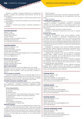 306 / JUDE%u021aUL COVASNA WWW.GHIDULPRIMARIILOR.RODotarea cu mobilier, materiale didactictice %u0219i echipamente digitale a unit%u0103%u021bilor de %u00eenv%u0103%u021b%u0103m%u00e2nt preuniversitar de stat din ora%u0219ul BaraoltCre%u0219terea eficien%u021bei energetice a cl%u0103dirii %u0218colii generale Gaal Mozes, BaraoltEficientizarea %u0219i modernizarea sistemului de iluminat public %u00een ora%u0219ul BaraoltAFM Rabla Investi%u021bii %u00een infrastructura public%u0103 a spitalelor or%u0103%u0219ene%u0219ti %u0219i municipaleCOMUNA BARCANIAdres%u0103: nr. 266Cod po%u0219tal: 527010Telefon: 0267- 372525; Fax: 0267- 372525; Adresa de e-mail: barcani@cv.e-adm.rooffice@primariabarcani.roURL: https://primariabarcani.ro/COMUNA B%u0102%u0162ANIAdres%u0103: Principal%u0103, nr. 474Cod po%u0219tal: 527020Telefon: 0267-355426, 355008; ax: 0267-355426, 355008; Adresa de e-mail: primariabatani@gmail.com, bacon@cosys.ro, baconkozseg@yahoo.com.roURL: www.nagybacon.roPersoane din primarie:Primar: Nagy Istv%u00e1n CsongorViceprimar: Nagy G%u00e1borSecretar General: Ol%u00e1h VeronkaContabil: Vinczi Roz%u00e1liaSate %u00een administra%u021bie:B%u0103%u0163anii Mari, Herculian, Aita Seac%u0103, B%u0103%u0163anii Mici, Ozunca B%u0103iSuprafa%u021ba:%u00a0 221 km%u00b2; Intravilan:%u00a0 4,93 km%u00b2; Extravilan:%u00a0 216,07 km%u00b2; Popula%u021bia:%u00a0 4725; Gospod%u0103rii:%u00a0 1603; Locuin%u021be:%u00a0 2219; Gr%u0103dini%u021be:%u00a0 4; %u0218coli:%u00a04; Cum se ajunge in localitate:Accesul %u00een re%u0219edin%u021ba comunei %u00een localitatea B%u0103%u021banii Mari se realizeaz%u0103 prin drumul jude%u021bean DJ 122 de unde prin drumurile comunale DC 44,DC45, DC46 %u0219i DC47 se pot ajunge %u00een celelalte localit%u0103%u021bi B%u0103%u021banii Mici, Herculian, Aita Seac%u0103 %u0219i Ozunca B%u0103i.Activitati economice si specifice zonei:Cele mai importante activit%u0103%u021bi economice %u00een comuna B%u0103%u021bani sunt, zootehnia %u2013 cre%u0219terea animalelor, exploatarea masei lemnoase %u0219i prelucrarea acestuia, prelucrarea laptelui, comer%u021bul, etc.Firme reprezentative:SC Ceramica Vinczi SRLSC Grig SRLProduc%u0103tori locali:Bodor Jakab PFA %u2013 Ozunca B%u0103i (br%u0103nz%u0103 artizanal%u0103 - Uzonka)Sc Agyagcserep Srl- B%u0103%u021banii Mari( %u021bigle %u0219i c%u0103r%u0103mid%u0103)Produse locale:Lapte de vac%u0103 produse lactate, %u021bigle %u0219i c%u0103r%u0103mid%u0103Me%u0219te%u0219ugari:Fabricare %u021biglei %u0219i c%u0103r%u0103midei Sc%u00a0Agyagcserep Srl- B%u0103%u021banii MariObiective turistice:Furnalul Bodvaj %u0219i casa memorial%u0103 Benedek Elek - B%u0103%u021banii MiciMla%u0219tina cu ap%u0103%u00a0 mineral%u0103%u00a0 Ozunca B%u0103i, o rezerva%u021bie natural%u0103 protejat%u0103, unde cresc flori %u0219i plante foarte rare precum: floarea de cenu%u0219%u0103 sau planta carnivor%u0103 Drosera, %u00eens%u0103 o atrac%u021bie importanta o constituie %u0219i izvorul de ap%u0103 mineral%u0103 de la Pisztrangos, bogat%u0103 %u00een calciu, ale c%u0103rei depuneri au realizat un con imens de tuf%u0103 calcaroas%u0103Evenimente:Balul strugurilorComemorarea eroilor c%u0103zu%u021bi%u00a0%u00een cele dou%u0103 r%u0103zboaie mondialeComemorarea evenimentelor din 26 septembrie 1944 Aita Seac%u0103Zilele localit%u0103%u021bilorFacilit%u00e3%u0163i oferite investitorilor:O prim%u0103%u00a0 modalitate de implicare o constituie asigurarea accesului la facilit%u0103%u021bi a investitorilor const%u00e2nd %u00een furnizarea utilit%u0103%u021bilor de natur%u0103 aliment%u0103rii cu ap%u0103, energie electric%u0103, gaz etc., %u0219i furnizarea de utilit%u0103%u021bi sociale cum este %u00eenv%u0103%u021b%u0103m%u00e2nt, cultura, s%u0103n%u0103tate etc.Acordarea avizelor necesare %u00een sistem prioritar. Facilit%u0103%u0163i %u00een executarea infrastructurii de acces %u00een spa%u0163iile produc%u0103toare.Proiecte de investi%u0163ii:%u00cen%u0163elegere de Cooperare %u00eentre comuna B%u0102%u021aANI, Jude%u021bul Covasna din Rom%u00e2nia %u015fi localitatea PUSZTACSALAD din UNGARIA%u00a0din anul 2022 aprobat prin HCL nr. 30 din 12 iulie 2022. Nu exist%u0103 contribu%u021bie b%u0103ne%u0219ti, vizite reciproce. %u00cen%u021belegere de Cooperare %u00eentre comuna B%u0102%u021aANI localitatea HERCULIAN, Jude%u021bul Covasna din Rom%u00e2nia %u015fi localitatea MEZOGYAN din UNGARIA %u00a0din anul 1995 f%u0103r%u0103 documente oficiale nu exist%u0103 contribu%u021bie b%u0103ne%u0219ti, vizite reciproce%u00cen%u021belegere de Cooperare %u00eentre comuna B%u0102%u021aANI localitatea B%u0102%u021aANII MICI, Jude%u021bul Covasna din Rom%u00e2nia %u015fi localitatea SOLY din UNGARIA%u00a0 din anul 1995 f%u0103r%u0103 documente oficiale nu exist%u0103 contribu%u021bie b%u0103ne%u0219ti, vizite reciproce%u00cen%u021belegere de Cooperare %u00eentre comuna B%u0102%u021aANI localitatea B%u0102%u021aANII MARI, Jude%u021bul Covasna din Rom%u00e2nia %u015fi localitatea SZOLNOK din UNGARIA%u00a0 din anul 1990 f%u0103r%u0103 documente oficiale nu exist%u0103 contribu%u021bie b%u0103ne%u0219ti, vizite reciproce%u00cen%u021belegere de Cooperare %u00eentre comuna B%u0102%u021aANI localitatea AITA SEAC%u0102, Jude%u021bul Covasna din Rom%u00e2nia %u015fi localitatea OKANY din UNGARIA %u00a0 din anul 1990 f%u0103r%u0103 documente oficiale nu exist%u0103 contribu%u021bie b%u0103ne%u0219ti, vizite reciproce%u00cen%u021belegere de Cooperare %u00eentre comuna B%u0102%u021aANI localitatea B%u0102%u021aANII MARI, Jude%u021bul Covasna din Rom%u00e2nia %u015fi localitatea K%u00c9M%u00c9ND din SLOVACIA %u00a0din anul 1995 f%u0103r%u0103 documente oficiale nu exist%u0103 contribu%u021bie b%u0103ne%u0219ti, vizite reciproce.COMUNA BELINAdres%u0103: Principal%u0103, nr. 390Cod po%u0219tal: 527030Telefon: 0267-355760; Fax: 0267-355779; Adresa de e-mail: primariabelin@yahoo.comURL: http://www.primariabelin.ro/COMUNA BIXADAdres%u0103: Principal%u0103, nr. 558Cod po%u0219tal: 527116Tele