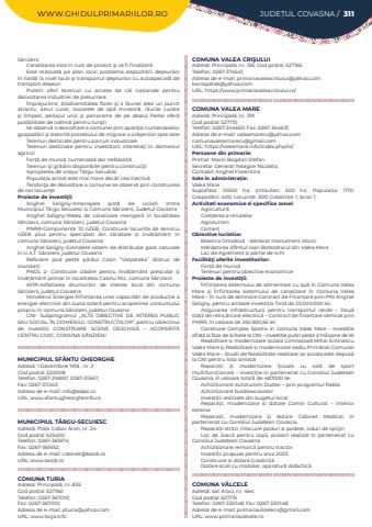 S%u00e2nzieniCanalizarea este %u00een curs de proiect %u015fi va fi finalizat%u0103Este rezolvat%u0103 pe plan local problema depozit%u0103rii de%u015feurilor %u00een hald%u0103 la nivel local %u015fi transportul de%u015feurilor cu autospecial%u0103 de transport de%u015feuriPutem oferi terenuri cu accese de c%u0103i na%u0163ionale pentru dezvoltarea industriei de prelucrare%u00cemprejurime, biodiversitatea florei %u015fi a faunei este un punct atractiv, aerul curat, izvoarele de ap%u0103 mineral%u0103, r%u00e2urile curate %u015fi limpezi, peisajul unic %u015fi panorama de pe dealul Perk%u00f6 ofer%u0103 posibilitate de odihn%u0103 pentru turi%u015ftiSe observ%u0103 o dezvoltare a comunei prin apari%u0163ia numeroaselor gospod%u0103rii %u015fi datorit%u0103 procesului de migrare a or%u0103%u015fenilor spre sateTerenuri destinate pentru parcuri industrialeTerenuri destinate pentru investitorii interesa%u0163i %u00een domeniul agricolFor%u0163%u0103 de munc%u0103 numeroas%u0103 dar nefolosit%u0103Terenuri %u015fi gr%u0103dini disponibile pentru construc%u0163iiApropierea de ora%u015ful T%u00e2rgu SecuiescPopula%u0163ia activ%u0103 este mai mare dec%u00e2t cea inactiv%u0103Tendin%u0163a de dezvoltare a comunei se observ%u0103 prin construirea de noi locuin%u0163eProiecte de investi%u0163ii:Anghel Saligny-Amenajare pist%u0103 de cicli%u0219ti %u00eemtre Municipiul%u00a0T%u00e2rgu Secuiesc %u0219i Comuna%u00a0S%u00e2nzieni, Jude%u021bul%u00a0CovasnaAnghel Saligny-Re%u021bea de canalizare menajer%u0103 %u00een%u00a0 localitatea S%u00e2nzieni, comuna%u00a0S%u00e2nzieni, jude%u021bul%u00a0CovasnaPNRR-Componen%u021ba 10 nZEB, Construire locuin%u021be de serviciu nZEB plus pentru speciali%u0219ti din s%u0103n%u0103tate %u0219i %u00eenv%u0103%u021b%u0103m%u00e2nt %u00een comuna%u00a0S%u00e2nzieni, jude%u021bul%u00a0CovasnaAnghel Saligny-Extindere sistem de distribu%u021bie gaze naturale %u00een U.A.T. S%u00e2nzieni, jude%u021bul%u00a0CovasnaRefacere pod peste p%u00e2r%u00e2ul Ca%u0219in %u201cVarpataka%u201d distrus de inunda%u021biiPNDL 2- Construire cl%u0103dire pentru %u00eenv%u0103%u021b%u0103m%u00e2nt pre%u0219colar %u0219i %u00eenv%u0103%u021b%u0103m%u00e2nt primar %u00een localitatea Casinu Mic, comuna%u00a0S%u00e2nzieniAFIR-Asfaltarea drumurilor de interes local din comuna S%u00e2nzieni, jude%u021bul CovasnaMinisterul Energiei-%u00cenfiin%u021barea unei capacit%u0103%u021bi de produc%u021bie a energiei electrice din sursa solar%u0103 pentru acoperirea consumului propriu %u00een comuna S%u00e2nzieni, jude%u021bul Covasna CNI- Subprogramul %u201eALTE OBIECTIVE DE INTERES PUBLIC SAU SOCIAL %u00ceN DOMENIUL CONSTRUCTIILOR%u201d, pentru obiectivul de investi%u021bii CONSTRUIRE SCEN%u0102 DESCHIS%u0102 %u2013 ACOPERIT%u0102 CENTRU CIVIC, COMUNA S%u00c2NZIENIMUNICIPIUL SF%u00c2NTU GHEORGHEAdres%u0103: 1 Decembrie 1918 , nr. 2Cod po%u0219tal: 520008Telefon: 0267-316957, 0267-315611; Fax: 0267-311243; Adresa de e-mail: info@sepsi.roURL: www.sfantugheorgheinfo.roMUNICIPIUL T%u00c2RGU-SECUIESCAdres%u0103: Pia%u021ba G%u00e1bor %u00c1ron, nr. 24Cod po%u0219tal: 525400Telefon: 0267-361974; Fax: 0267-361652; Adresa de e-mail: cabinet@kezdi.roURL: www.kezdi.roCOMUNA TURIAAdres%u0103: Principal%u0103, nr. 835Cod po%u0219tal: 527160Telefon: 0267-367010; Fax: 0267-367010; Adresa de e-mail: pturia@yahoo.comURL: www.torja.infoCOMUNA VALEA CRI%u015eULUIAdres%u0103: Principal%u0103, nr. 136; Cod po%u0219tal: 527165Telefon: 0267-374541; Adresa de e-mail: primariavaleacrisului@yahoo.comkorospatak@yahoo.comURL: https://www.primariavaleacrisului.ro/COMUNA VALEA MAREAdres%u0103: Principal%u0103, nr. 319Cod po%u0219tal: 527170Telefon: 0267-344653; Fax: 0267-344631; Adresa de e-mail: valeamarecv@yahoo.comcomunavaleamarecv@gmail.comURL: https://valeamare.info/index.php/ro/Persoane din primarie:Primar: Marin Bogdan %u0218tefanSecretar General: Neagoe%u00a0NicoletaContabil: Anghel FlorentinaSate %u00een administra%u021bie:Valea MareSuprafa%u021ba:%u00a0 10500 ha; Intravilan:%u00a0 500 ha; Popula%u021bia:%u00a0 1170; Gospod%u0103rii:%u00a0400; Locuin%u021be:%u00a0300; Gr%u0103dini%u021be:%u00a01; %u0218coli:%u00a01; Activitati economice si specifice zonei:Agricultur%u0103Cre%u0219terea animalelorAgroturismComer%u0163Obiective turistice:Biserica Ortodox%u0103 - declarat monument istoricM%u0103n%u0103stirea Sf%u00e2ntul Ioan Botez%u0103torul din Valea MareLac de Agrement %u0219i p%u00e2rtie de schiFacilit%u00e3%u0163i oferite investitorilor:For%u0163%u0103 de munc%u0103Terenuri pentru obiective economiceProiecte de investi%u0163ii:%u00cenfiin%u021barea sistemului de alimentare cu ap%u0103 %u00een Comuna Valea Mare %u0219i %u00cenfiin%u021barea sistemului de canalizare %u00een Comuna Valea Mare %u2013 %u00cen curs de semnare Contract de Finan%u021bare prin PNI Anghel Saligny, pentru ambele %u00eenvesti%u021bia fiind de 23.000.000 lei.Asigurarea infrastructurii pentru transportul verde %u2013 Dou%u0103 sta%u021bii de re%u00eenc%u0103rcare electric%u0103%u00a0%u2013 Contract de finan%u021bare semnat prin PNRR, %u00een valoare de 292.900,65 leiConstruire Complex Sportiv %u00een Comuna Valea Mare %u2013 investi%u021bie aflat%u0103 la faza de licita%u021bie la CNI %u2013 investi%u021bie putin peste 2 milioane de leiReabilitare %u0219i modernizare %u0218coala Gimnazial%u0103 Mihai Eminescu Valea Mare %u0219i Reabilitare %u0219i modernizare sediu Prim%u0103riei Comunei Valea Mare %u2013 Studii de fezabilitate realizare iar %u0219coala este depus%u0103 la CNI pentru lista sintez%u0103Repara%u021bii %u0219i modernizare %u0218coala cu sal%u0103 de sport multifunc%u021bional%u0103 %u2013 investi%u021bie %u00een parteneriat cu Consiliul Jude%u021bean Covasna, %u00een valoare total%u0103 de 487000 leiAchizi%u021bionare autoturism Duster %u2013 prin programul RablaAchizitionare buldoexcavatorInvesti%u021bii realizate din bugetul localRepara%u021bii, modernizare %u0219i dotare Camin Cultural %u2013 interior exteriorRepara%u021bii, modernizar