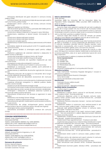WWW.GHIDULPRIMARIILOR.RO JUDE%u021aUL GALA%u021aI / 359%u00cenfiin%u0163area distribu%u021biei de gaze naturale %u00een comuna Grivi%u021ba, jude%u021bul Gala%u0163i%u00cenfiin%u0163are sistem de canalizare %u015fi sta%u0163ie de epurare ap%u0103 uzat%u0103 %u00een comuna Grivi%u021ba, jude%u021bul Gala%u0163iModernizare c%u0103min cultural %u00een sat Grivi%u021ba, comuna Grivi%u021ba, jude%u021bul Gala%u0163iRepara%u021bii capitale iaz C%u0103lm%u0103%u021buiIdei de proiecte (propuneri pentru perioada 2021-2028, pentru care nu s-au realizat %u00eenc%u0103 demersuri)Construire %u0219i dotare Gr%u0103dini%u021b%u0103 cu 3 grupe %u00een satul C%u0103lm%u0103%u021buiModernizare, reabilitare %u0219i dotare %u015ecoala Gimnazial%u0103 Nr. 1 Grivi%u021baConstruire %u0219i dotare sal%u0103 sport %u015fcolar%u0103Construire %u0219i dotare sal%u0103 sport %u015fcolar%u0103Construire complex sportivReabilitarea %u0219i modernizarea sediului administrativ al Prim%u0103riei Grivi%u021baExtinderea re%u0163elei de acces gratuit la WI-FI %u00een spa%u0163iile publice din comuna GrivitaForaje pentru f%u00e2nt%u00e2ni %u0219i amenajare spa%u021bii pentru ad%u0103pat animalePlatforme subterane de colectare selectiv%u0103 a de%u0219eurilor %u00een satele Grivi%u021ba %u0219i C%u0103lm%u0103%u021buiConstruire/ amenajare %u0219i dotare Centru de TineretConstruire/ amenajare platform%u0103 gunoi de grajd%u00cemp%u0103durire %u0219i realizarea de suprafe%u021be %u00eemp%u0103durite pe raza comune Grivi%u021baEcologizare %u0219i educa%u021bie ecologic%u0103 %u00een comun%u0103%u00cembun%u0103t%u0103%u0163irea infrastructurii rutiere %u00een comuna Grivi%u021baReabilitare %u0219i construire poduri, pode%u021be, punti pietonale %u0219i spa%u021bii verzi %u00een comuna Grivi%u021baModernizarea %u015fi reabilitarea drumurilor agricole din Comuna Grivi%u021baRefacerea %u0219an%u021burilor de scurgere %u0219i a trotuarelor de-a lungul drumurilor aferente Comunei Grivi%u021baAmenajarea zonei de dezvoltare economic%u0103 din Comuna Grivi%u021ba%u00cenfiin%u0163area unui centru comunitar pentru %u00eenv%u0103%u021bare permanent%u0103Cre%u0219terea eficien%u021bei energetice %u00een cl%u0103dirile publice (Sediu Consiliu Local %u0219i Scoal%u0103)Infrastructur%u0103 de alimentare energie verde%u00cenfiin%u0163area/ construirea/ modernizarea %u015fi dotarea infrastructurii sociale destinate serviciilor sociale de tipul centrelor reziden%u0163ialeAmenajare / restaurare %u0219i reabilitare obiective turistice %u015fi marcare de trasee turistice tematiceDezvoltarea infrastructurii de recreere %u0219i agrement %u00een satul C%u0103lm%u0103%u021buiRealizarea unei strategii Smart VillagePunerea %u00een valoare a patrimoniului cultural imaterial localDezvoltarea de aplica%u021bii mobile pentru promovarea turistic%u0103 a Comunei GrivitaAchizi%u0163ionarea de utilaje, echipamente pentru serviciile publice locale %u0219i Serviciul Voluntar pentru Situa%u0163ii de Urgen%u021b%u0103Amenajare centru comunal (pia%u021bet%u0103)Dezvoltarea activit%u0103%u021bilor culturale %u0219i artistice din comuna Grivi%u021baCOMUNA INDEPENDEN%u0162AAdres%u0103: Tudor Vladimirescu, nr. 81Cod po%u0219tal: 807165Telefon: 0236-826907, 826900; Fax: 0236-826900; Adresa de e-mail: ndependenta@gl.e-adm.roURL: https://www.primaria-independenta.ro/COMUNA IVE%u015eTIAdres%u0103: General Eremia Grigorescu, nr. 451Cod po%u0219tal: 807170Telefon: 0236-866004; Fax: 0236-833726; Adresa de e-mail: ivesti@gl.e-adm.roURL: http://www.comunaivestiprimar.roPersoane din primarie:Primar: Maricel GheocaSecretar General: Toma ZanfiricaContabil: Caraiman Tincu%u021baSate %u00een administra%u021bie:Ive%u015fti, Buce%u015ftiSuprafa%u021ba:%u00a0 8995 ha; Intravilan:%u00a0 891 ha; Extravilan:%u00a0 8064 ha; Popula%u021bia:%u00a0 10225; Gospod%u0103rii:%u00a0 3855; Locuin%u021be:%u00a0 3387; Gr%u0103dini%u021be:%u00a0 5; %u0218coli:%u00a03; Licee:%u00a01; Cum se ajunge in localitate:Comuna Ive%u015fti este a%u015fezat%u0103 %u00een partea de sud vest a jude%u0163ului Gala%u0163i, de-a lungul %u0219oselei D.N. 25, la 53 km de municipiul Gala%u0163i %u015fi 18 km de municipiul Tecuci. Se %u00eenvecineaz%u0103 la nord cu comuna Umbr%u0103re%u015fti, la sud cu comuna Lie%u015fti, la est cu comuna Grivi%u0163a %u015fi la vest cu r%u00e2ul Siret- grani%u0163a cu jude%u0163ul Vrancea. Comuna Ive%u015fti este situat%u0103 %u00een zona de c%u00e2mpie, pe partea st%u00e2ng%u0103 a raului B%u00e2rlad care str%u0103bate comuna de la nord la sudActivitati economice si specifice zonei:Agricultura va r%u0103m%u00e2ne probabil %u0219i pe viitor func%u021bia economic%u0103 de baz%u0103 a localit%u0103%u021bii cu ramuri poten%u021biale de dezvoltare cum ar fi culturile cerealiere, plantele tehnice (floarea soarelui, soia), legumele %u0219i zarzavaturile, viile %u0219i pomii fructiferi %u0219i bine%u00een%u021beles cre%u0219terea animalelor (p%u0103s%u0103ri, porci, cornute mici, bovine).Ar putea fi diversificat%u0103 paleta de plante de cultur%u0103 cu alte soiuri de legume %u0219i zarzavat, plante medicinale %u0219i aromatice, dar %u0219i nectaro-polinifere, ceea ce ar spori poten%u021bialul apicol din zon%u0103 deja important.S-ar putea avea %u00een vedere %u0219i cre%u0219terea de P%u0102S%u0102RI.Firme reprezentative:SC VIMINI SRLSC VANBET SRLSC DOGEMAR SRLSC PRODGRAIN SRL ETCMe%u0219te%u0219ugari:Artizanat me%u0219te%u0219ug%u0103resc %u00een arta prelucr%u0103rii fieruluiObiective turistice:Casa memorial%u0103 %u201cHortensia Papadat Bengescu%u201d inclus%u0103 %u00een patrimoniul jude%u0163eanBiserica Sf%u00e2ntul Mare Mucenic GheorgheHanul de la Ive%u015fti Centrul de S%u0103n%u0103tate %u0219i Educa%u021bie IvestiEvenimente:Festivalul Vinului, edi%u021bie anual%u0103Localit%u0103%u021bi %u00eenfr%u0103%u021biteComuna Ivancea %u2013 Republica MoldovaFacilit%u00e3%u0163i oferite investitorilor:Conform legii %u00een vigoareProiecte de investi%u0163ii:Reabilitare %u0219i dotare c%u0103min 