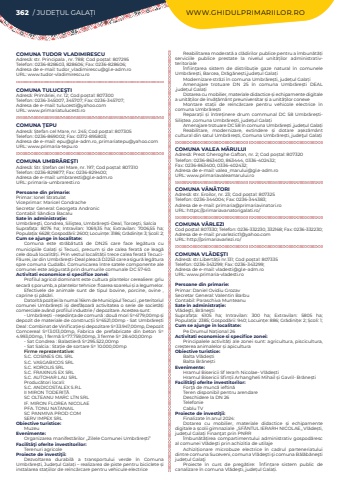 362 / JUDE%u021aUL GALA%u021aI WWW.GHIDULPRIMARIILOR.ROCOMUNA TUDOR VLADIMIRESCUAdres%u0103: str. Principala , nr. 788; Cod po%u0219tal: 807295Telefon: 0236-828603, 828606; Fax: 0236-828606; Adresa de e-mail: tudor_vladimirescu@gl.e-adm.roURL: www.tudor-vladimirescu.roCOMUNA TULUCE%u015eTIAdres%u0103: Prim%u0103riei, nr. 12; Cod po%u0219tal: 807300Telefon: 0236-345007, 345707; Fax: 0236-345707; Adresa de e-mail: tulucesti@yahoo.comURL: www.primariatulucesti.roCOMUNA %u0162EPUAdres%u0103: %u0218tefan cel Mare, nr. 245; Cod po%u0219tal: 807305Telefon: 0236-869002; Fax: 0372-895803; Adresa de e-mail: epu@gl.e-adm.ro, primariatepu@yahoo.comURL: www.primaria-tepu.roCOMUNA UMBR%u0102RE%u015eTIAdres%u0103: Str. %u0218tefan cel Mare, nr. 197; Cod po%u0219tal: 807310Telefon: 0236-829877; Fax: 0236-829400; Adresa de e-mail: umbraresti@gl.e-adm.roURL: primaria-umbraresti.roPersoane din primarie:Primar: Ionel StratulatViceprimar: Maricel CondracheSecretar General: Georgeta AndronicContabil: S%u0103ndica BacaluSate %u00een administra%u021bie:Umbr%u0103re%u015fti, Condrea, Sili%u015ftea, Umbr%u0103re%u015fti-Deal, Torce%u015fti, SalciaSuprafa%u021ba:%u00a0 8076 ha; Intravilan:%u00a0 1069,35 ha; Extravilan:%u00a0 7006,55 ha; Popula%u021bia:%u00a06628; Gospod%u0103rii:%u00a02600; Locuin%u021be:%u00a03186; Gr%u0103dini%u021be:%u00a03; %u0218coli:%u00a02; Cum se ajunge in localitate:Comuna este str%u0103b%u0103tut%u0103 de DN25 care face leg%u0103tura cu municipiile Gala%u021bi %u0219i Tecuci, precum %u0219i de calea ferat%u0103 ce leag%u0103 cele dou%u0103 localit%u0103%u021bi. Prin vestul localit%u0103%u021bii trece calea ferat%u0103 TecuciF%u0103urei, iar din Umbr%u0103re%u0219ti-Deal pleac%u0103 DJ253 care asigur%u0103 leg%u0103tura spre comuna Cudalbi. Comunicarea %u00eentre satele componente ale comunei este asigurat%u0103 prin drumurile comunale DC 57-60.Activitati economice si specifice zonei:Profilul agricol dominant este cultura plantelor cerealiere: gr%u00eeu secar%u0103 %u0219 porumb, a plantelor tehnice :floarea soarelui %u0219i a legumelor.Efectivele de animale sunt de tipul bovine, porcine, ovine , caprine %u0219i p%u0103s%u0103ri.Datorit%u0103 pozi%u021biei la numai 16km de Municipiul Tecuci , pe teritoriul comunei Umbr%u0103re%u0219ti i%u0219i desf%u0103%u0219oar%u0103 activitatea o serie de societ%u0103%u021bi comerciale av%u00e2nd profilul industrie / depozitare. Acestea sunt:- Umbr%u0103re%u0219ti - re%u0219edin%u021ba de comun%u0103 : dou%u0103 mori S=4179,00mp %u0219i depozit de materiale de construc%u021bii S=6521,00mp - Sat Umbr%u0103re%u0219ti Deal : Combinat de Vinifica%u021bie %u0219i depozitare S=33.947,00mp, Depozit Comcereal S=13.013,00mp, Fabrica de prefabricate din beton S= 4.993,00mp, 1 ferm%u0103 S=77.759,00mp, 3 ferme S= 28.400,00mp- Sat Condrea : Balastier%u0103 S=295.522,00mp- Sat Salcia : Sta%u021bie de sortare S= 10.000,00mpFirme reprezentative:S.C. COSINES OIL SRLS.C. VASGABICOS SRLS.C. KOROLIS SRLS.C. FRAXINUS EX SRLS.C. AUTOHAR LAU SRLProduc%u0103tori locali:S.C. ANDICOSTALEX S.R.LII MIRON TODERI%u021a%u0102SC OLTEANU MARC LTN SRLIF. MIRON FLOREA NICOLAEPFA. TONU NATANAILSC PANMIVA PROD COM SERV IMPEX SRLObiective turistice:MuzeuEvenimente:Organizarea manifest%u0103rilor %u201eZilele Comunei Umbr%u0103re%u0219ti%u201dFacilit%u00e3%u0163i oferite investitorilor:Terenuri agricoleProiecte de investi%u0163ii:Dezvoltarea durabil%u0103 a transportului verde %u00een Comuna Umbr%u0103re%u0219ti, Jude%u021bul Gala%u021bi %u2013 realizarea de piste pentru biciclete %u0219i instalarea sta%u021biilor de re%u00eenc%u0103rcare pentru vehicule electriceReabilitarea moderat%u0103 a cl%u0103dirilor publice pentru a %u00eembun%u0103t%u0103%u021bi serviciile publice prestate la nivelul unit%u0103%u021bilor administrativteritoriale%u00cenfiin%u021barea sistem de distribu%u021bie gaze natural %u00een comunele Umbr%u0103re%u0219ti, Barcea, Dr%u0103g%u0103ne%u0219ti,jude%u021bul Gala%u021biModernizare str%u0103zi %u00een comuna Umbr%u0103re%u0219ti, jude%u021bul Gala%u021biAmenajare trotuare DN 25 %u00een comuna Umbr%u0103re%u0219ti DEAL ,jude%u021bul Gala%u021biDotarea cu mobilier, materiale didactice %u0219i echipamente digitale a unit%u0103%u021bilor de %u00eenv%u0103%u021b%u0103m%u00e2nt preuniversitar %u0219i a unit%u0103%u021bilor conexeMontare sta%u021bii de re%u00eenc%u0103rcare pentru vehicole electrice %u00een comuna Umbr%u0103re%u0219tiRepara%u021bii %u0219i %u00eentre%u021binere drum communal DC 58 Umbr%u0103re%u0219tiSili%u0219tea ,comuna Umbr%u0103re%u0219ti, jude%u021bul Gala%u021biAmenajare trotuare DC 58 %u00een comuna Umbr%u0103re%u0219ti ,jude%u021bul Gala%u021biReabilitare, modernizare, extindere %u0219i dotare a%u0219ez%u0103m%u00e2nt cultural din satul Umbr%u0103re%u0219ti, Comuna Umbr%u0103re%u0219ti, jude%u0163ul Gala%u021biCOMUNA VALEA M%u0102RULUIAdres%u0103: Preot Gheroghe Gafton, nr. 2; Cod po%u0219tal: 807320Telefon: 0236-863400, 863444, 0336-402432;Fax: 0236-863400, 0336-402432; Adresa de e-mail: valea_marului@gl.e-adm.roURL: www.primariavaleamarului.roCOMUNA V%u00c2N%u0102TORIAdres%u0103: str. Eroilor, nr. 23; Cod po%u0219tal: 807325Telefon: 0236-344004; Fax: 0236-344383; Adresa de e-mail: primaria@primariavinatori.roURL: https://primariavanatorigalati.ro/COMUNA V%u00c2RLEZICod po%u0219tal: 807330; Telefon: 0236-332230, 332168; Fax: 0236-332230; Adresa de e-mail: prvarlezict1@yahoo.comURL: http://primariavarlezi.ro/COMUNA VL%u0102DE%u015eTIAdres%u0103: str.Libert%u0103%u021bii nr.131; Cod po%u0219tal: 807335Telefon: 0236-343299; Fax: 0236-343299; Adresa de e-mail: vladesti@gl.e-adm.roURL: www.primaria-vladesti.roPersoane din primarie:Primar: Daniel Ovidiu GrozavSecretar General: Valentin Barbu%u00a0Contabil: Paraschiva MunteanuSate %u00een administra%u021bie:Vl%u0103de%u015fti, Br%u0103ne%u015ftiSuprafa%u021ba:%u00a0 6105 ha; Intravilan:%u00a0 300 ha; Extravilan:%u00a0 5805 ha; Popula%u021bia:%u00a02385; Gospod%u0103rii:%u00a0940; Locuin%u021be:%u00a0886; 