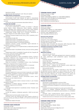 WWW.GHIDULPRIMARIILOR.RO JUDE%u021aUL ALBA / 37Spectacol colindeSpectacol de decat zilei de 1 Iunie -Bucuria copiilorFacilit%u00e3%u0163i oferite investitorilor:Acces la drumul na%u0163ional %u015fi 2 drumuri jude%u0163eneComunitatea local%u0103 este dispus%u0103 s%u0103 ajute la dezvoltarea economic%u0103 %u00een diferite domenii: turism, cresc%u0103torii pe%u015fte, ferme de animaleCentre de colectare %u015fi procesare dezvoltare IMM-uriProiecte de investi%u0163ii:INFRASTRUCTURA RUTIER%u0102:21 de str%u0103zi modernizate %u00een Unirea I %u0219i Unirea II : Parcului, Horea, Clo%u0219ca, Cri%u0219an, Abatorului, Mic%u0103, Verzelor, L%u0103utarilor, T%u00e2rgului, Decebal, G%u0103rii, Cisteiului, Morii, Pomilor, Mihai Viteazul, V%u0103ii, B%u0103lt%u0103re%u021b, C%u0103r%u0103u%u0219ilor, N%u0103dejdea, B%u0103rnu%u021biu, George Co%u0219bucModernizare strada Traian de la Prim%u0103rie intersec%u021bie cu T%u00e2rgului- l%u0103rgire la 6 metri asfalt, trotuare, rigoleRealizare trotuare strada Avram Iancu, lotul 1 (realizat) %u0219i lot 2 (%u00een execu%u021bie)Consolidare strada V%u0103iiModernizare str%u0103zi %u00een localitatea InocModernizare str%u0103zi %u00een localitatea DumbravaModernizarea str%u0103zilor %u00een localitatea M%u0103h%u0103ceniRealizare trotuare, accese propriet%u0103%u021bi, rigole betonate %u00een localitatea Unirea II- %u00een execu%u021biePrin Anghel Saligny vor fi implementate urm%u0103toarele proiecte de investi%u021bii:Reabilitare str%u0103zi %u00een localitatea Unirea, comuna Unirea, jude%u021bul AlbaModernizare str%u0103zi %u00een localit%u0103%u021bile Ciugudu de Jos, Ciugudu de Sus %u0219i Inoc, Comuna Unirea, jude%u021bul AlbaINFRASTRUCTURA DE AP%u0102:Re%u021bea de alimentare cu ap%u0103 a localit%u0103%u021bilor Unirea I, Unirea II, Dumbrava, M%u0103h%u0103ceni, Inoc, Ciugudu de Jos, Ciugudu de Susrealizare bran%u0219amente- realizat 90 %INFRASTRUCTURA DE CANALIZARE:Re%u021bea de canalizare %u00een localit%u0103%u021bile Unirea I, Inoc, Dumbrava, Mahaceni, Ciugudu de Jos, Ciugudu de SusRe%u021bea de canalizare %u00een localitatea Unirea II- %u00een execu%u021bieSERVICII SOCIALE %u0218I DE S%u0102N%u0102TATE:Construire %u0219i dotare C%u0103min de B%u0103tr%u00e2ni Unirea I (PNDR)Reabilitare dispensar comunalEDUCA%u021aIE:%u00cenfiin%u021bare gr%u0103dini%u021b%u0103 %u00een comuna Unirea-%u00een execu%u021bie- prin PNDRReabilitare energetic%u0103 %u201d%u0218coala Gimnazial%u0103 Gheorghe Maier%u201d Unirea %u2013 prin PNRR ( %u00een curs de implementare)Reabilitare energetic%u0103 %u201d%u0218coala Gimnazial%u0103 Avram Iancu%u201d Unirea ( %u00een curs de implementare)CULTURA:Reabilitare %u0219i dotare C%u0103min Cultural Unirea II- prin fonduri europene ( PNDR) Reabilitare %u0219i dotare C%u0103mine Culturale %u00een localit%u0103%u021bile Inoc, M%u0103h%u0103ceni, Ciugudu de Jos (PNDR)SPORT:Amenajare baz%u0103%u00a0sportiv%u0103 %u00een localitatea Unirea- finalizat- prin GALL PNDRAlte proiecte:Lucr%u0103ri de cadastru: %u00eent%u0103bulare gratuit%u0103 a 1200 ha de teren agricolModernizare iluminat public stradal ( AFM)%u00cenfiin%u021bare centru de colectare prin aport propriu voluntar %u00een Comuna Unirea, jud. Alba prin PNRR ( va fi semnat contractul de finan%u021bare) Reabilitare Cl%u0103dire Prim%u0103rieCOMUNA VADU MO%u0162ILORCod po%u0219tal: 517795Adresa de e-mail: vadumotilor@yahoo.comURL: https://vadumotilor.ro/COMUNA VALEA LUNG%u0102Adres%u0103: Victoriei, nr. 328BCod po%u0219tal: 517815Telefon: 0258-888102, 888193; Fax: 0258-888102,888505; Adresa de e-mail: office@comunavalealunga.ro,primaria@comunavalealunga.roURL: https://comunavalealunga.ro/COMUNA VIDRAAdres%u0103: Sat Vidra, nr. 1Cod po%u0219tal: 517825Telefon: 0258- 786575; Fax: 0258-786575; Adresa de e-mail: vidra@ab.e-adm.ro, primaria_vidra_ab@yahoo.comURL: https://primariavidra-ab.ro/Persoane din primarie:Primar: Doru%u00a0Petricele%u00a0Viceprimar: Titus Vasile Dr%u0103goiuSecretar general: Claudiu Valentin%u00a0BriciuContabil: Ioan Nicolae%u00a0OargaSuprafa%u021ba:%u00a0 6032; Intravilan:%u00a0 215; Extravilan:%u00a0 5817; Popula%u021bia:%u00a0 1532; Gospod%u0103rii:%u00a0600; Locuin%u021be:%u00a0890; Gr%u0103dini%u021be:%u00a03; %u0218coli:%u00a03; Activitati economice si specifice zonei:Cre%u0219terea animalelorPrelucrarea lemnului Agro-turismObiective turistice:Monumente ale naturii:Dealul cu melci%u00a0- rezerva%u021bie geologic%u0103%u00a0din cretacicul superior de melci pietrifica%u021bi unde predomin%u0103%u00a0 specia %u201cActteonella Giganteea%u201dCascada %u201cPisoaia%u201d%u00a0din satul Nemesi.Izvorul V%u0103ii MorilorPe%u0219tera %u201cBirolg%u201d%u00a0- neexplorat%u0103Pe%u0219tera din Poieni%u00a0(aven )-%u00eenc%u0103%u00a0neexplorat%u0103V%u00e2rful %u201cStrutu%u201d%u00a0 - singurul loc din Apuseni unde cre%u0219te rara Floare de Col%u021b%u00a0(Leontopodium Alpinum)Monumente istorice:Biserica de lemn din Goie%u0219ti,%u00a0 construit%u0103%u00a0 %u00een anul 1712, unde se p%u0103streaz%u0103%u00a0 pictura original%u0103%u00a0 cu scene biblice din anul 1790. Biserica din piatr%u0103%u00a0din satul Lunca Bisericii%u00a0construit%u0103%u00a0%u00een sec. alVI-lea denumita %u201dBiserica din ciungi%u201d. Biserica din piatr%u0103%u00a0 din Poieni%u00a0construit%u0103%u00a0%u00een anul 1684, cu icoane pictate %u00een acela%u0219i anFacilit%u00e3%u0163i oferite investitorilor:Modernizare drumuri comunaleAlimentarea cu ap%u0103%u00a0potabil%u0103Proiecte de investi%u0163ii:Alimentare cu ap%u0103%u00a0potabil%u0103%u00a0%u00een comuna VidraRepara%u021bie%u00a0capital%u0103 dispensar uman comuna VidraCre%u0219terea eficien%u021bei energetice la %u0219coala gimnaziala Ponorelcorp A %u0219i BCre%u0219terea eficien%u021bei energetice la %u0219coala gimnazial%u0103%u00a0VidraDotarea cu mobilier, materiale didactice %u0219i echipamente digitale a unit%u0103%u021bilor de %u00eenv%u0103%u021b%u0103m%u00e2nt preuniversitar %u0219i a unita%u0103%u021bilor conexeAchi