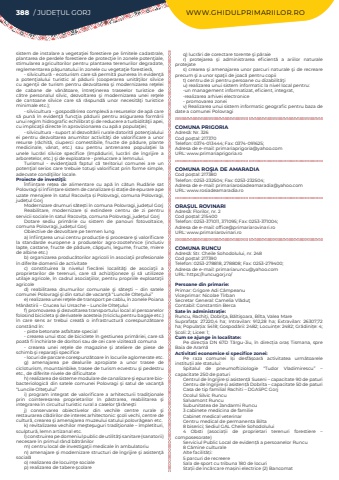 388 / JUDE%u021aUL GORJ WWW.GHIDULPRIMARIILOR.ROsistem de instalare a vegeta%u0163iei forestiere pe limitele cadastrale, plantarea de perdele forestiere de protec%u0163ie %u00een zonele poten%u0163iale, stimularea agricultorilor pentru plantarea terenurilor degradate, reglementarea p%u0103%u015funatului %u00een zonele cu vegeta%u0163ie forestier%u0103,- silvicultur%u0103 - ecoturism care s%u0103 permit%u0103 punerea %u00een eviden%u0163%u0103 a poten%u0163ialului turistic al p%u0103durii (cooperarea unit%u0103%u0163ilor silvice cu agen%u0163ii de turism pentru dezvoltarea %u015fi modernizarea re%u0163elei de cabane de v%u00e2n%u0103toare, %u00eentre%u0163inerea traseelor turistice de c%u0103tre personalul silvic, dezvoltarea %u015fi modernizarea unei re%u0163ele de cantoane silvice care s%u0103 r%u0103spund%u0103 unor necesit%u0103%u0163i turistice minimale etc.);- silvicultura - gospod%u0103rirea complex%u0103 a resurselor de ap%u0103 care s%u0103 pun%u0103 %u00een eviden%u0163%u0103 func%u0163ia p%u0103durii pentru asigurarea form%u0103rii unui regim hidrografic echilibrat %u015fi de reducere a turbidit%u0103%u0163ii apei, cu implica%u0163ii directe %u00een aprovizionarea cu ap%u0103 a popula%u0163iei;- silvicultura - suport al dezvolt%u0103rii rurale datorit%u0103 poten%u0163ialului ei pentru dezvoltarea anumitor activit%u0103%u0163i de valorificare a unor resurse (r%u0103chit%u0103, ciuperci comestibile, fructe de p%u0103dure, plante medicinale, v%u00e2nat, etc.) sau pentru antrenarea popula%u0163iei la unele lucr%u0103ri silvice specifice (%u00eemp%u0103duriri, lucr%u0103ri de %u00eengrijire a arboretelor, etc.) %u015fi de exploatare - prelucrare a lemnului.Turismul - eviden%u0163iaz%u0103 faptul c%u0103 teritoriul comunei are un poten%u0163ial serios care trebuie totu%u015fi valorificat prin forme simple, adecvate condi%u0163iilor locale.Proiecte de investi%u0163ii:%u00cenfiin%u021bare re%u021bea de alimentare cu ap%u0103 %u00een c%u0103tun Rud%u0103rie sat Polovragi %u0219i %u00eenfiin%u021bare sistem de canalizare %u0219i sta%u021bie de epurare ape uzate menajere %u00een satul Racovi%u021ba %u0219i Polovragi, comuna Polovragi, jude%u021bul GorjModernizare drumuri s%u0103te%u0219ti %u00een comuna Polovragi, jude%u021bul GorjReabilitare, modernizare %u0219i extindere centru de zi pentru servicii sociale %u00een satul Racovi%u021ba, comuna Polovragi, jude%u021bul GorjDotare sediu prim%u0103rie cu sistem de panouri fotovoltaice, comuna Polovragi, jude%u021bul GorjObiective de dezvoltare pe termen lunga)%u00a0%u00eenfiin%u0163area unui centru produc%u021bie %u0219i procesare %u015fi valorificare la standarde europene a produselor agro-zootehnice (inclusiv lapte, castane, fructe de p%u0103dure, c%u0103p%u015funi, legume, fructe, miere de albine etc.)b)%u00a0organizarea produc%u0103torilor agricoli %u00een asocia%u0163ii profesionale %u00een diferite domenii de activitatec)%u00a0 constituirea la nivelul fiec%u0103rei localit%u0103%u0163i de asocia%u0163ii a proprietarilor de terenuri, care s%u0103 achizi%u0163ioneze %u015fi s%u0103 utilizeze utilaje agricole, %u00een cadrul asocia%u0163iilor, pentru propriile exploata%u0163ii agricoled)%u00a0 reabilitarea drumurilor comunale %u015fi s%u0103te%u015fti %u2013 din satele comunei Polovragi %u015fi din satul de vacan%u0163%u0103 %u201cLuncile Olte%u0163ului%u201de)%u00a0realizarea unei re%u0163ele de transport pe cablu, %u00een zonele Poiana M%u00e2n%u0103stirii %u2013 Crucea lui Ursache %u2013 Luncile Olte%u0163uluif)%u00a0promovarea %u015fi dezvoltarea transportului local al persoanelor folosind bicicleta %u015fi derivatele acesteia (triciclu,pentru bagaje etc.) %u00een care sens ar trebui creat%u0103 o infrastructur%u0103 corespunz%u0103toare const%u00e2nd %u00een:-%u00a0piste betonate asfaltate special-%u00a0crearea unui stoc de biciclete %u00een gestiunea prim%u0103riei, care s%u0103 poat%u0103 fi %u00eenchiriate de doritori sau de cei care viziteaz%u0103 comuna-%u00a0 crearea unei re%u0163ele de magazine %u015fi ateliere de piese de schimb %u015fi repara%u0163ii specifice-%u00a0locuri de parcare corespunz%u0103toare %u00een locurile aglomerate etc.g)%u00a0 amenajarea pe dealurile apropiate a unor trasee de cicloturism, mountainbike, trasee de turism ecvestru %u015fi pedestru etc., de diferite nivele de dificultateh)%u00a0realizarea de sisteme modulare de canalizare %u015fi epurare biobacteriologic%u0103 din satele comunei Polovragi %u015fi satul de vacan%u0163%u0103 %u201cLuncile Olte%u0163ului%u201di)%u00a0program integrat de valorificare a arhitecturii tradi%u0163ionale prin cointeresarea proprietarilor %u00een p%u0103strarea, reabilitarea %u015fi integrarea %u00een circuitul turistic rural a caselor %u0163%u0103r%u0103ne%u015ftij)%u00a0 conservarea obiectivelor din vechile centre rurale %u015fi restaurarea cl%u0103dirilor de interes arhitectonic: %u015fcoli vechi, centre de cultur%u0103, crearea %u015fi amenajarea muzeului satului polovr%u0103gean etc.k)%u00a0revitalizarea vechilor me%u015fte%u015fuguri tradi%u0163ionale %u2013 %u00eempletituri, sculptur%u0103, lemn artizanal etc.l)%u00a0construirea pe domeniul public de utilit%u0103%u0163i sanitare (sanatorii) necesare %u00een primul r%u00e2nd b%u0103tr%u00e2nilorm)%u00a0centru local de investiga%u0163ii medicale %u00een ambulatoriun)%u00a0amenajare %u015fi modernizare structuri de %u00eengrijire %u015fi asisten%u0163%u0103 social%u0103o)%u00a0realizarea de locuin%u0163e socialep)%u00a0realizarea de tabere %u015fcolareq)%u00a0lucr%u0103ri de corectare torente %u015fi p%u00e2raier)%u00a0 protejarea %u015fi administrarea eficient%u0103 a ariilor naturale protejates)%u00a0crearea %u015fi amenajarea unor parcuri naturale %u015fi de recreare precum %u015fi a unor spa%u0163ii de joac%u0103 pentru copiit)%u00a0centru de zi pentru persoane cu dizabilit%u0103%u0163iu)%u00a0realizarea unui sistem informatic la nivel local pentru:-un management informatizat, eficient, integrat,-realizarea arh