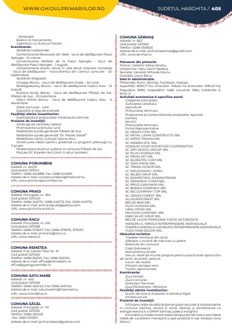 WWW.GHIDULPRIMARIILOR.RO JUDE%u021aUL HARGHITA / 405- VeresszekBiserici %u0219i monumente3 pensiuni cu 15 locuri fiecareEvenimente:Serb%u0103rile tradi%u0163ionale:Comemorarea Revolu%u0163iei din 1848 - locul de desf%u0103%u015furare Pasul Nyerges - 15 martieComemorarea b%u0103t%u0103liei de la Pasul Nyerges - locul de desf%u0103%u015furare Pasul Nyerges - 1 augustComemorarea eroilor c%u0103zu%u0163i %u00een cele dou%u0103 r%u0103zboaie mondiale - locul de desf%u0103%u015furare - monumentul din centrul comunei - 20 septembrieSerb%u0103rile religioase:%u00darnapja B%u00facs%u00fa - locul de desf%u0103%u015furare Imper - 22 iunieBoldogasszony B%u00facs%u00fa - locul de desf%u0103%u015furare Ca%u0219inu Nou - 15 augustKrisztus Kir%u00e1ly B%u00facs%u00fa - locul de desf%u0103%u015furare Pl%u0103ie%u015fii de Jos, Pl%u0103ie%u015fii de Sus - 23 noiembrieSzent Mikl%u00f3s B%u00facs%u00fa - locul de desf%u0103%u015furare Ca%u015finu Nou - 6 decembrieZilele comunei - iulie Expozi%u021bie %u0219i t%u00e2rg de animaleFacilit%u00e3%u0163i oferite investitorilor:Exploatarea %u0219i prelucrarea materialului lemnosProiecte de investi%u0163ii:Amenajarea centrelor satelorPromovarea turismului ruralReabilitare %u0219coala general%u0103 Pl%u0103ie%u0219ii de SusReabilitare %u0219coala general%u0103 %u201dDr. Pataki J%u00f3zsef%u201dReabilitare c%u0103min cultural Casinu NouConstruirea cl%u0103dirii pentru gr%u0103dini%u021b%u0103 cu program prelungit cu 3 grupeModernizare drumuri publice %u00een comuna Pl%u0103ie%u0219ii de Jos Pod pe DC 8 peste r%u00e2ul Casin %u00een satul IacobeniCOMUNA PORUMBENIAdres%u0103: nr. 244/ACod po%u0219tal: 537214Telefon: 0266-244689; Fax: 0266-244691; Adresa de e-mail: consporumbeni@freemail.huURL: www.primariaporumbeni.roCOMUNA PRAIDAdres%u0103: Principal%u0103, nr. 394Cod po%u0219tal: 537240Telefon: 0266-240174, 0266-240175; Fax: 0266-240175; Adresa de e-mail: primariapraid@yahoo.comURL: www.primaria-praid.roCOMUNA RACUAdres%u0103: Principal%u0103, nr. 232Cod po%u0219tal: 537298Telefon: 0266-379237; Fax: 0266-379575, 379237; Adresa de e-mail: primaria@racu.roURL: www.rakos.roCOMUNA REMETEAAdres%u0103: P-%u0163a Cseres Tibor Nr. 10Cod po%u0219tal: 537250Telefon: 0266-352101; Fax: 0266-352102; Adresa de e-mail: office@remeteahr.ro office@gyergyoremete.roCOMUNA SATU MAREAdres%u0103: nr. 450Cod po%u0219tal: 537026Telefon: 0266-245140; Fax: 0266-245140; Adresa de e-mail: satumarehr@freemail.huURL: www.marefalva.roCOMUNA S%u0102CELAdres%u0103: Principal%u0103, nr. 70Cod po%u0219tal: 537255Telefon: 0266-221033; Fax: 0266-221001; Adresa de e-mail: primariasacel@yahoo.comCOMUNA S%u0102RMA%u015eAdres%u0103: nr. 657Cod po%u0219tal: 537260Telefon: 0266-350603; Adresa de e-mail: primariasarmas@gmail.comURL: www.sarmas.roPersoane din primarie:Primar: Valentin Mihai M%u00eendruViceprimar: Gelu Gavril %u021aepelu%u0219Secretar General: Mihaela MarcuContabil: Liana BaciuSate %u00een administra%u021bie:Platone%u015fti, Runc, S%u0103rma%u015f, Fundoaia, Hodo%u015faSuprafa%u021ba:%u00a06930,17 ha; Intravilan:%u00a0748,64 ha; Extravilan:%u00a06181,53 ha; Popula%u021bia:%u00a0 3890; Gospod%u0103rii:%u00a0 1468; Locuin%u021be:%u00a0 1684; Gr%u0103dini%u021be:%u00a0 2; %u0218coli:%u00a05; Activitati economice si specifice zonei:Cre%u015fterea animalelorCultivarea cartofuluiApicultur%u0103Prelucrarea lemnului Producerea %u015fi comercializarea produselor agricoleComer%u0163ServiciiPrelucrarea lemnuluiFirme ReprezentativeSC GENEX COM SRLSC METAL LEMN CONSTRUCTII SRLSC IMPEX TRAIAN SRLSC MOEBO-STIL SRLCONSUM COOP-SOCIETATE COOPERATIVASC DRY WOOD GROUP SRLSC PLUS HODOSA SRLSC PROD MIT SRLSC SILVESTRU COM SRLSC TEEA PROD SRLSC TRANS OVISOR SRLI.F. MOLDOVAN I. IONELSC SELBO GRUP SRLSC ROMPETROL DOWNSTREAMSC DEMARCO-COMP.SRLSC PROD DANYMAR SRLSC BODEA COMPANY SRLSC BIZ COMPANY TOP SRLSC GENEX FOREST SRLALI AGROFOREST SRLBECZE BAR SRLPLUS HODOSA SRLURSU PROD SRLMIHAION COMPANY SRLM&M SILVIC GRUP SRLBECZE LAJOS PERSOAN%u0102 FIZIC%u0102 AUTORIZAT%u0102M%u00c2NDRU S. MIRCEA %u00ceNTREPRINDERE INDIVIDUAL%u0102TOMPEA MARCELA-GEORGETA %u00ceNTREPRINDERE INDIVIDUAL%u0102 FLEXI MOB DECOR SRL Obiective turistice:Traseele montane din zon%u0103V%u00e2ltoare, o moar%u0103 de m%u0103cinat cu pietreBisericile din comun%u0103Cas%u0103 %u021b%u0103r%u0103neasc%u0103Monumentul eroilorAre un relief de munte propice pentru practicarea sporturilor de iarn%u0103, drume%u0163ii, pescuitLocuri de cazarePoluare aproape zeroTurism AgromontanEvenimente:Ziua FemeiiZiua ComuneiFestivalul Toamnei Ziua Persoanelor V%u00e2rstniceFacilit%u00e3%u0163i oferite investitorilor:Scutiri de taxe %u0219i impozite %u00een temeiul legalInfrastructur%u0103Proiecte de investi%u0163ii:%u00cenfiin%u021bare re%u021bea de distribu%u021bie de gaze naturale %u0219i bra%u0219samente %u00een comuna S%u0103rma%u0219, racord %u0219i srmp S%u0103rma%u0219%u00a0 %u0219i alimentarea cu energie electric%u0103 a SRMP S%u0103rma%u0219 jude%u021bul HarghitaExtindere %u0219i modernizare sta%u021bie de epurare S%u0103rma%u0219%u00a0%u0219i extindere re%u021bele de canalizare menajer%u0103%u00a0%u0219i ap%u0103%u00a0potabil%u0103%u00a0%u00een sat Hodo%u0219a zona fabricii
