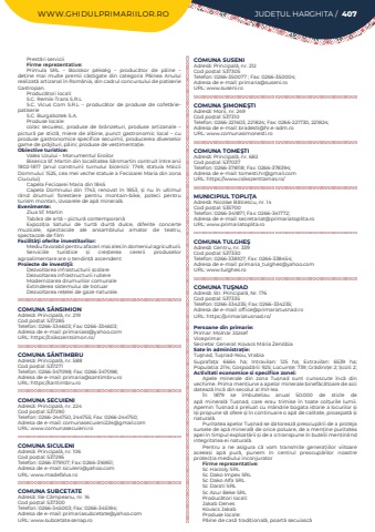WWW.GHIDULPRIMARIILOR.RO JUDE%u021aUL HARGHITA / 407Prest%u0103ri serviciiFirme reprezentative:Primula SRL %u2013 Bocskor p%u00e9ks%u00e9g %u2013 produc%u0103tor de p%u00e2ine %u2013 de%u021bine mai multe premii c%u00e2%u0219tigate din categoria P%u00e2inea Anului realizat%u0103 artizanal %u00een Rom%u00e2nia, din cadrul concursului de patiserie Gastropan.Produc%u0103tori locali:S.C. Remik-Trans S.R.LS.C. Vicus Com S.R.L %u2013 produc%u0103tor de produse de cofet%u0103riepatiserieS.C. Burgabotek S.A.Produse locale: colac secuiesc, produse de br%u00e2nzeturi, produse artizanale %u2013 pictur%u0103 pe sticl%u0103, miere de albine, punct gastronomic local %u2013 cu produse gastronomice specifice secuimii, producerea diverselor game de pr%u0103jituri, p%u00e2ini; produse de vestimenta%u021bie.Obiective turistice:Valea Uzului %u2013 Monumentul EroilorBiserica Sf. Martin din localitatea S%u00e2nmartin contruit %u00eentre anii 1802-1817 (anul construirii turnului bicericii: 1749, statuia Maicii Domnului: 1525, cea mei veche statuie a Fecioarei Maria din zona Ciucului)Capela Fecioarei Maria din 1845 Capela Domnului din 1743, renovat %u00een 1853, %u0219i nu %u00een ultimul r%u00e2nd drumuri forestiere pentru montain-bike, poteci pentru turism montan, izvoarele de ap%u0103 mineral%u0103.Evenimente:Ziua Sf. MartinTab%u0103ra de art%u0103 %u2013 pictur%u0103 contemporan%u0103Expozi%u021bia Satului de turt%u0103 durt%u0103 dulce, diferite concerte muzicale, spectacole ale ansamblului amator de teatru, spectacole de filmFacilit%u00e3%u0163i oferite investitorilor:Mediu favorabil pentru afaceri mai ales %u00een domeniul agriculturii. Serviciile turistice %u0219i cre%u0219terea cererii produselor agroalimentare are o tendin%u021b%u0103 ascendentProiecte de investi%u0163ii:Dezvoltarea infrastucturii %u0219colareDezvoltarea infrastructurii rutiereModernizarea drumurilor comunaleExtinderea sistemului de trotuarDezvoltarea re%u021belei de gaze naturale.COMUNA S%u00c2NSIMIONAdres%u0103: Principal%u0103, nr. 219Cod po%u0219tal: 537285Telefon: 0266-334603; Fax: 0266-334603; Adresa de e-mail: primariass@yahoo.comURL: https://csikszentsimon.ro/COMUNA S%u00c2NTIMBRUAdres%u0103: Principal%u0103, nr. 588Cod po%u0219tal: 537271Telefon: 0266-347098; Fax: 0266-347098; Adresa de e-mail: primaria@santimbru.roURL: https://santimbru.roCOMUNA SECUIENIAdres%u0103: Principal%u0103, nr. 224Cod po%u0219tal: 537290Telefon: 0266-244750, 244755; Fax: 0266-244750; Adresa de e-mail: comunasecuieni224@gmail.comURL: www.comunasecuieni.roCOMUNA SICULENIAdres%u0103: Principal%u0103, nr. 106Cod po%u0219tal: 537295Telefon: 0266-379107; Fax: 0266-316951; Adresa de e-mail: siculeni@yahoo.comURL: www.madefalva.roCOMUNA SUBCETATEAdres%u0103: Ilie C%u00e2mpeanu, nr. 16Cod po%u0219tal: 537300Telefon: 0266-345003; Fax: 0266-345184; Adresa de e-mail: primariasubcetate@yahoo.comURL: www.subcetate.senap.roCOMUNA SUSENIAdres%u0103: Principal%u0103, nr. 212Cod po%u0219tal: 537305Telefon: 0266-350077 ; Fax: 0266-350004; Adresa de e-mail: primaria@suseni.roURL: www.suseni.roCOMUNA %u015eIMONE%u015eTIAdres%u0103: Morii, nr. 249Cod po%u0219tal: 537310Telefon: 0266-221603, 221824; Fax: 0266-221730, 221824; Adresa de e-mail: bradesti@hr.e-adm.roURL: www.comunasimonesti.roCOMUNA TOME%u015eTIAdres%u0103: Principal%u0103, nr. 682Cod po%u0219tal: 537037Telefon: 0266-378118; Fax: 0266-378394; Adresa de e-mail: tomesti.hr@gmail.comURL: https://www.csikszenttamas.ro/MUNICIPIUL TOPLI%u0162AAdres%u0103: Nicolae B%u0103lcescu, nr. 14Cod po%u0219tal: 535700Telefon: 0266-341871; Fax: 0266-341772; Adresa de e-mail: secretariat@primariatoplita.roURL: www.primariatoplita.roCOMUNA TULGHE%u015eAdres%u0103: Centru, nr. 339Cod po%u0219tal: 537330Telefon: 0266-338107; Fax: 0266-338454; Adresa de e-mail: primaria_tulghes@yahoo.comURL: www.tulghes.roCOMUNA TU%u015eNADAdres%u0103: Str. Principal%u0103, Nr. 176Cod po%u0219tal: 537335Telefon: 0266-334235; Fax: 0266-334235; Adresa de e-mail: office@primariatusnad.roURL: https://primariatusnad.ro/Persoane din primarie:Primar: Moln%u00e1r J%u00f3zsefViceprimar:%u00a0Secretar General: Kovacs M%u00e1ria Zen%u00f3biaSate %u00een administra%u021bie:Tu%u015fnad, Tu%u015fnad-Nou, VrabiaSuprafa%u021ba:%u00a0 6664 ha; Intravilan:%u00a0 125 ha; Extravilan:%u00a0 6539 ha; Popula%u021bia:%u00a02114; Gospod%u0103rii:%u00a0925; Locuin%u021be:%u00a0739; Gr%u0103dini%u021be:%u00a02; %u0218coli:%u00a02; Activitati economice si specifice zonei:Apele minerale din zona Tu%u0219nad sunt cunoscute %u00eenc%u0103%u00a0 din vechime. Prima men%u021biune a apelor minerale binef%u0103c%u0103toare de aici dateaz%u0103%u00a0%u00eenc%u0103%u00a0din secolul al XVI-lea.%u00cen 1879 se %u00eembuteliau anual 50.000 de sticle de ap%u0103%u00a0 mineral%u0103%u00a0 Tu%u0219nad, care erau trimise %u00een toate col%u021burile lumii. Apemin Tusnad a preluat cu m%u00e2ndrie bogata istorie a locurilor %u0219i %u00ee%u0219i propune s%u0103%u00a0ofere %u0219i %u00een continuare o ap%u0103%u00a0de calitate, proaspat%u0103%u00a0%u0219i natural%u0103.Puritatea apelor Tu%u0219nad se datoreaz%u0103 preocup%u0103rii de a proteja sursele de ap%u0103%u00a0mineral%u0103%u00a0de orice poluare, de a men%u021bine puritatea apei %u00een timpul exploat%u0103rii %u0219i de a o transpune %u00een butelii men%u021bin%u00e2nd integritatea ei natural%u0103.Pentru a ne asigura c%u0103%u00a0 vom transmite genera%u021biilor viitoare aceea%u0219i ap%u0103%u00a0 pur%u0103, punem %u00een centrul preocup%u0103rilor noastre protec%u021bia mediului inconjuratorFirme reprezentative:Sc Harzoly SRLSc Dako Impex SRLSc Dako Alfa SRLSc Darati SRLSc Azur Beke SRLProduc%u0103tori locali:Jakab DenesKovacs JakabProduse locale:P%u00e2ine de cas%u0103%u00a0tradi%u021bional%u0103, poart%u0103%u00a0secuiasc%u0103