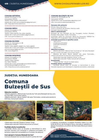 410 / JUDE%u021aUL HUNEDOARA WWW.GHIDULPRIMARIILOR.ROCOMUNA B%u0102TR%u00c2NAAdres%u0103: Principal%u0103, nr. 55Cod po%u0219tal: 337070Telefon: 0752-348313, 0755-811327 ; Adresa de e-mail: primariabatrana@gmail.comURL: https://primaria-batrina.roCOMUNA BERIUAdres%u0103: Principal%u0103, nr. 131Cod po%u0219tal: 337075Telefon: 0254-246170; Fax: 0254-246236; Adresa de e-mail: primariaberiu@gmail.comURL: www.primariaberiu.roCOMUNA BL%u0102JENIAdres%u0103: str. Principala ,nr. 85Cod po%u0219tal: 337085Telefon: 0254-682911, 682811; Fax: 0254-682911; Adresa de e-mail: prim.blajeni_secretar@yahoo.comprimaria.blajeni@gmail.comURL: www.blajeni.roCOMUNA BO%u015eORODAdres%u0103: Principal%u0103, nr. 73Cod po%u0219tal: 337095Telefon: 0254-733050; Fax: 0254-733050; Adresa de e-mail: contact@comunabosorod.ro primariabosorod@hotmail.comURL: https://www.comunabosorod.ro/COMUNA BULZE%u015eTII DE SUSAdres%u0103: Str. Principal%u0103, Nr. 35Cod po%u0219tal: 337150Adresa de e-mail: bulzestidesus@yahoo.comURL: www.primariabulzestiidesus.roPersoane din primarie:Primar: Doru Ioan PaulJurist cu atribu%u021bii de secretar: Monica Laz%u0103rContabil: Marinela DobraSate %u00een administra%u021bie:Bulze%u015ftii de Sus, Bulze%u015ftii de Jos, Giurge%u015fti, Grohot, P%u0103ule%u015fti, Ruse%u015fti, St%u0103ncule%u015fti, Ticera, TomnatecSuprafa%u021ba:%u00a0 11004 ha; Intravilan:%u00a0 168,10 ha; Extravilan:%u00a0 10835,9 ha; Popula%u021bia:%u00a0271; Gospod%u0103rii:%u00a0246; Locuin%u021be:%u00a0395; %u0218coli:%u00a01; Activitati economice si specifice zonei:AgriculturaCre%u0219terea animalelorExploat%u0103ri forestiere Turism AgroturismObiective turistice:Biserica de lemn %u201cSf%u00e2ntul Ioan Gur%u0103 de Aur%u201d%u00a0din satul Bulze%u0219tii de Sus, construc%u021bie%u00a01853, monument istoricBiserica de lemn %u201cBuna Vestire%u201d%u00a0 din satul Tomnatec, construc%u021bie%u00a0secolul al XVIII-lea, monument istoricRezerva%u021bia natural%u0103%u00a0%u201cPe%u0219tera Cizmei%u201d (1 ha) Rezerva%u021bia natural%u0103%u00a0%u201cPodul natural de la Grohot%u201dEvenimente:%u201cT%u00e2rgul de fete %u201c de pe muntele G%u0103inaFacilit%u00e3%u0163i oferite investitorilor:Facilit%u0103%u0163i oferite celor ce locuiesc %u015fi domiciliaz%u0103 %u00een zona Mun%u0163ilor Apuseni (cei interesa%u0163i %u00een cre%u015fterea animalelor, colectarea
