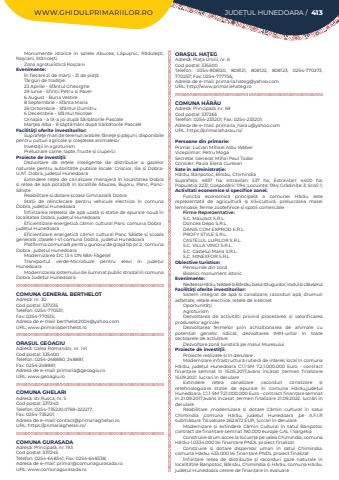 WWW.GHIDULPRIMARIILOR.RO JUDE%u021aUL HUNEDOARA / 413Monumente istorice %u00een satele Abucea, L%u0103pu%u015fnic, R%u0103dule%u015fti, Ro%u015fcani, St%u00e2nce%u015ftiZona agroturistic%u0103 Ro%u015fcaniEvenimente:%u00cen fiecare zi de mar%u0163i - Zi de pia%u0163%u0103T%u00e2rguri de tradi%u0163ie:23 Aprilie - Sf%u00e2ntul Gheorghe29 Iunie - Sfin%u021bii Petru %u0219i Pavel6 August - Buna Vestire8 Septembrie - Sf%u00e2nta Maria26 Octombrie - Sf%u00e2ntul Dumitru6 Decembrie - Sf%u00e2ntul NicolaeOrnapia - a IX-a joi dup%u0103 S%u0103rb%u0103torile PascaleMar%u0163ea Alba - 8 s%u0103pt%u0103m%u00e2ni dup%u0103 S%u0103rb%u0103torile PascaleFacilit%u00e3%u0163i oferite investitorilor:Suprafe%u0163e mari de terenuri arabile, f%u00e2ne%u0163e %u015fi p%u0103%u015funi, disponibile pentru culturi agricole %u015fi cre%u015fterea animalelorInvesti%u0163ii %u00een agroturismPrelucrare carne, lapte, fructe %u015fi ciuperciProiecte de investi%u0163ii:Dezvoltare de re%u021bele inteligente de distribu%u021bie a gazelor naturale pentru autorit%u0103%u021ble publice locale: Criscior, Ilia %u0219i DobraU.AT. Dobra, jude%u021bul HunedoaraExtindere re%u021bea de canalizare menajer%u0103%u00a0 %u00een localitatea Dobra %u0219i re%u021bea de ap%u0103%u00a0potabil%u0103%u00a0%u00een localitile Abucea, Bujoru, Panc, PancS%u0103li%u0219teReabilitare %u0219i dotare %u0219coala Gimnazial%u0103%u00a0DobraSta%u021bii de re%u00eenc%u0103rcare pentru vehicule electrice %u00een comuna Dobra, jude%u021bul Hunedoara%u00cenfiin%u021barea re%u021belelor de ap%u0103 uzat%u0103 %u0219i sta%u021bie de epurare nou%u0103 %u00een localitatea Dobra, jude%u021bul HunedoaraEficientizare energetic%u0103%u00a0c%u0103min cultural Panc comuna Dobra , jude%u021bul HunedoaraEficientizare energetic%u0103%u00a0c%u0103min cultural Panc S%u0103li%u0219te %u0219i %u0219coala general%u0103%u00a0,clasele I-VI comuna Dobra , judetul HunedoaraPlatforma comunal%u0103%u00a0pentru gunoiul de grajd tip pc 2 , comuna Dobra , jude%u021bul HunedoaraModernizarea DC 13 4 DN 68A-F%u0103ge%u021belTransportul verde-Microbuze pentru elevi %u00een jude%u021bul HunedoaraModernizarea sistemului de iluminat public stradal %u00een comuna Dobra Jude%u021bul HunedoaraCOMUNA GENERAL BERTHELOTAdres%u0103: nr. 30Cod po%u0219tal: 337235Telefon: 0254-770531; Fax: 0254-770515; Adresa de e-mail: berthelot2004@yahoo.comURL: www.primariaberthelot.roORA%u0218UL GEOAGIUAdres%u0103: Calea Romanilor, nr. 141Cod po%u0219tal: 335400Telefon: 0254-248880, 248881; Fax: 0254-248881; Adresa de e-mail: primaria@geoagiu.roURL: www.geoagiu.roCOMUNA GHELARIAdres%u0103: str.Rusca, nr. 5Cod po%u0219tal: 337240Telefon: 0254-735220,0769-222217; Fax: 0254-735201; Adresa de e-mail: contact@primariaghelari.roURL: https://primariaghelari.ro/COMUNA GURASADAAdres%u0103: Principal%u0103, nr. 193Cod po%u0219tal: 337245Telefon: 0254-648341; Fax: 0254-648338; Adresa de e-mail: primar@comunagurasada.roURL: www.comunagurasada.roORA%u0218UL HA%u0162EGAdres%u0103: Pia%u0163a Unirii, nr. 6Cod po%u0219tal: 335500Telefon: 0354-808120, 808121, 808122, 808123, 0254-770273, 770257; Fax: 0254-777756; Adresa de e-mail: primaria.hateg@yahoo.comURL: http://www.primariehateg.roCOMUNA H%u0102R%u0102UAdres%u0103: Principal%u0103, nr. 69Cod po%u0219tal: 337265Telefon: 0254-233201; Fax: 0254-233201; Adresa de e-mail: primaria_harau@yahoo.comURL: https://primariaharau.ro/Persoane din primarie:Primar: Lucian Mihael Albu WeberViceprimar: Petru MogaSecretar General: Mihai Paul TodorConsiler: Paula Elena CurteanSate %u00een administra%u021bie:H%u0103r%u0103u, Banpotoc, B%u00eers%u0103u, ChimindiaSuprafa%u021ba:%u00a0 4937 ha; Intravilan:%u00a0 537 ha; Extravilan:%u00a0 4400 ha; Popula%u021bia:%u00a02231; Gospod%u0103rii:%u00a01194; Locuin%u021be:%u00a01194; Gr%u0103dini%u021be:%u00a03; %u0218coli:%u00a01; Activitati economice si specifice zonei:Func%u021bia economic%u0103%u00a0 principal%u0103%u00a0 a comunei H%u0103r%u0103u este reprezentat%u0103%u00a0 de agricultur%u0103%u00a0 %u0219i silvicultur%u0103, prelucrarea masei lemnoase, ferme zootehnice %u0219i spa%u021bii comercialeFirme Reprezentative:S.C. Maiulact S.R.L.Doncea Depo S.R.L.DANIS COM EXPROD S.R.L.PROFY STYLE S.R.L.CASTELUL LUPILOR S.R.L.S.C. VILLA VINCI S.R.L.S.C. Castelul Maria S.R.L. S.C. MINEXFOR S.R.L.Obiective turistice:Pensiunile din zon%u0103Biserici monument istoricEvenimente:Nedee la H%u0103r%u0103u, Nedee la B%u00e2rs%u0103u, balul strugurilor, irodul %u0219i c%u0103lu%u0219erulFacilit%u00e3%u0163i oferite investitorilor:Sistem integrat de ap%u0103%u00a0 %u0219i canalizare, racorduri ap%u0103, drumuri asfaltate, re%u021bele electrice, re%u021bele de internetOportunit%u0103%u0163i:AgroturismDezvoltarea de activit%u0103%u021bi privind procesarea %u0219i valorificarea produselor agricoleDezvoltarea fermelor prin achizi%u021bionarea de animale cu poten%u021bial genetic ridicat, dezvoltarea IMM-urilor %u00een toate sectoarele de activitare Dezvoltare zon%u0103 turistic%u0103 pe malul Mure%u0219uluiProiecte de investi%u0163ii:Proiecte realizate %u0219i %u00een derulare :Modernizare infrastructur%u0103%u00a0rutier%u0103%u00a0de interes local %u00een comuna H%u0103r%u0103u, jude%u021bul Hunedoara C1.1-SM 7.2,1.000.000 Euro - contract finan%u021bare semnat %u00een 15.05.2017,avans %u00eencasat ,termen finalizare 15.09.2021. lucrari %u00een derulareExtindere re%u021bea canalizare ,racorduri canalizare %u0219i retehnologizare sta%u021bie de epurare %u00een comuna H%u0103r%u0103u,jude%u021bul Hunedoara, C1.1-SM 7.21.000.000 Euro - contract finan%u021bare semnat %u00een 21.09.2017,avans %u00eencasat ,termen finalizare 21.09.2022. lucr%u0103ri %u00een derulareReabilitare ,modernizare %u0219i dotare C%u0103min cultural %u00een satul Chimindia ,comuna H%u0103r%u0103u, jude%u021bul Hunedoara ,pe A.F.I.R subm%u0103sura 7.6.valoare 262.672 EUR, lucrari %u00een derulareModernizare %u0219i extindere C%u0103min Cultural %u00een satul Banpotoc contract de finan%u021bare sem