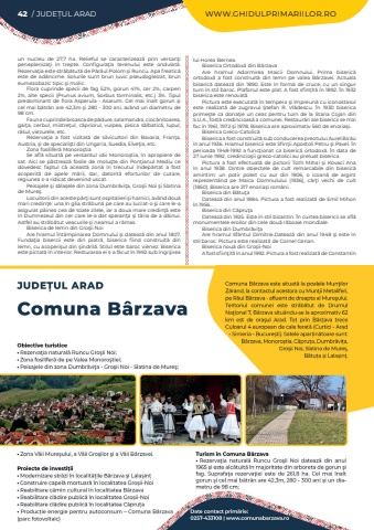 42 / JUDE%u021aUL ARAD WWW.GHIDULPRIMARIILOR.ROun nucleu de 27,7 ha. Relieful se caracterizeaz%u0103 prin versan%u0163i penepleniza%u0163i %u00een trepte. Configura%u0163ia terenului este ondulat%u0103. Rezerva%u0163ia este str%u0103b%u0103tut%u0103 de P%u00e2r%u00e2ul Polom %u015fi Runcu. Apa freatic%u0103 este de ad%u00e2ncime. Solurile sunt brun luvic pseudogleizat, brun eumezobazic tipic %u015fi molic.Flora cuprinde specii de fag 52%, gorun 41%, cer 2%, carpen 2%, alte specii (Prunus avium, Sorbus torminalis, etc.) 3%. Tipul predominant de flora Asperula -%u00a0Asarum. Cel mai %u00eenalt gorun %u015fi cel mai b%u0103tr%u00e2n%u00a0are 42,3m %u015fi 280 -%u00a0300 ani, av%u00e2nd un diametru de 98 cm.Fauna cuprinde broasca de p%u0103dure, salamandra, cioc%u0103nitoarea, gai%u0163a, cerbul, mistre%u0163ul, c%u0103priorul, vulpea, pisica s%u0103lbatic%u0103, lupul, r%u00e2sul, viezurele, etc.Rezerva%u0163ia a fost vizitat%u0103 de silvicultori din Bavaria, Fran%u0163a, Austria, %u015fi de speciali%u015fti din Ungaria, Suedia, Elve%u0163ia, etc.Zona fosilifer%u0103 Monoro%u015ftiaSe afl%u0103 situat%u0103 pe versantul v%u0103ii Monoro%u015ftia, %u00een apropiere de sat. Aici se p%u0103streaz%u0103 fosile de molu%u015fte din Pon%u0163ianul Mediu ce dovedesc faptul c%u0103 aceast%u0103 zon%u0103 %u00een trecutul %u00eendep%u0103rtat a fost acoperit%u0103 de apele m%u0103rii, dar, datorit%u0103 eforturilor de cutare, regiunea s-a ridicat devenind uscat.Peisajele %u015fi s%u0103la%u015fele din zona Dumbr%u0103vi%u0163a, Gro%u015fii Noi %u015fi Slatina de Mure%u015f.Locuitorii din aceste p%u0103r%u0163i sunt ospitalieri %u015fi harnici, av%u00e2nd dou%u0103 mari credin%u0163e: una %u00een glia str%u0103bun%u0103 pe care au lucrat-o %u015fi care le-a asigurat p%u00e2inea cea de toate zilele, iar a doua mare credin%u0163%u0103 este %u00een Dumnezeul din cer care le-a dat speran%u0163a %u015fi t%u0103ria de a d%u0103inui. Astfel au str%u0103b%u0103tut veacurile %u015fi neamul a r%u0103mas.Biserica de lemn din Gro%u015fii NoiAre hramul %u00cent%u00e2mpinarea Domnului %u015fi dateaz%u0103 din anul 1807. Funda%u0163ia bisercii este din piatr%u0103, biserica fiind construit%u0103 din lemn, cu acoperi%u015ful din %u015findril%u0103. Stilul este baroc vienez. Biserica este pictat%u0103 %u00een interior. Resturarea ei s-a f%u0103cut %u00een 1992 sub %u00eengrijirea lui Horea Bernea.Biserica Ortodox%u0103 din B%u00e2rzava%u00a0Are hramul Adormirea Maicii Domnului. Prima biseric%u0103 ortodox%u0103 a fost construit%u0103 din lemn pe valea B%u00e2rzavei. Actuala biseric%u0103 dateaz%u0103 din 1890. Este %u00een form%u0103 de cruce, cu un singur turn %u00een stil baroc. Plafonul este plat. A fost sfin%u0163it%u0103 %u00een 1892. %u00cen 1932 biserica este renovat%u0103.Pictura este executat%u0103 %u00een tempera %u015fi %u00eempreun%u0103 cu iconostasul este realizat%u0103 de zugravul %u015etefan R. Vl%u0103descu. %u00cen 1930 biserica prime%u015fte ca dona%u0163ie un ceas pentru turn de la Stana Cojan din S.U.A., fost%u0103 credincioas%u0103 a comunei. Restaur%u0103ri ale bisericii se mai fac %u00een 1961, 1972 %u015fi 1978. Biserica are aproximativ 560 de enoria%u015fi.Biserica Greco-Catolic%u0103Biserica a fost construit%u0103 sub conducerea preotului Aurel Bir%u0103u %u00een anul 1936. Hramul bisericii este Sfin%u0163ii Apostoli Petru %u015fi Pavel. %u00cen perioada 1948-1992 a func%u0163ionat ca biseric%u0103 ortodox%u0103. %u00cen data de 27 iunie 1992, credincio%u015fii greco-catolici au preluat biserica.Pictura a fost efectuat%u0103 de pictorii Toth Mihai %u015fi Kovaci Ana %u00een anul 1938. Dintre obiectele de cult remarcabile din biseric%u0103 amintim: un potir poleit cu aur din 1906, o icoan%u0103 de argint reprezent%u00e2nd pe Maica Domnulului (1936), c%u0103r%u0163i vechi de cult (1850). Biserica are 217 enoria%u015fi rom%u00e2ni.Biserica din B%u0103tu%u0163a%u00a0Dateaz%u0103 din anul 1884. Pictura a fost realizat%u0103 de Emil Mihon %u00een 1956.Biserica din C%u0103pru%u0163aDateaz%u0103 din 1925. Este %u00een stil bizantin. %u00cen curtea bisericii se afl%u0103 monumentele eroilor din cele dou%u0103 r%u0103boaie mondiale.Biserica din Dumbr%u0103vi%u0163aAre hramul Sf%u00e2ntul Dimitrie.Dateaz%u0103 din anul 1948 %u015fi este %u00een stil baroc. Pictura este realizat%u0103 de Cornel Cenan.Biserica nou%u0103 din Gro%u015fii-Noi%u00a0A fost sfiin%u0163it%u0103 %u00een anul 1992. Pictura a fost realizat%u0103 de Constantin