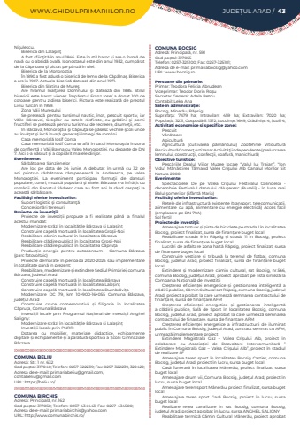 WWW.GHIDULPRIMARIILOR.RO JUDE%u021aUL ARAD / 43Ni%u0163ulescu.Biserica din Lala%u015fin%u0163%u00a0A fost sfiin%u0163it%u0103 %u00een anul 1846. Este %u00een stil baroc %u015fi are o form%u0103 de nav%u0103 cu o absid%u0103 oval%u0103. Iconostasul este din anul 1932, cump%u0103rat de la C%u0103prioara %u015fi pictat pe p%u00e2nz%u0103 %u00een ulei.Biserica de la Monoro%u015ftia%u00cen 1890 a fost adus%u0103 o biseric%u0103 de lemn de la C%u0103p%u00e2lna%u015f. Biserica a ars %u00een 1967. Actuala biseric%u0103 dateaz%u0103 din anul 1971.Biserica din Slatina de Mure%u015fAre hramul%u00a0 %u00cenal%u0163area Domnului %u015fi dateaz%u0103 din 1885. Stilul bisericii este baroc vienez. %u00cemp%u0103ratul Franz Iosef a donat 100 de coroane pentru zidirea biserici. Pictura este realizat%u0103 de preotul Liviu Tulcan %u00een 1959.Zona V%u0103ii Mure%u015fuluiSe preteaz%u0103 pentru tursimul nautic, %u00eenot, pescuit sportiv, iar V%u0103ile B%u00e2rzavei, Gro%u015filor cu satele r%u0103sfirate, cu gr%u0103dini %u015fi pomi fructiferi se preteaz%u0103 pentru turismul de recreere, drume%u0163ii, etc.%u00cen B%u00e2rzava, Monoro%u015ftia %u015fi C%u0103pru%u0163a se g%u0103sesc vechile %u015fcoli unde au %u00eenv%u0103%u0163at %u015fi %u00eenc%u0103 %u00eenva%u0163%u0103 genera%u0163ii %u00eentregi de rom%u00e2ni.Casa memorial%u0103 Iosif ContaCasa memorial%u0103 Iosif Conta se afl%u0103 %u00een satul Monoro%u015ftia %u00een zona de conflen%u0163%u0103 a V%u0103ii Bavna cu Valea Monoro%u015ftiei, nu departe de DN 7. Aici s-a n%u0103scut %u015fi a copil%u0103rit marele dirijor.Evenimente:S%u0103rb%u0103toarea S%u00e2nzienelor%u00a0Are loc pe data de 24 iunie. A debutat %u00een urm%u0103 cu 32 de ani printr-o s%u0103rb%u0103toare c%u00e2mpeneasc%u0103 la Andreasca, pe valea Monoro%u015ftiei. La eveniment participau forma%u0163ii de dansuri populare, coruri, muzic%u0103 popular%u0103 %u015fi altele. B%u00e2rzava s-a %u00eenfr%u0103%u0163it cu rom%u00e2nii din Banatul S%u00e2rbesc care au fost ani la r%u00e2nd oaspe%u0163i la aceast%u0103 s%u0103rb%u0103toare.Facilit%u00e3%u0163i oferite investitorilor:Suport logistic %u015fi consultan%u0163%u0103Concesion%u0103ri terenuriProiecte de investi%u0163ii:Proiecte de investi%u021bii propuse a fi realizate p%u00e2n%u0103 la finalul acestui mandat:Modernizare str%u0103zi %u00een localit%u0103%u021bile B%u00e2rzava %u0219i Lala%u0219in%u021bConstruire capel%u0103%u00a0mortuar%u0103 %u00een localitatea%u00a0Gro%u0219ii-NoiReabilitare c%u0103min cultural %u00een localitatea%u00a0B%u00e2rzavaReabilitare cl%u0103dire public%u0103 %u00een localitatea%u00a0Gro%u0219ii-NoiReabilitare cl%u0103dire public%u0103 %u00een localitatea%u00a0C%u0103pru%u021baProduc%u021bie energie pentru autoconsum %u2013 Comuna B%u00e2rzava (parc fotovoltaic)Proiecte demarate %u00een perioada 2020-2024 sau implementate %u00een totalitate p%u00e2n%u0103 %u00een prezent:Reabilitare, modernizare %u0219i extindere Sediul Prim%u0103riei, comuna B%u00e2rzava, jude%u021bul AradConstruire capel%u0103%u00a0mortuar%u0103 %u00een localitatea%u00a0B%u00e2rzavaConstruire capel%u0103%u00a0mortuar%u0103 %u00een localitatea%u00a0Lala%u0219in%u021bConstruire capel%u0103%u00a0mortuar%u0103 %u00een localitatea%u00a0Dumbr%u0103vi%u021baModernizare DC 79, km 10+900-16+055 Comuna B%u00e2rzava, jude%u021bul AradConstruire cruce comemorativ%u0103 %u0219i filigorie %u00een localitatea C%u0103pru%u021ba, Comuna B%u00e2rzavaInvesti%u021bii locale prin Programul Na%u021bional de Investi%u021bii Anghel Saligny:Modernizare str%u0103zi %u00een localit%u0103%u021bile B%u00e2rzava %u0219i Lala%u0219in%u021bInvesti%u021bii locale prin PNRR:Dotarea cu mobilier, materiale didactice, echipamente digitale %u0219i echipamente %u0219i aparatur%u0103 sportiv%u0103 a %u0218colii Gimnaziale B%u00e2rzavaCOMUNA BELIUAdres%u0103: Str. 1 nr. 632Cod po%u0219tal: 317040; Telefon: 0257-322239; Fax: 0257-322239, 322422; Adresa de e-mail: primariabeliu@gmail.com, contabeliu@gmail.comURL: https://beliu.ro/COMUNA BIRCHI%u015eAdres%u0103: Principal%u0103, nr. 162Cod po%u0219tal: 317050; Telefon: 0257-434443; Fax: 0257-434500; Adresa de e-mail: primariabirchis@yahoo.comURL: http://www.comunabirchis.ro/COMUNA BOCSIGAdres%u0103: Principal%u0103, nr. 591Cod po%u0219tal: 317055Telefon: 0257-325100; Fax: 0257-325101; Adresa de e-mail: primariabocsig@yahoo.comURL: www.bocsig.roPersoane din primarie:Primar:%u00a0Teodora Felicia AbrudeanViceprimar: Teodor Dorin Ro%u0219uSecretar General: Adela PetcuContabil: Leka AnaSate %u00een administra%u021bie:Bocsig, M%u00eener%u0103u, R%u0103psigSuprafa%u021ba:%u00a0 7479 ha; Intravilan:%u00a0 459 ha; Extravilan:%u00a0 7020 ha; Popula%u021bia:%u00a03231; Gospod%u0103rii:%u00a01372; Locuin%u021be:%u00a01649; Gr%u0103dini%u021be:%u00a04; %u0218coli:%u00a04; Activitati economice si specifice zonei:PescuitV%u00e2n%u0103toareApicultur%u0103Agricultur%u0103 (cultivarea p%u0103m%u00e2ntului) Zootehnie Viticultur%u0103 Piscicultur%u0103 Comer%u0163 Artizanat Activit%u0103%u0163i independente (prelucrarea lemnului, construc%u0163ii, confec%u0163ii, coafur%u0103, manichiur%u0103)Obiective turistice:Pesc%u0103riile Dealul Viilor Muzee locale %u201cValul lui Traian%u201d, %u201cIon Vidu%u201d M%u0103n%u0103stirea T%u0103mand Valea Cri%u015fului Alb Canalul Morilor Sit Natura 2000Evenimente:Spectacolele: De pe Valea Cri%u015fului Festivalul Colindelor - decembrie Festivalul dansului c%u0103lu%u015feresc (Rusalii) - %u00een luna mai Balul %u015fomerilor (Sf%u00e2nt%u0103 Maria)Facilit%u00e3%u0163i oferite investitorilor:Re%u0163ele de infrastructur%u0103 existente (transport, telecomunica%u0163ii, alimentare cu ap%u0103, alimentare cu energie electric%u0103) Acces facil (amplasare pe DN 79A) Sol fertilProiecte de investi%u0163ii:Amenajare trotuar %u0219i piste de biciclete pe strada 1 %u00een localitatea Bocsig, proiect finalizat, sursa de finan%u021bare buget localReabilitare strada 9 %u00een R%u0103psig %u0219i strada 11 %u0