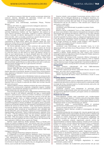 WWW.GHIDULPRIMARIILOR.RO JUDE%u021aUL V%u00c2LCEA / 749Pe teritoriul ora%u0219ului C%u0103lim%u0103ne%u0219ti exist%u0103 numeroase obiective cultural- istorice, deosebit de valoroase, incluse pe Lista monumentelor istorice. Printre acestea sunt:%u00a0Castrul roman ARUTELA%u00a0Localizare: ora%u0219 C%u0103lim%u0103ne%u015fti, localitatea P%u0103u%u0219a, %u201cPoiana Bivolari%u201dDatare: 137%u2013138 d. Hr., epoca roman%u0103. Categorie valoric%u0103 A.%u00a0Lista 2010: VL-I-s-A-09562.%u00a0Datarea s-a f%u0103cut pe baza unei inscrip%u0163ii, descoperit%u0103 %u00een dublu exemplar, din care rezult%u0103 c%u0103 acest castru a fost construit %u00een vremea %u00eemp%u0103ratului Hadrian, de %u201cSuri Sagittari%u201d, din ordinul lui Titus Flavius Constans, procurator imperial al Daciei inferioare. Ultima moned%u0103, ca datare, descoperit%u0103 la Arutela, a fost emis%u0103 %u00eentre anii 220 %u2013 223. La Arutela, a existat %u015fi o a%u015fzare dacic%u0103 care %u015fi-a prelungit existen%u0163a %u015fi sub st%u0103p%u00e2nirea roman%u0103.%u00a0Castrul Arutela asigura circula%u0163ia pe Valea Oltului, spre Transilvania %u015fi f%u0103cea parte, al%u0103turi de celelalte castre din jurul Masivului Cozia, dintr-o linie de ap%u0103rare pentru oprirea atacurilor dinspre zona deluroas%u0103 de la r%u0103s%u0103rit.%u00a0De form%u0103 p%u0103trat%u0103, castrul a fost construit din piatr%u0103. Zidul de incint%u0103 a fost ridicat din blocuri mari de piatr%u0103 de form%u0103 dreptunghiular%u0103, %u015fi dup%u0103 caz, lespezi sub%u0163iri %u015fi piatr%u0103 m%u0103runt%u0103, nefasonat%u0103 prinse cu mortar, pentru a se asigura orizontalitatea. La nord de castru se afl%u0103 piscul lui Teofil, pe platoul c%u0103ruia s-a zidit un turn semicircular, cu latura dreapt%u0103 spre est, la 300 de metri %u00een%u0103l%u0163ime fa%u0163%u0103 de Poiana Bivolari. Acest turn, orientat spre Olt avea rolul de a supraveghea intrarea %u00een defileu, c%u0103tre Dacia Superior, asigur%u00e2nd totodat%u0103 %u015fi urm%u0103rirea traficului rutier spre Castra Traiana (D%u0103e%u015fti). Dovezile arheologice indic%u0103 faptul c%u0103, %u00eenc%u0103 din antichitate, apele Oltului au distrus latura de vest a castrului, determin%u00e2nd retragera de aici a garnizoanei romane.%u00a0M%u0103n%u0103stirea COZIA%u00a0Localizare: ora%u015f C%u0103lim%u0103ne%u015fti, localitatea Cozia %u2013 C%u0103ciulata%u00a0Datare: 1388%u20131391; sec. XVI, XVII, XVIII. XIX. Categorie valoric%u0103 A.%u00a0Ctitori: voevozii Mircea cel B%u0103tr%u00e2n, Neagoe Basarab, Radu Paisie, egumenul Amfilohie, %u015eerban II Cantacuzino, arhimandritul Ioan, egumenul M%u0103n%u0103stirii Hurezi, domnitorii Gheorghe Bibescu %u015fi Barbu %u015etirbei.%u00a0Ansamblul monastic de la M%u0103n%u0103stirea Cozia se compune din: Biserica Sf%u00e2nta Treime (biserica mare); Paraclisul Adormirea Maicii Domnului (al lui Amfilohie); Paraclisul Duminica Tuturor Sfin%u0163ilor (al lui Ioan de la Hurezi) %u2013; Trapeza; Bolni%u0163a Coziei (Biserica Sfin%u0163ii Apostoli Petru %u015fi Pavel) %u0219i corpurile de cl%u0103diri ale incintei, laturile de nord, est %u015fi sud.%u00a0Biserica Sf%u00e2nta Treime, realizare artistic%u0103 de mare rafinament, cu elemente constructive originale, integr%u00e2nd organic tradi%u0163ia bizantin%u0103, caracteristicile arhitecturii balcanice %u015fi arta autohton%u0103 a zidirii bisericilor din secolele XIII %u2013 XIV. %u00a0%u00centre comorile de pre%u0163 pe care le ad%u0103poste%u015fte M%u0103n%u0103stirea Cozia, pictura mural%u0103 %u00een stil bizantin p%u0103strat%u0103 aici este o inestimabil%u0103 valoare a patrimoniului cultural %u015fi artistic rom%u00e2nesc %u015fi european. La Cozia pot fi admirate: fresca dat%u00e2nd din secolul al XIV-lea (din pronaosul bisericii mari), al doilea ansamblu pictural din %u0163ara Rom%u00e2neasc%u0103 (dup%u0103 cel de la Biserica domneasc%u0103 din Curtea de Arge%u015f, ca amploare %u015fi vechime), %u00eencadrat stilistic %u00een sfera artei constantinopolitane, Mircea cel B%u0103tr%u00e2n recurg%u00e2nd, pentru pictarea Coziei, la o echip%u0103 de me%u015fteri forma%u0163i la %u015fcoala metropolitan%u0103, fresca dat%u00e2nd din secolul al XVI-lea (1542 %u2013 1543), reprezentat%u0103 de pictura mural%u0103 din Bolni%u0163a Coziei, realizare a zugravilor David %u015fi Raduslav, un ansamblu bine conservat %u015fi impresionant prin calit%u0103%u0163ile sale de fast decorativ, prin compozi%u0163ie, culoare %u015fi %u00een mod deosebit prin expresivitatea portretelor, fresca br%u00e2ncoveneasc%u0103, realizat%u0103 %u00eentre anii 1704 %u2013 1705 de zugravii Preda %u015fi fiii s%u0103i Ianache, Mihail %u015fi Sima %u00een naosul %u015fi altarul bisericii mari, cea din pridvor, realizat%u0103 %u00eentre anii 1705 %u2013 1707, de zugravii Andrei, Gheorghe %u015fi Constantin, %u015fi din Paraclisul de Nord (pere%u0163ii de sud %u015fi vest), fresca din Paraclisul de Sud, realizat%u0103 %u00een 1835 de Voicu zugrav din Pite%u015fti. %u00a0Bolni%u0163a Coziei (Biserica Sfin%u0163ii Apostoli Petru %u015fi Pavel) prin silueta sa zvelt%u0103 %u015fi elegant%u0103 este %u201cuna dintre cele mai frumoase realiz%u0103ri arhitectonice ale veacului al XVI %u2013 lea din %u0163ara Rom%u00e2neasc%u0103, o bijuterie a arhitecturii autohtone a secolului al XVI-lea%u201d.%u00a0M%u0103n%u0103stirea OSTROV (Biserica Na%u0219terea Maicii Domnului) %u00a0Localizare: ora%u015f C%u0103lim%u0103ne%u015fti, Insula Ostrov Datare: 1520%u20131522. Categorie valoric%u0103 A. Ctitori: Neagoe Basarab %u015fi Despina Doamna %u00a0%u00cen %u00eenf%u0103%u0163i%u015farea sa actual%u0103, Biserica Na%u0219terea Maicii Domnului este ctitoria recunoscut%u0103 a domnitorului Neagoe Basarab (1512 %u2013 1521, septembrie 15) %u015fi a Despinei Doamna, so%u0163ia sa, fiic%u0103 a despotului s%u00e2rb Ioan Brancovici. Dup%u0103 pierderea so%u0163ului %u015fi a fiului %u00eentr-un r%u0103stimp foarte scu