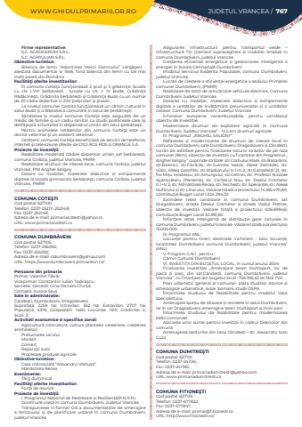 WWW.GHIDULPRIMARIILOR.RO JUDE%u021aUL VRANCEA / 767Firme reprezentative:S.C. AGROGEROM S.R.L. S.C. AGRIIULIAN S.R.L.Obiective turistice:Biserica de lemn %u201cAdormirea Maicii Domnului%u201d L%u0103rg%u0103%u015feni - atestat%u0103 documentar la 1546, fiind biserica din lemn cu cei mai %u00eenal%u021bi pere%u021bi din Rom%u00e2niaFacilit%u00e3%u0163i oferite investitorilor:%u00cen comuna Corbi%u0163a func%u0163ioneaz%u0103 2 %u015fcoli %u015fi 3 gr%u0103dini%u0163e: %u0218coala cu cls. I-VIII %u0218erb%u0103ne%u0219ti , %u015ecoala cu cls. I- IV Buda, Gr%u0103dini%u021ba R%u0103d%u0103cine%u015fti, Gr%u0103dini%u021ba %u0218erb%u0103ne%u015fti %u015fi Gr%u0103dini%u0163a Buda cu un numar de 20 cadre didactice si 200 pre%u015fcolari %u015fi %u015fcolari.La nivelul comunei Corbi%u021ba func%u0163ioneaz%u0103 un c%u0103min cultural %u00een satul Buda %u015fi o Biblioteca comunal%u0103%u00a0%u00een satul de %u015eerb%u0103ne%u015fti.S%u0103n%u0103tatea la nivelul comunei Corbi%u0163a este asigurat%u0103 de un medic de familie %u015fi un cadru sanitar cu studii postliceale care %u00ee%u015fi desf%u0103%u015foar%u0103 activitatea in dispensarul uman din satul %u015eerb%u0103ne%u015fti.Pentru animalele cet%u0103%u0163enilor din comuna Corbi%u0163a este un doctor veterinar %u015fi un asistent veterinar. Cet%u0103%u021benii comunei Corbi%u0163a beneficiaz%u0103 de servicii de telefonie, internet %u015fi televiziune oferite de DIGI RCS RDS %u0219i ORANGE S.A.Proiecte de investi%u0163ii:Reabilitare moderat%u0103%u00a0cl%u0103dire dispensar uman, sat %u0218erb%u0103ne%u0219ti, comuna Corbi%u021ba, jude%u021bul Vrancea, PNRRReabilitare drumuri de interes local, comuna Corbi%u021ba, jude%u021bul Vrancea, PNI%u00a0Anghel SalignyDotare cu mobilier, materiale didactice %u0219i echipamente digitale la scoala gimnaziala %u0218erb%u0103ne%u0219ti, comuna Corbi%u021ba, jude%u021bul Vrancea, PNRRCOMUNA COTE%u015eTICod po%u0219tal: 627100Telefon: 0237-252111, 252148;Fax: 0237-252148; Adresa de e-mail: primariacotesti@yahoo.roURL: www.primariacotesti.roCOMUNA DUMBR%u0102VENICod po%u0219tal: 627105Telefon: 0237-255092; Fax: 0237-255092; Adresa de e-mail: cldumbraveni@yahoo.comURL: https://www.dumbraveni.primarievn.ro/Persoane din primarie:Primar: Valentin%u00a0T%u00e2lv%u0103r%u00a0Viceprimar: Constantin Iulian%u00a0Todira%u015fcuSecretar General: Gina Daniela%u00a0Chiri%u0163%u0103%u00a0Contabil:%u00a0Aurora%u00a0Sava%u00a0Sate %u00een administra%u021bie:C%u00e2nde%u015fti, Dumbr%u0103veni, DragosloveniSuprafa%u021ba:%u00a0 3259 ha; Intravilan:%u00a0 552 ha; Extravilan:%u00a0 2707 ha; Popula%u021bia:%u00a0 4376; Gospod%u0103rii:%u00a0 1460; Locuin%u021be:%u00a0 1510; Gr%u0103dini%u021be:%u00a0 2; %u0218coli:%u00a03; Activitati economice si specifice zonei:Agricultur%u0103 (viticultur%u0103, cultura plantelor cerealiere, cre%u015fterea animalelor) Prelucrarea varuluiMor%u0103ritComer%u0163Repara%u0163ii autoProcesare produse agricole%u00a0Obiective turistice:Casa memorial%u0103 %u201cAlexandru Vlahu%u0163%u0103%u201dM%u0103n%u0103stirea ReceaEvenimente:T%u00e2rg duminicalFacilit%u00e3%u0163i oferite investitorilor:For%u0163%u0103 de munc%u0103Proiecte de investi%u0163ii:I. Programul Na%u021bional de Redresare %u0219i Rezilien%u021b%u0103(P.N.R.R.)Construire cre%u0219%u0103 %u00een comuna Dumbr%u0103veni, Jude%u021bul VranceaTranspunerea %u00een format GIS a documenta%u021biilor de amenajare a teritoriului %u0219i de planificare urban%u0103 %u00een comuna Dumbr%u0103veni, jude%u021bul VranceaAsigurarea infrastructurii pentru transportul verde %u2013 infrastructur%u0103 TIC (camere supraveghere %u0219i mobilier stradal) %u00een comuna Dumbr%u0103veni, jude%u021bul VranceaCre%u0219terea eficien%u021bei energetice %u0219i gestionarea inteligent%u0103 a energiei %u00een %u0218coala Gimnazial%u0103 Dumbr%u0103veniImobilul Serviciul Eviden%u021ba Popula%u021biei, comuna Dumbr%u0103veni, jude%u021bul VranceaLucr%u0103ri de cre%u0219tere a eficien%u021bei energetice a sediului Prim%u0103riei comunei Dumbr%u0103veni, (PNRR)Realizarea de sta%u021bii de re%u00eenc%u0103rcare vehicule electrice, Comuna Dumbr%u0103veni, Jude%u021bul VranceaDotarea cu mobilier, materiale didactice %u0219i echipamente digitale a unit%u0103%u021bilor de %u00eenv%u0103%u021b%u0103m%u00e2nt preuniversitar %u0219i a unit%u0103%u021bilor conexe, Comuna Dumbr%u0103veni, Jude%u021bul VranceaII.Fonduri europene nerambursabile, pentru urm%u0103torul obiectiv de investi%u021bie:Modernizare drumuri de explotare agricol%u0103 %u00een Comuna Dumbr%u0103veni, Judetul Vrancea%u201d - 12,5 km drumuri agricoleIII. Programul: ,,ANGHEL SALIGNY%u201cRefacerea %u0219i modernizarea de drumuri de interes local %u00een comuna Dumbr%u0103veni, sate Dumbr%u0103veni, Dragosloveni %u0219i C%u00e2nde%u0219ti, lucr%u0103ri de asfaltare pentru finalizarea tuturor str%u0103zilor de pe raza comunei (9km), obiectiv de investi%u021bii cu finan%u021bare din Programul %u201e Anghel Saligny%u201d cuprinde str%u0103zile: str.Corbului Mare, str.Basar%u00e2mi, str.Bisericii, str.Fier%u0103riei, str.Culmea Seac%u0103, Aleea Zambilei, str.Viilor, Aleea Garofitei, str.Stadionului tr.1+tr.2, str.Garoafei(tr.2), str.%u00cenv.Mi%u0219u Hristescu, str.Amurgului, str.Cetinei, str. Profesor Nicolae Sp%u0103n%u021bulescu (Partenie), str. Cartierul Nou, str. Dealul Cramelor tr.1+tr.2, str. M%u0103n%u0103stirea Recea, str.Terche%u0219ti, str. Speran%u021bei, str. Aleea Nuf%u0103rului %u0219i str Liliacului. Valoare total%u0103 a proiectului 14.185.470,80; contribu%u021bie Buget Local 1.224.294,32Extindere re%u021bea canalizare %u00een comuna Dumbr%u0103veni, sat Dragosloveni, strada Dealul Cramelor %u0219i strada Vadul Pietros, obiectiv de investi%u021bii; Valoare total%u0103 a proiectului 606.699,45; contribu%u021bie Buget Local 30.991,60%u00cenfiin%u021bare re%u021bea inteligent%u0103 de distribu%u021bie gaze naturale %u00een comuna Dumbr%u0103veni, jude%u021bul Vrancea-%u00a0Valoare total%u010