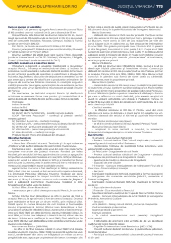 WWW.GHIDULPRIMARIILOR.RO JUDE%u021aUL VRANCEA / 773Cum se ajunge in localitate:Principala rut%u0103 pentru a ajunge la Panciu este din punctul Ti%u0219i%u021ba (E 85) urm%u00e2nd drumul na%u021bional DN 2L pe o distan%u021b%u0103 de 13 kmOra%u0219ul Panciu este traversat de drumul na%u021bional DN 2L, care %u00eel leag%u0103 spre est de M%u0103r%u0103%u0219e%u0219ti unde se termin%u0103 %u00een DN 2) %u0219i spre nordvest de comunele Str%u0103oane, R%u0103coasa, C%u00e2mpuri, Soveja %u0219i Tulnici (unde se termin%u0103 %u00een DN 2D)Din DN 2L, la Panciu se ramific%u0103 DJ 205H %u0219i DJ 205BDrumul jude%u021bean DJ 205H duce spre nord la Movili%u021ba, P%u0103une%u0219ti %u0219i Pufe%u0219ti (unde se termin%u0103 %u00een DN 2)Drumul jude%u021bean DJ 205B duce spre sud la %u021aife%u0219ti, Bolote%u0219ti (unde se intersecteaz%u0103 cu DN 2D Odobe%u0219ti, V%u00e2rte%u0219coiu, C%u00e2rligele, Cote%u0219ti %u0219i Ureche%u0219ti (unde se termin%u0103 %u00een DN 2)Activitati economice si specifice zonei:Viticultura reprezint%u0103 o ocupa%u021bie tradi%u021bional%u0103 a locuitorilor ora%u0219ului Panciu, influen%u021ba ei resim%u021bindu-se direct %u0219i indirect %u00een economie, %u00een via%u021ba social%u0103 %u0219i cultural%u0103. Datorit%u0103 acestor dimensiuni se pot amenaja puncte de colectare %u015fi valorificare a strugurilor, fructelor, legumelor %u015fi silozurilor de depozitare a cerealelor, dar se pot amenaja %u015fi centre de valorificare a produselor animaliere. Se impune de asemenea folosirea intensiv%u0103, %u00een condi%u0163iile asigur%u0103rii calit%u0103%u0163ii %u015fi soiurilor de origine, a planta%u0163iilor de vie existente pentru producerea unor vinuri apreciate %u015fi recunoscute pe pia%u0163%u0103: vinurile de Panciu. De asemenea, pe teritoriul ora%u0219ului Panciu %u00ee%u0219i desf%u0103%u0219oar%u0103 activitatea numeroase firme care produc %u015fi comercializeaz%u0103 o gam%u0103 divers%u0103 de confec%u0163ii textile pentru copii, femei %u015fi barba%u0163i.Vinifica%u021bieIndustrie textil%u0103Industrie fin%u0103Firme reprezentative:SC DUSPI SERV PANCIU SRL - prest%u0103ri servicii publiceCOOP %u201cServirea Popula%u0163iei%u201d - confec%u0163ii %u015fi prest%u0103ri servicii me%u015fte%u015fug%u0103re%u015ftiSC Tricotton Junior SA - confec%u0163ii tricotajeSC Cristi Lory SRL - prelucrarea lemnului %u015fi de%u015feurilor din lemnSC Veritas SA - prelucrare produc%u0163ie viti-vinicol%u0103SC Viticom SRL - prelucrare produc%u0163ie viti-vinicol%u0103SC Altex Prod SRL - confec%u0163ii tricotajeProduse locale: Vin %u0219i alte produse din struguriObiective turistice:M%u0103n%u0103stirea Brazi%u2013 Paraclisul Sf%u00e2ntului Mucenic Teodosie %u015fi L%u0103ca%u015ful subteran %u201ePe%u015ftera%u201d unde au fost descoperite osemintele mucenicului.M%u0103n%u0103stirea Brazi %u2013 aceasta este unul din cele mai importante complexe monahale din jude%u0163ul Vrancea. Fondat%u0103 pe Valea Haulitei, prin secolul al XVI%u2013lea, a%u015fez%u0103m%u00e2ntul a cunoscut apogeul %u00een timpul fostului mitropolit Teodosie al II%u2013lea (1674%u20131675) al Moldovei. Acesta din urm%u0103 s-a retras la Brazi %u00een 1675 %u015fi a transformat fostul schit Crucea (cum se numea %u00een acele vremuri) %u00eentr-o m%u0103n%u0103stire cu metocuri %u015fi propriet%u0103%u0163i %u00een toate localit%u0103%u0163ile vecine.A%u015fez%u0103m%u00e2ntul monahal a fost desfiin%u0163at %u00een 1959 %u015fi redeschis %u00een 1990, c%u00e2nd totul era o ruin%u0103. A fost reconstruit%u0103 capela subteran%u0103, s-a amenajat Paraclisul Sf%u00e2ntului Mucenic Teodosie ale c%u0103rui moa%u015fte s-au descoperit %u00een timpul lucr%u0103rilor de restaurare, s-a restaurat %u015fi l%u0103ca%u015ful subteran cunoscut sub numele de %u201ePe%u015ftera%u201d care a ad%u0103postit osemintele mucenicului Teodosie %u015fi este finalizat%u0103 construc%u0163ia unei noi biserci.Schitul Sf%u00e2ntul Ioan Botez%u0103torul%u2013 este a%u0219ezat pe o colin%u0103 deasupra ora%u0219ului Panciu, %u00een cartierul Neicu.Schitul Sf%u00e2ntul loan Botez%u0103torul se afl%u0103 %u00een partea de Vest a ora%u0219ului Panciu, la aproximativ 2 km de centrul ora%u0219ului. Drumul spre m%u0103n%u0103stire se face pe un drum mirific, prin mijlocul viilor. Odat%u0103 ajun%u0219i %u00een curtea l%u0103ca%u0219ului de cult lini%u0219tea %u0219i frumuse%u021bea locului impresioneaz%u0103. Schitul Sf%u00e2ntul Ioan Botez%u0103torul a fost unul dintre schiturile M%u0103n%u0103stirii Brazi. Acest schit a fost %u00eentemeiat %u00eentre anii 1826%u20131828 de c%u0103tre Dimitrie, stare%u021bul M%u0103n%u0103stirii Brazi. %u00cen anul 1894, schitului i se zide%u0219te %u0219i o biseric%u0103 de zid, al%u0103turi de cea de lemn. Schitul este desfiin%u021bat %u00een anul 1960, fiind re%u00eenfiin%u021bat %u00een anul 1999. Sf%u00e2ntul Ioan Botez%u0103torul este ocrotitorul schitului unde slujesc cinci m%u0103icu%u021beMonumentul Eroilor (1916%u20131918)%u2013 se afl%u0103 %u00een centrul ora%u015fului ridicat %u00een anul 1928 fiind crea%u0163ia sculptorului Ion C. Dimitriu (1832%u20131908). Se prezint%u0103 sub forma unei statui %u201eronde-bosse%u201d din bronz ce %u00eenf%u0103%u0163i%u015feaz%u0103 un militar cu arma preg%u0103tit%u0103 de atac, a%u015fezat pe un piedestal din beton. Un meplat din bronz red%u0103 o scen%u0103 de lupt%u0103. Acest monument aminte%u015fte de cei 56 p%u0103nceni c%u0103zu%u0163i %u00een luptele R%u0103zboiului de %u00centregire a Neamului.Beciul Domnesc%u2013 dateaz%u0103 din secolul al XVIII%u2013lea dar primele men%u0163iuni scrise sunt din secolul al XVI%u2013lea, c%u00e2nd Domnul Petru %u015echiopu %u00eei %u00eent%u0103rea lui Bucium, mare vornic al %u0162%u0103rii de Jos, st%u0103p%u00e2nirea pe viile din zon%u0103. S%u0103pate la 24 m ad%u00e2ncime, au fost descoperite %u00eent%u00e2mpl%u0103tor %u00een anul 1952. Din galeria principal%u0103 care m%u0103soar%u0103 500 m pleac%u