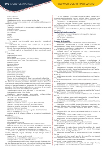Colocvii literareLans%u0103ri de carteSlujb%u0103 de pomenire la morm%u00e2ntul scriitorului13 Mai - Concurs Interjude%u021bean de art%u0103 tradi%u021bional%u0103 Descoperim tradi%u021bia strabun%u0103- Sec%u021biuni:Tapiserie %u2013 tradi%u021bional%u0103, %u00een p%u0103r de capr%u0103, noduri %u0219i ornamental%u0103M%u0103rturii cre%u0219tineIcoane pe sticl%u0103 %u0219i pe lemnArt%u0103 plastic%u0103DesenColajePictur%u0103Ou%u0103 %u00eencondeiate- %u00cen cadrul evenimentului sunt premia%u021bi c%u00e2%u0219tig%u0103torii concursului- Festivitatea de premiere este urmat%u0103 de un spectacol sus%u021binut de tinere talente locale21 mai - Concursul Na%u021bional de Dans Sportiv Cupa Alexander%u031b s- Particip%u0103: copii de la cluburi/%u0219coli de dans sportiv din toat%u0103 %u021bara- Sec%u021biuni:Majorete (Pom-pon)Balet (polka)Dans sportiv latino (samba, cha-cha, rumba)Dans modern (Mika Sova, Disco, Ding-dong, Labyrinth)Folclor na%u021bionalDans cu obiecteMTV ComercialFantezie coregrafic%u0103Dans de caracterShow dance Dance streetGimnastic%u0103 Dans tematicLatino show (bachata)Dans clasic Lyrical Folclor stilizat1 Iunie - Universul Copil%u0103riei - Ziua Interna%u021bional%u0103 a CopiluluiSpectacolul Universul Copil%u0103riei parada personajelor %u00eendr%u0103gite din desenele animate; momente artistice sus%u021binute de tinere talente locale; demonstra%u021bie de karate; majorete %u0219i mini majorete; c%u00e2ntece %u0219i dansuri populare; personaje din desenele animate pictur%u0103 pe fa%u021b%u0103 (face painting); baloane; momente de anima%u021bie; %u00eentreceri %u0219i concursuri amuzante; jocuri sportiveTurneul de Fotbal Un viitor mai sigur, s%u0103 fim mai buni!In%u0103l%u021barea Domnului - Ziua Eroilor Manifest%u0103ri comemorative: ceremonial militar-religios; depuneri de coroane %u00een cinstea eroilor neamului24 Iunie - Ziua Iei- S%u00e2nzienele %u0218ez%u0103toare %u00een aer liberC%u00e2ntece %u0219i dansuri populare%u00cen fiecare duminic%u0103 din luna august - Zilele Colorate- Proiect cultural dedicat copiilor de toate v%u00e2rsteleMomente artistice sus%u021binute de tinere talente localeC%u00e2ntece %u0219i dansuri populareMomente de anima%u021bie cu personaje din desene animatePictur%u0103 pe fa%u021b%u0103 (facepainting)Ateliere de arte vizuale (%u021bes%u0103turi %u0219i impletituri tradi%u021bionale; pictur%u0103 etc.)Jocuri interactiveConcursuri distractive%u00centreceri sportiveAlte activit%u0103%u021bi recreativeSeptembrie - Festivalul de Teatru T%u00e2n%u0103r Ora de TeatruFestival unic %u00een %u021bar%u0103, prin dinamica activit%u0103%u021bilor incluse %u00een program: spectacole de teatru, ateliere de teatru, concerte de muzic%u0103, %u00eent%u00e2lniri cu personalit%u0103%u021bi ale teatrului rom%u00e2nesc, etc- Festivalul se desf%u0103%u0219oar%u0103 concomitent %u00een localit%u0103%u021bile: Panciu, Foc%u015fani, Odobe%u0219ti, Adjud, M%u0103r%u0103%u0219e%u0219ti, Pufe%u0219ti, Soveja, Vidra %u015fi Vizantea LiveziSeptembrie - %u00cen parc, fanfara c%u00e2nt%u0103Concertul de Muzicii Militare a Garnizoanei Foc%u0219ani22 Septembrie - Hramul M%u0103n%u0103stirii Brazi- S%u0103rb%u0103toare dedicat%u0103 Sf%u00e2ntului Sfin%u021bit Mucenic Teodosie al II%u2013lea, fost Episcop de Roman %u0219i Mitropolit al Moldovei, considerat ctitorul m%u0103n%u0103stirii %u0219i ocrotitorul spiritual al ora%u0219ului Panciu- %u00cen ziua de Hram, un numeros sobor de preo%u021bi, %u00eempreun%u0103 cu Arhiepiscopul Buz%u0103ului %u0219i Vrancei, oficiaz%u0103 Sf%u00e2nta Liturghie, care este precedat%u0103 de Acatistul Asf. Ierarh Mucenic Teodosie al II%u2013lea1 Decembrie - Ziua Na%u021bional%u0103 a Rom%u00e2nieiManifest%u0103ri dedicate Zilei Na%u021bionale a Rom%u00e2niei %u0219i Marii Uniri de la 1 Decembrie 1918: comemor%u0103ri, evoc%u0103ri istorice, ceremonial militar-religios Decembrie - Concert de colinde, datini %u0219i tradi%u021bii de Cr%u0103ciun %u0219i Anul NouFacilit%u00e3%u0163i oferite investitorilor:Posibilitatea %u00eenchieierii de parteneriate publice %u0219i privateAsigurarea de utilit%u0103%u021biLOCALIT%u0102%u021aILE %u00ceNFR%u0102%u021aITE Arbois- Fran%u021baProiecte de investi%u0163ii:Sunt %u00een implementare urm%u0103toarele proiecte de investi%u021bii:Reabilitare, modernizare %u0219i dotare c%u0103mine culturale din cartierele Neicu %u0219i Satu Nou - ora%u0219 Panciu, jude%u021bul VranceaExtinderea, reabilitarea, modernizarea %u0219i dotarea Casei de Cultur%u0103, ora%u0219 Panciu, jude%u021bul Vrancea%u00cenfiin%u021bare centru de diagnostic %u00een cadrul ambulatoriului integrat al Spitalului Orasenesc Panciu%u00cenfiin%u021bare centru de tineret PanciuModernizarea %u0219i extinderea sistemului de iluminat public stradal %u00een ora%u0219ul Panciu, jude%u021bul VranceaDotarea compartimentului Prevenire, marginalizare %u0219i excluziune social%u0103 din cadrul Direc%u021biei de Asisten%u021b%u0103 Social%u0103 PanciuModernizare Aleea Independen%u021bei, ora%u0219ul Panciu, jude%u021bul VranceaS-au depus la finan%u021bare, prin PNRR, urmtoarele proiecte:Reabilitarea termic%u0103%u00a0a blocuri de locuin%u021be din ora%u0219ul Panciu %u2013 etapa VI (bl. 9A si 9B str. Titu Maiorescu)Reabilitarea termic%u0103%u00a0a blocuri de locuin%u021be din ora%u0219ul Panciu %u2013 etapa VIIReabilitarea termic%u0103%u00a0a blocuri de locuin%u021be din ora%u0219ul Panciu %u2013 etapa VIIIReabilitarea termic%u0103%u00a0a blocuri de locuin%u021be din ora%u0219ul Panciu %u2013 etapa IX.Reabilitarea %u0219i modernizarea Spitalului Or%u0103%u0219enesc PanciuReabilitarea %u0219i modernizarea institu%u021biilor publice, Liceul Teoretic %u201dIoan Slavici%u201d %u0219i Liceul Tehnologic %u201dAlexandru Ioan Cuza%u201d, ora%u0219 Panciu, jude%u021b VranceaReabilitarea, modernizarea %u0219i extinderea sediului ISU %u201dAnghel Saligny%u201d Vrancea %u2013 Punct de lucru PanciuReabilitarea %u0219i modernizarea sediului SAJ Vrancea - Substatia P