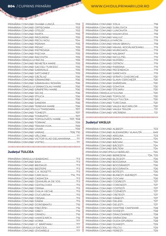 804 / CUPRINS PRIM%u0102RII WWW.GHIDULPRIMARIILOR.ROPRIM%u00c3RIA COMUNEI OHABA LUNG%u00c3.......................................703PRIM%u00c3RIA COMUNEI ORTI%u0218OARA ...............................................703PRIM%u00c3RIA COMUNEI OTELEC.........................................................703PRIM%u00c3RIA COMUNEI PAR%u021aA............................................................705PRIM%u00c3RIA COMUNEI P%u00c3DURENI..................................................705PRIM%u00c3RIA COMUNEI PECIU NOU............................................... 704PRIM%u00c3RIA COMUNEI PERIAM.........................................................705PRIM%u00c3RIA COMUNEI PESAC............................................................705PRIM%u00c3RIA COMUNEI PIETROASA ................................................705PRIM%u00c3RIA COMUNEI PI%u0218CHIA........................................................705PRIM%u00c3RIA COMUNEI RACOVI%u021aA ...................................................705PRIM%u00c3RIA ORA%u0218ULUI RECA%u0218 ..........................................................705PRIM%u00c3RIA COMUNEI REMETEA MARE.....................................705PRIM%u00c3RIA COMUNEI SACO%u0218U TURCESC................................705PRIM%u00c3RIA COMUNEI SARAVALE...................................................705PRIM%u00c3RIA COMUNEI SATCHINEZ ................................................705PRIM%u00c3RIA COMUNEI S%u00c3C%u00c3LAZ......................................................706PRIM%u00c3RIA COMUNEI S%u00c2NANDREI...............................................706PRIM%u00c3RIA COMUNEI S%u00c2NMIHAIU ROM%u00c2N...........................706PRIM%u00c3RIA ORA%u0218ULUI S%u00c2NNICOLAU MARE ..........................706PRIM%u00c3RIA COMUNEI S%u00c2NPETRU MARE..................................706PRIM%u00c3RIA COMUNEI SECA%u0218............................................................706PRIM%u00c3RIA COMUNEI STIUCA ..........................................................706PRIM%u00c3RIA COMUNEI %u0218AG..................................................................706PRIM%u00c3RIA COMUNEI %u0218ANDRA.......................................................706PRIM%u00c3RIA COMUNEI TEREMIA MARE ......................................706PRIM%u00c3RIA MUNICIPIULUI TIMI%u0218OARA......................................707PRIM%u00c3RIA COMUNEI TOME%u0218TI.......................................................707PRIM%u00c3RIA COMUNEI TOMNATIC..................................................707PRIM%u00c3RIA COMUNEI TOPOLOV%u00c3%u021aU MARE................707, 708PRIM%u00c3RIA COMUNEI TORMAC.......................................................709PRIM%u00c3RIA COMUNEI TRAIAN VUIA.............................................709PRIM%u00c3RIA COMUNEI UIVAR.............................................................709PRIM%u00c3RIA COMUNEI VARIA%u0218................................................709, 710PRIM%u00c3RIA COMUNEI V%u00c3LCANI.........................................................711PRIM%u00c3RIA COMUNEI VICTOR VLAD DELAMARINA...........711PRIM%u00c3RIA COMUNEI VOITEG............................................................711Jude%u021bul TULCEAPRIM%u00c3RIA ORA%u0218ULUI BABADAG...................................................713PRIM%u00c3RIA COMUNEI BAIA.................................................................713PRIM%u00c3RIA COMUNEI BEIDAUD......................................................713PRIM%u00c3RIA COMUNEI BE%u0218TEPE.......................................................713PRIM%u00c3RIA COMUNEI C.A. ROSETTI..............................................713PRIM%u00c3RIA COMUNEI CARCALIU..........................................714, 715PRIM%u00c3RIA COMUNEI CASIMCEA ...................................................713PRIM%u00c3RIA COMUNEI CEAMURLIA DE JOS.............................713PRIM%u00c3RIA COMUNEI CEATALCHIOI ............................................715PRIM%u0102RIA COMUNEI CERNA............................................................715PRIM%u00c3RIA COMUNEI CHILIA VECHE...........................................715PRIM%u00c3RIA COMUNEI CIUCUROVA ...............................................715PRIM%u00c3RIA COMUNEI CRI%u0218AN...........................................................715PRIM%u00c3RIA COMUNEI D%u00c3ENI.............................................................715PRIM%u00c3RIA COMUNEI DOROBAN%u021aU ............................................716PRIM%u00c3RIA COMUNEI FREC%u00c3%u021aEI......................................................716PRIM%u00c3RIA COMUNEI GRECI..............................................................716PRIM%u00c3RIA COMUNEI GRINDU.........................................................716PRIM%u00c3RIA COMUNEI HAMCEARCA.............................................716PRIM%u00c3RIA COMUNEI HORIA.............................................................717PRIM%u00c3RIA COMUNEI I.C. BR%u00c3TIANU............................................717PRIM%u00c3RIA ORA%u0218ULUI ISACCEA.......................................................717PRIM%u00c3RIA COMUNEI IZVOARELE .................................................717PRIM%u00c3RIA COMUNEI JIJILA...............................................................718PRIM%u00c3RIA COMUNEI JURILOVCA .................................................718PRIM%u00c3RIA COMUNEI LUNCAVI%u021aA .................................................718PRIM%u00c3RIA COMUNEI MAHMUDIA................................................718PRIM%u00c3RIA COMUNEI MALIUC..........................................................719PRIM%u00c3RIA ORA%u0218ULUI M%u00c3CIN...........................................................719PRIM%u00c3RIA COMUNEI MIHAI BRAVU............................................718PRIM%u00c3RIA COMUNEI MIHAIL KOG%u00c3LNICEANU...................719PRIM%u00c3RIA COMUNEI MURIGHIOL................................................719