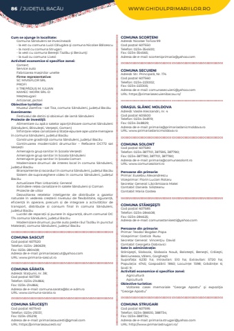 86 / JUDE%u021aUL BAC%u0102U WWW.GHIDULPRIMARIILOR.ROCum se ajunge in localitate:Comuna S%u0103nduleni se %u00eenvecineaz%u0103:- la est cu comuna Luizi C%u0103lug%u0103ra %u015fi comuna Nicolae B%u0103lcescu- la nord cu comuna Strugari- la vest cu comuna Bere%u015fti Tazl%u0103u %u015fi Berzun%u0163i - la sud cu comuna LiveziActivitati economice si specifice zonei:Comer%u021bService autoFabricarea ma%u0219inilor unelteFirme reprezentative:SC MIVISFLOR SRLPROFIII TREP%u0102DU%u0218 M. IULIANKAMEC WORK SRL-DMe%u0219te%u0219ugari: Artizanat, pictoriObiective turistice:Muzeul Zamfira %u2013 sat Tisa, comuna S%u0103nduleni, jude%u021bul Bac%u0103uEvenimente:Festivalul de datini %u0219i obiceiuri de iarn%u0103 S%u0103nduleniProiecte de investi%u0163ii:Alimentare cu ap%u0103 a satelor apar%u0163in%u0103toare comunei S%u0103nduleni (S%u0103nduleni, B%u00eerzule%u015fti, Ver%u015fe%u015fti, Coman)%u00cenfiin%u021bare re%u021bea canalizare %u0219i Sta%u021bie epurare ape uzate menajere %u00een comuna S%u0103nduleni, jude%u021bul Bac%u0103uConstruire gradini%u0163%u0103 comuna S%u0103nduleni, jude%u0163ul Bac%u0103uContinuarea moderniz%u0103rii drumurilor %u2013 Refacere DC172 sat Ver%u0219e%u0219tiAmenajara grup sanitar %u00een %u0218coala Ver%u0219e%u0219tiAmenajare grup sanitar %u00een Scoala S%u0103nduleniAmenajare grup sanitar %u00een %u0218coala ComanModernizare drumuri de interes local %u00een comuna S%u0103nduleni, jude%u021bul Bac%u0103uBran%u0219amente %u0219i racorduri %u00een comuna S%u0103nduleni, jude%u021bul Bac%u0103uSistem de supraveghere video %u00een comuna S%u0103nduleni, jude%u021bul Bac%u0103uActualizare Plan Urbanistic GeneralExtindere re%u021bea canalizare %u00een satele S%u0103nduleni %u0219i ComanProiecte de viitorDezvoltarea re%u021belelor inteligente de distribu%u021bie a gazelor naturale %u00een vederea cre%u0219terii nivelului de flexibilitate, siguran%u021b%u0103, eficien%u021b%u0103 %u00een operare, precum %u0219i de integrare a activit%u0103%u021bilor de transport, distribu%u021bie %u0219i consum final %u00een comuna S%u0103nduleni, jude%u021bul Bac%u0103uLucr%u0103ri de repara%u021bii %u0219i punere %u00een siguran%u021b%u0103, drum comunal DC 174 comuna S%u0103nduleni, jude%u021bul Bac%u0103uModernizare drumuri, punte auto peste r%u00e2ul Tazl%u0103u %u00een punctul Mateie%u0219ti, comuna S%u0103nduleni, jude%u021bul Bac%u0103uCOMUNA SASCUTCod po%u0219tal: 607520Telefon: 0234- 280639; Fax: 0234-280408; Adresa de e-mail: primariasascut@yahoo.comURL: www.primaria-sascut.roCOMUNA S%u0102RATAAdres%u0103: Sta%u0163iunii, nr. 38; Cod po%u0219tal: 607361Telefon: 0234-214866; Fax: 0234-214866; Adresa de e-mail: comuna.sarata@bc.e-adm.roURL: www.comuna-sarata.roCOMUNA S%u0102UCE%u015eTICod po%u0219tal: 607540Telefon: 0234-215131; Fax: 0234-215218; Adresa de e-mail: primariasaucesti@gmail.comURL: https://primariasaucesti.ro/COMUNA SCOR%u0162ENIAdres%u0103: Nicolae Toniza 99Cod po%u0219tal: 607550Telefon: 0234-354500; Fax: 0234-354565; Adresa de e-mail: scorteniprimaria@yahoo.comCOMUNA SECUIENIAdres%u0103: Str. Principal%u0103, Nr. 174Cod po%u0219tal: 607560Telefon: 0234-223002; Fax: 0234-223305; Adresa de e-mail: comunasecuieni@yahoo.comURL: https://primariasecuienibacau.ro/ORA%u0218UL SL%u0102NIC MOLDOVAAdres%u0103: Vasile Alecsandri, nr. 4Cod po%u0219tal: 605500Telefon: 0234-348119; Fax: 0234-348829; Adresa de e-mail: primaria@primariaslanicmoldova.roURL: www.primariaslanicmoldova.roCOMUNA SOLONTCod po%u0219tal: 607580Telefon: 0234-387701, 387595, 387780; Fax: 0234-387780, 387701, 387780; Adresa de e-mail: primaria@comunasolont.roURL: www.comunasolont.roPersoane din primarie:Primar: Eusebiu%u00a0AlexandrescuViceprimar:%u00a0Florin Lucian%u00a0Rotaru%u00a0Secretar General: L%u0103cr%u0103mioara%u00a0Matei%u00a0Contabil: Daniela%u00a0%u00a0Sili%u0219teanuContabil: Maria CosteaCOMUNA ST%u0102NI%u015eE%u015eTICod po%u0219tal: 607585Telefon: 0234-284608; Fax: 0234-284625; Adresa de e-mail: comunastanisesti@yahoo.comPersoane din primarie:Primar: Teodor Bogdan PopaViceprimar:%u00a0Costic%u0103%u00a0%u00a0RusuSecretar General:%u00a0 Vincen%u0163iu%u00a0%u00a0DavidContabil: Georgeta DobroviciSate %u00een administra%u021bie:St%u0103ni%u015fe%u015fti, Slobozia, Slobozia Nou%u0103, Balote%u015fti, Bene%u015fti, Cr%u0103ie%u015fti, Belciuneasa, V%u0103leni, Gorghe%u015ftiSuprafa%u021ba:%u00a0 6230 ha; Intravilan:%u00a0 510 ha; Extravilan:%u00a0 5720 ha; Popula%u021bia:%u00a0 4745; Gospod%u0103rii:%u00a0 1860; Locuin%u021be:%u00a0 1598; Gr%u0103dini%u021be:%u00a0 6; %u0218coli:%u00a09; Activitati economice si specifice zonei:Agricultur%u0103Apicultur%u0103Obiective turistice:Vizitarea casei memoriale %u201cGeorge Apostu%u201d %u015fi expozi%u0163ia %u201cGeorge Apostu%u201dCOMUNA STRUGARICod po%u0219tal: 607595Telefon: 0234-388510, 388734; Fax: 0234-388734; Adresa de e-mail: primaria.strugari@yahoo.comURL: http://www.primariastrugari.ro/